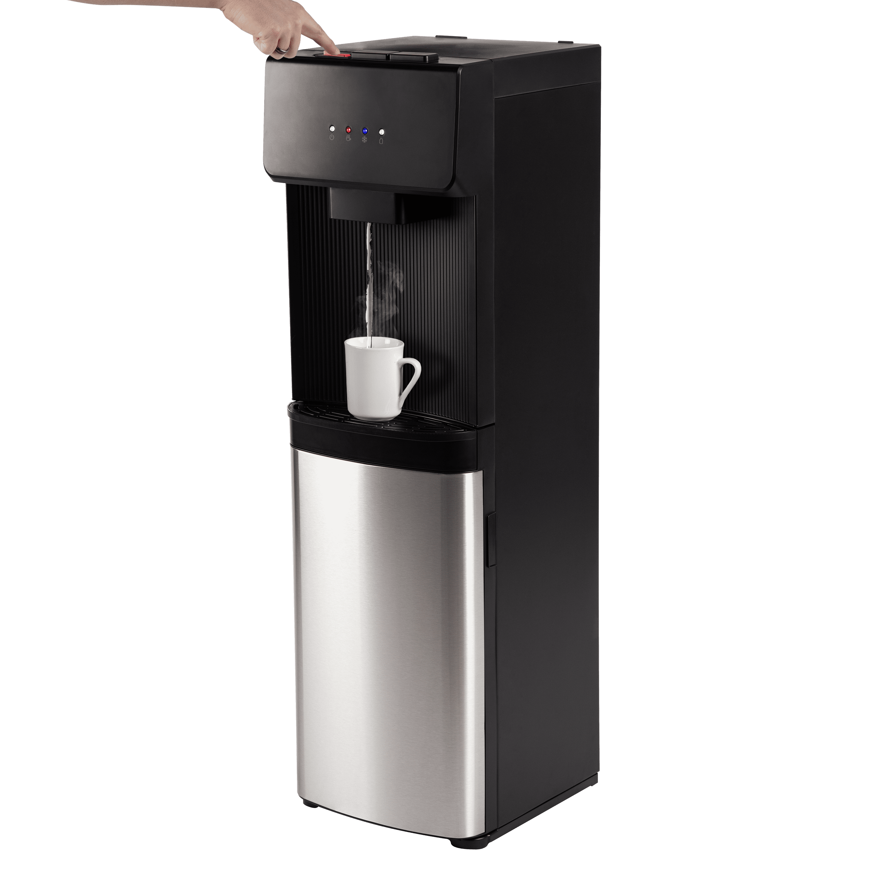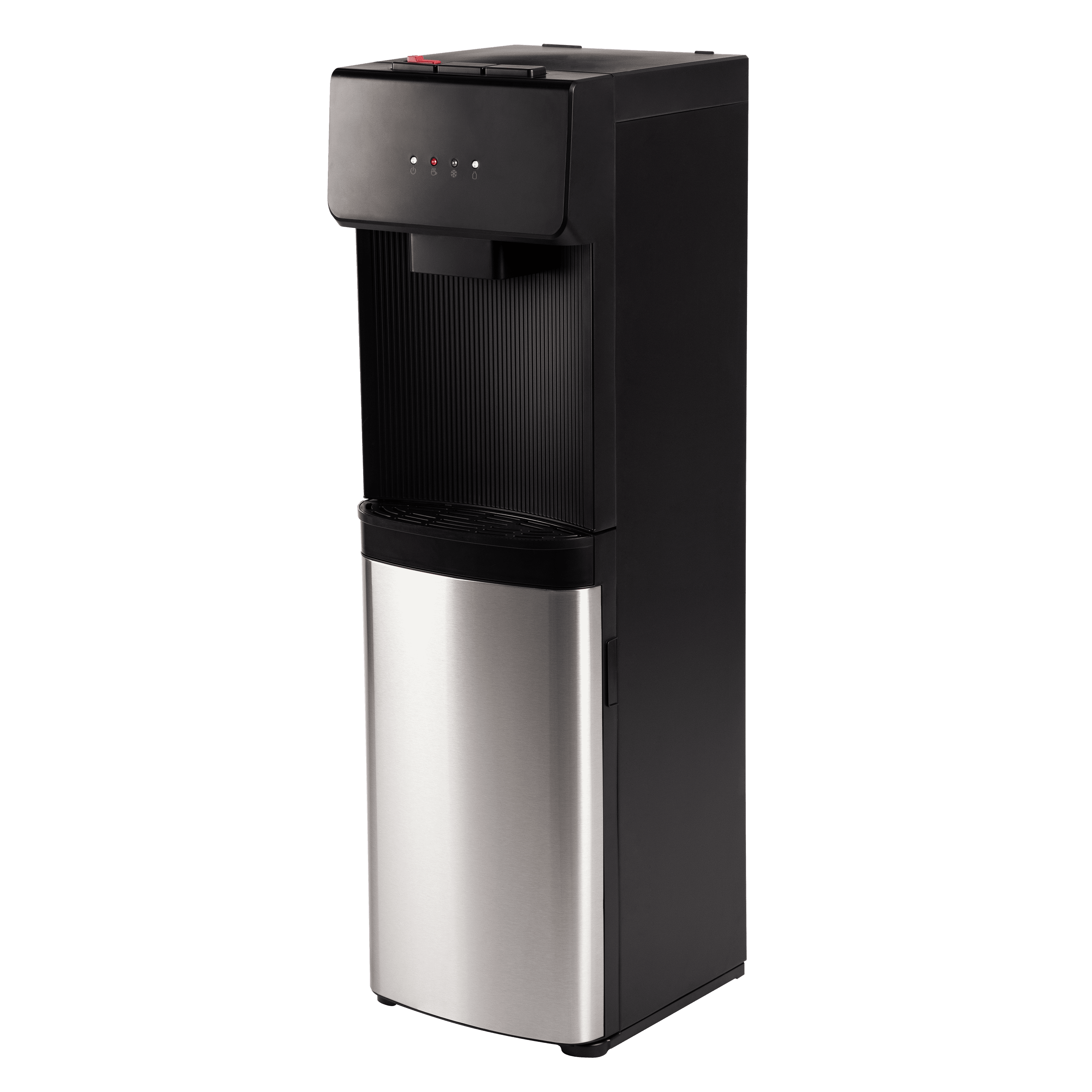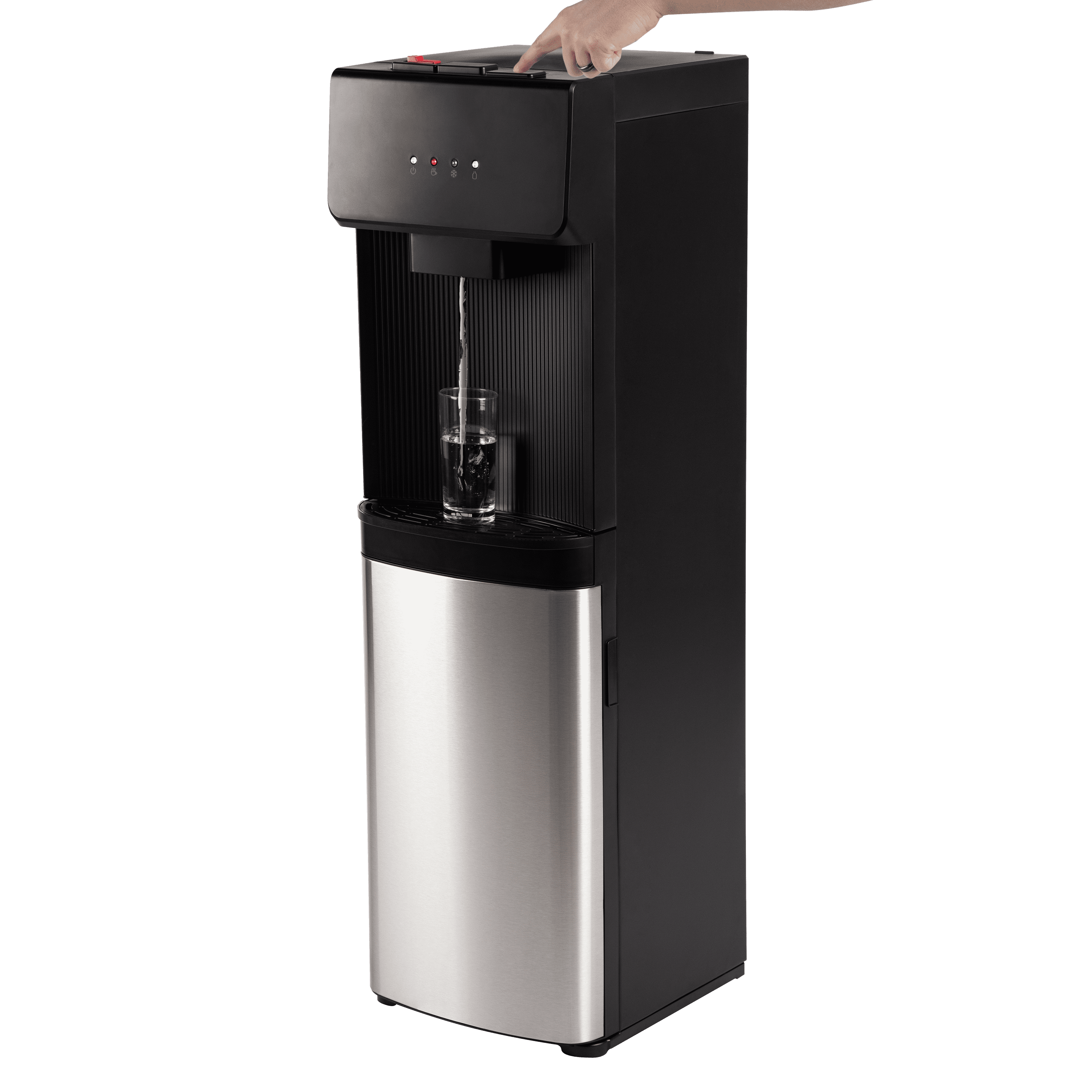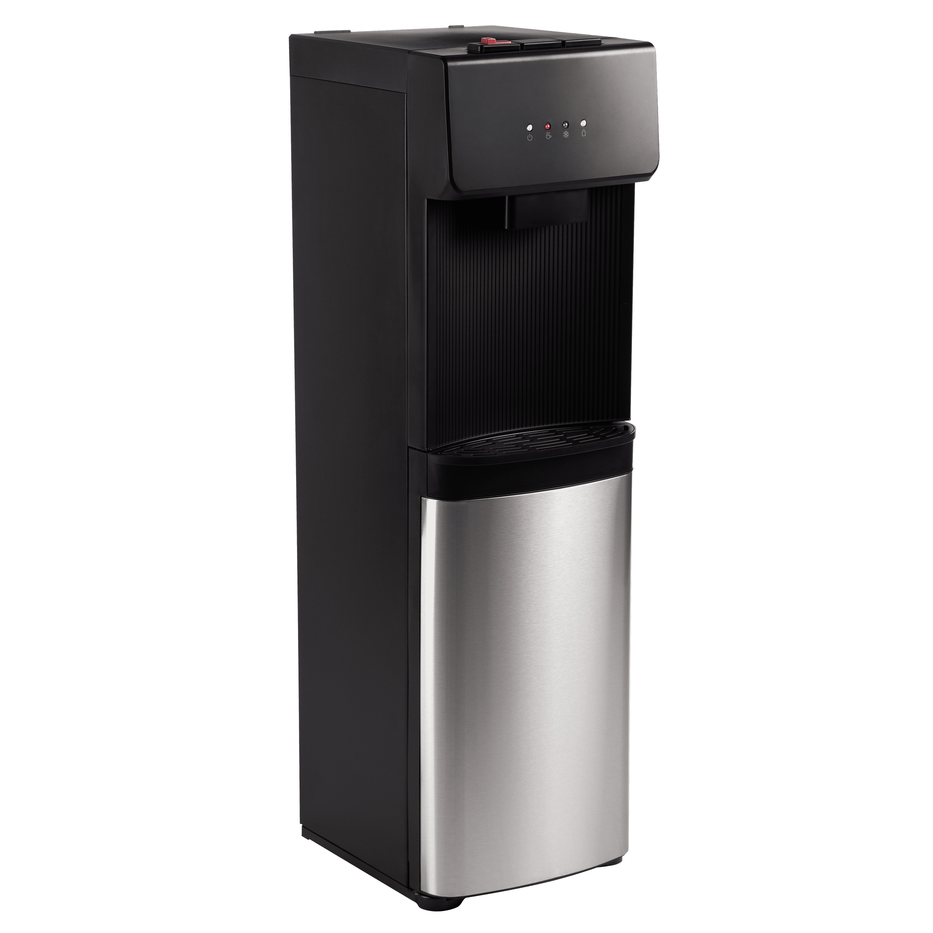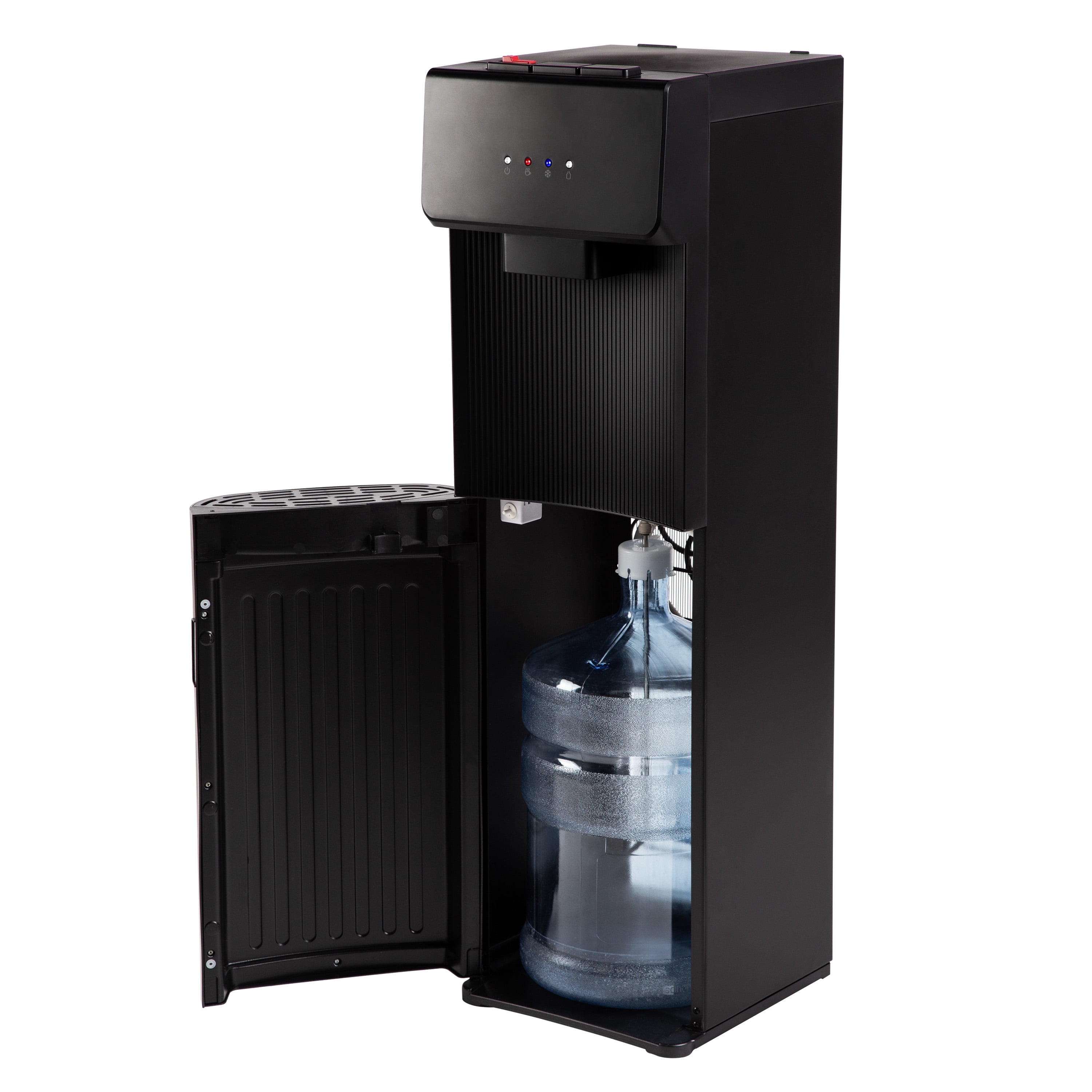 Great Value bottom load water dispenser Single spigot delivery system 3 Water temperatures: Hot 190-198° F, Cold 41-48° F, and Room Temperature A water bottle is stored in the lower cabinet – no more lifting heavy water bottles LED indicators notify you when the optimum water temperatures are reached, as well as when the water bottle needs replacing Hot water button includes a child safety lock to prevent accidental hot water dispensing Drinking water is stored in separate, stainless steel hot and cold reservoirs to prevent mineral buildup for better-tasting water High-efficiency compressor Removable drip tray is top-rack dishwasher-safe for easy cleaning Compatible with 3, 4, or 5-gallon water bottle jugs (sold separately) Energy Star compliant Freestanding water dispenser Rich, matte black finish with fingerprint-resistant stainless steel accents