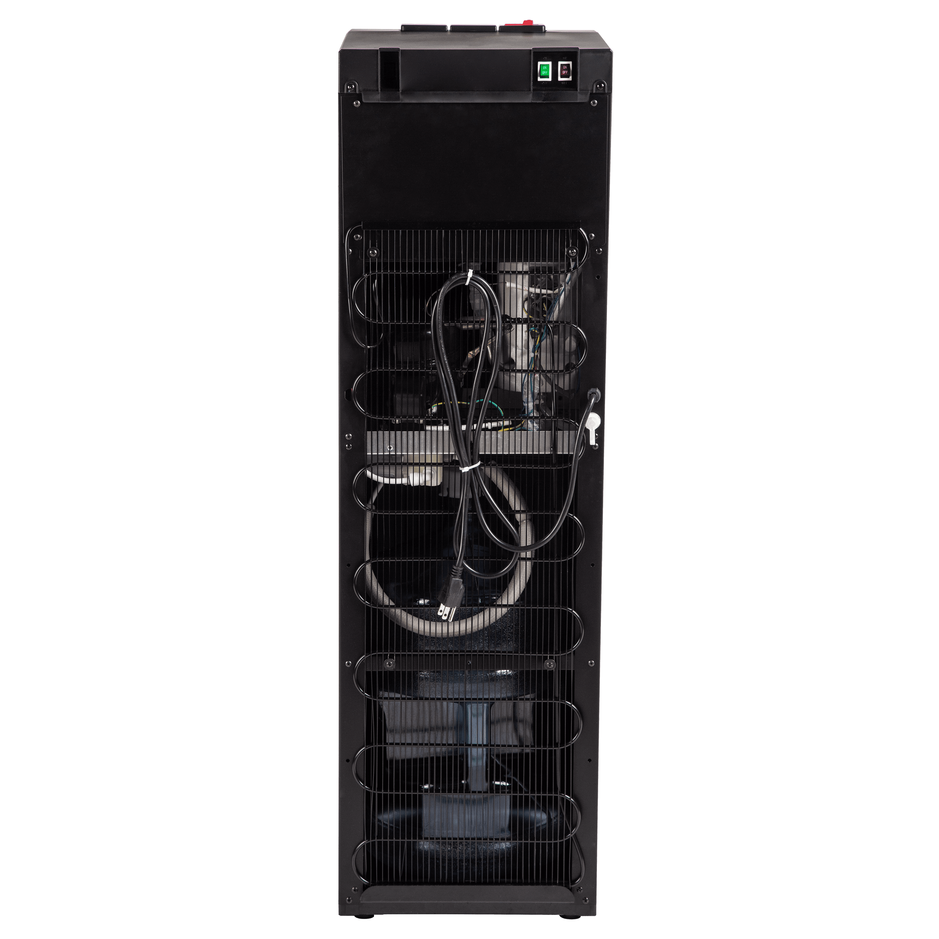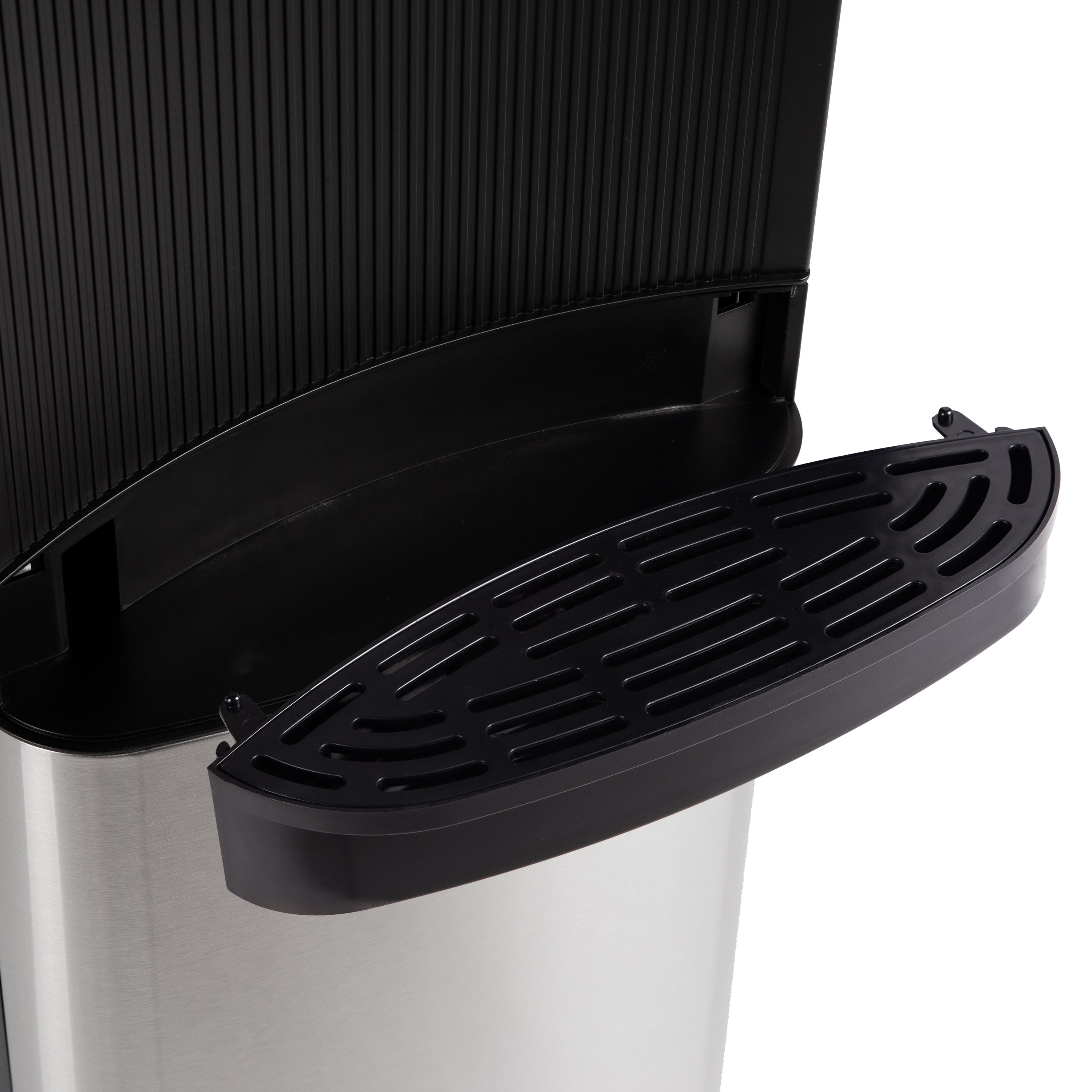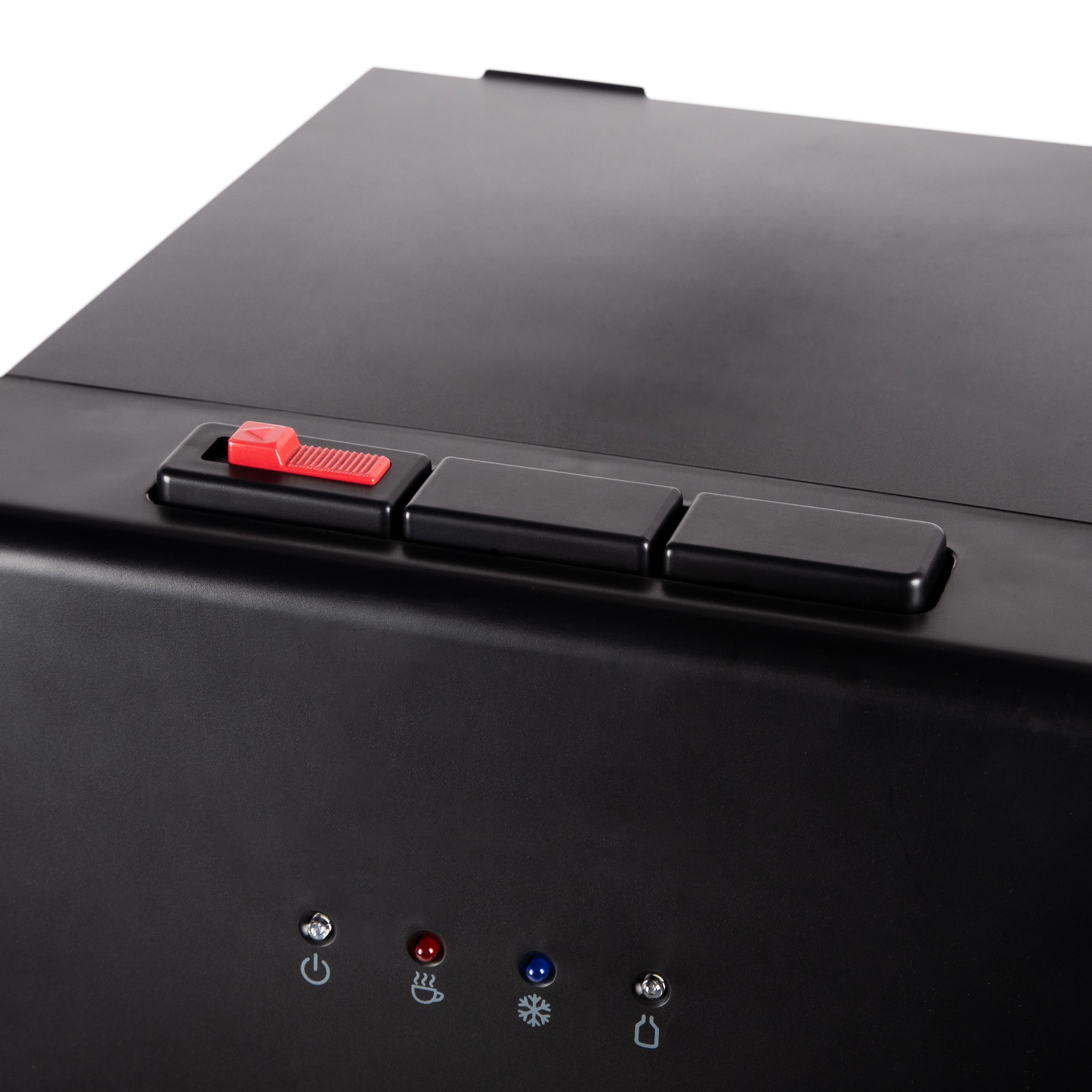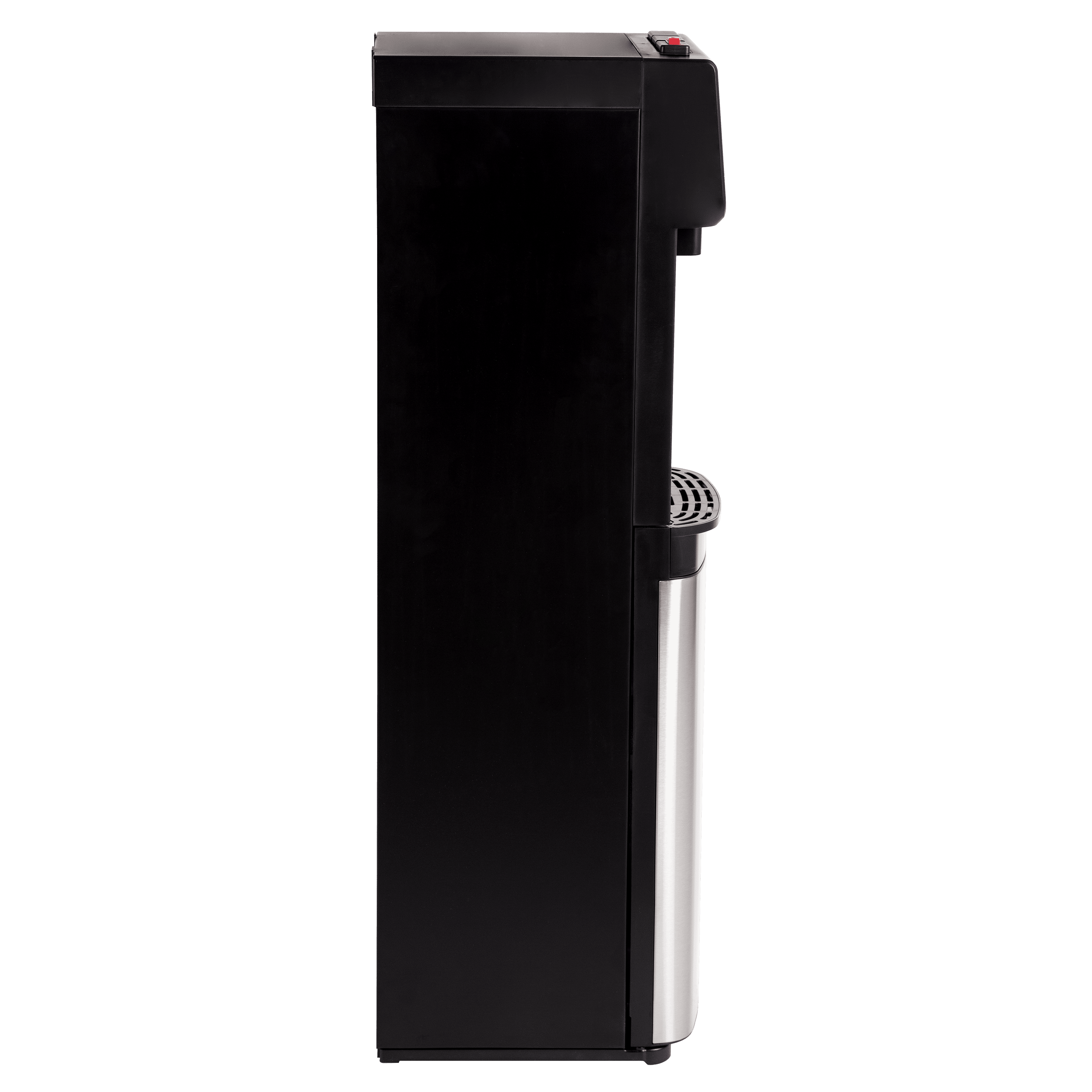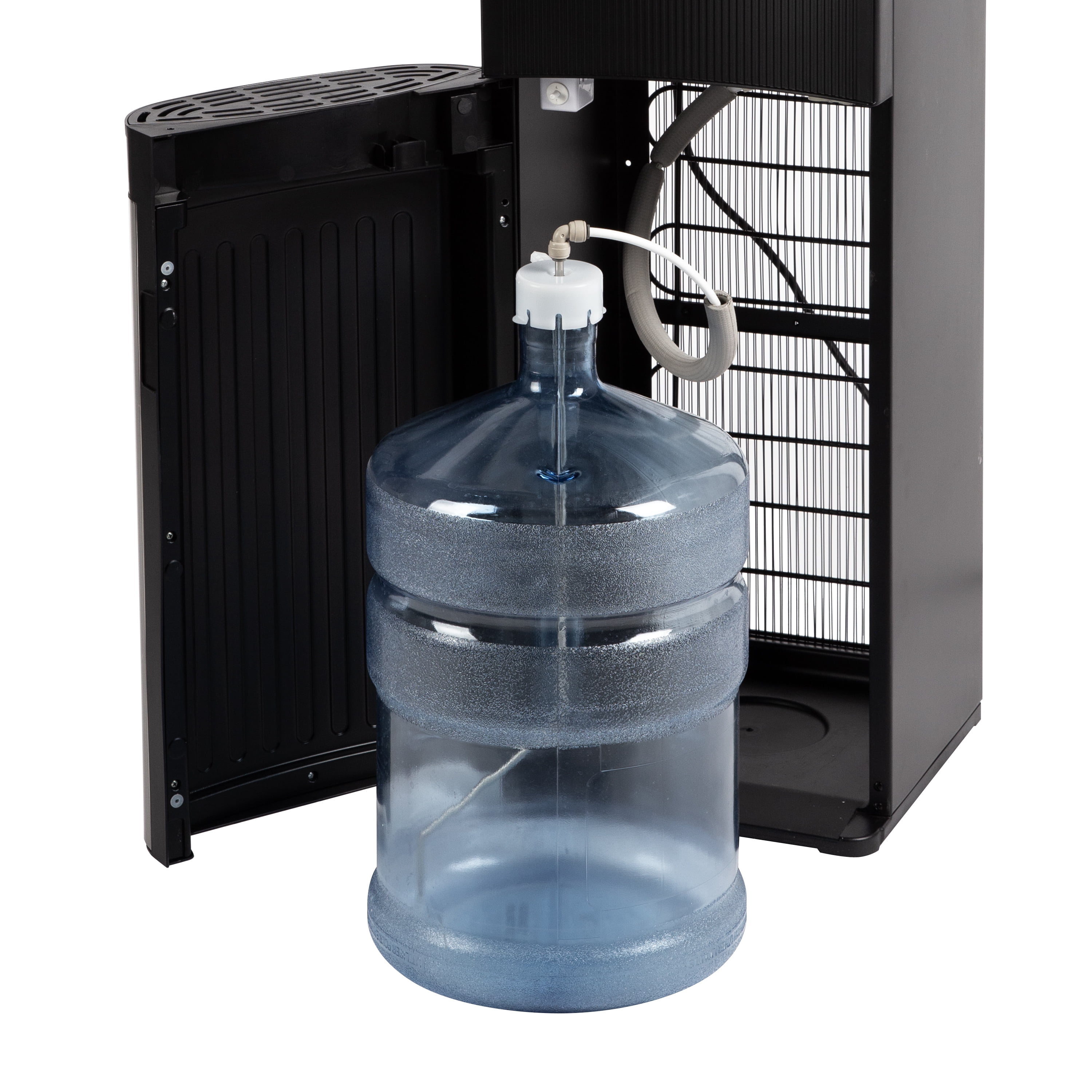 Great Value bottom load water dispenser Single spigot delivery system 3 Water temperatures: Hot 190-198° F, Cold 41-48° F, and Room Temperature A water bottle is stored in the lower cabinet – no more lifting heavy water bottles LED indicators notify you when the optimum water temperatures are reached, as well as when the water bottle needs replacing Hot water button includes a child safety lock to prevent accidental hot water dispensing Drinking water is stored in separate, stainless steel hot and cold reservoirs to prevent mineral buildup for better-tasting water High-efficiency compressor Removable drip tray is top-rack dishwasher-safe for easy cleaning Compatible with 3, 4, or 5-gallon water bottle jugs (sold separately) Energy Star compliant Freestanding water dispenser Rich, matte black finish with fingerprint-resistant stainless steel accents