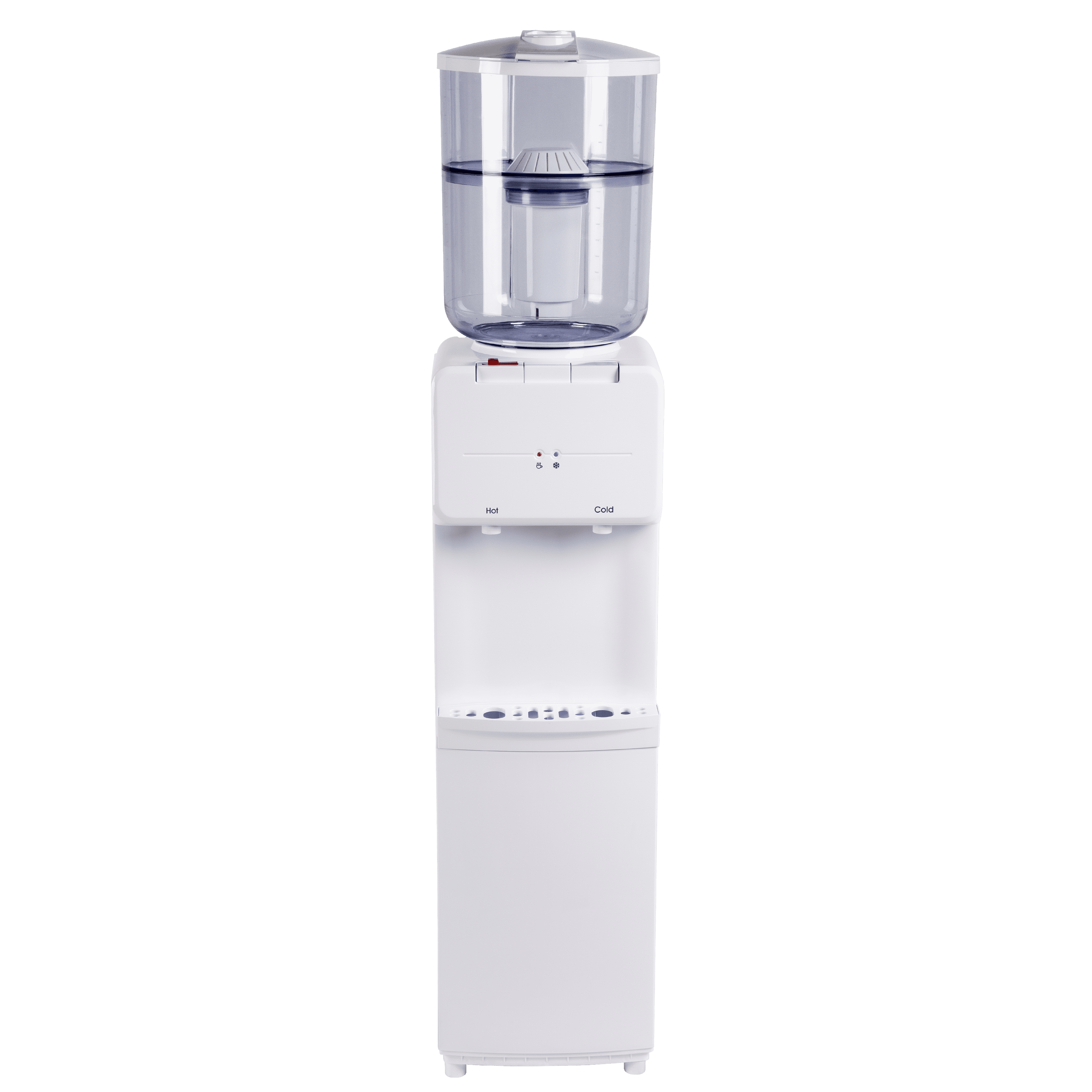 Quench your thirst with clean and refreshing drinking water from the freestanding Great Value Top Load Water Dispenser in white. This top load water dispenser will accommodate the eco-friendly Great Value GVRWFT Reusable Water Filtration Tank (sold separately), to get the crisp, clean taste of filtered water without buying bottles. Alternatively, this model is also compatible with standard 3, 4, or 5-gallon water bottles (sold separately). Simply secure your water jug of choice to the top of the water dispenser and enjoy hot water for coffee or cold water for lemonade. LED indicator lights activate when the optimum water temperature is ready for dispensing. This water dispenser is incorporated with an Energy Star compliant high-efficiency compressor and stainless steel reservoirs allowing this water cooler to provide great-tasting cold and hot water on demand. The hot water push button has a child safety lock for peace of mind, keeping kids safe while giving you your ideal temperature water and a removable drip tray for easy cleaning. 11″ D x 11.6″ W x 36.4″ H