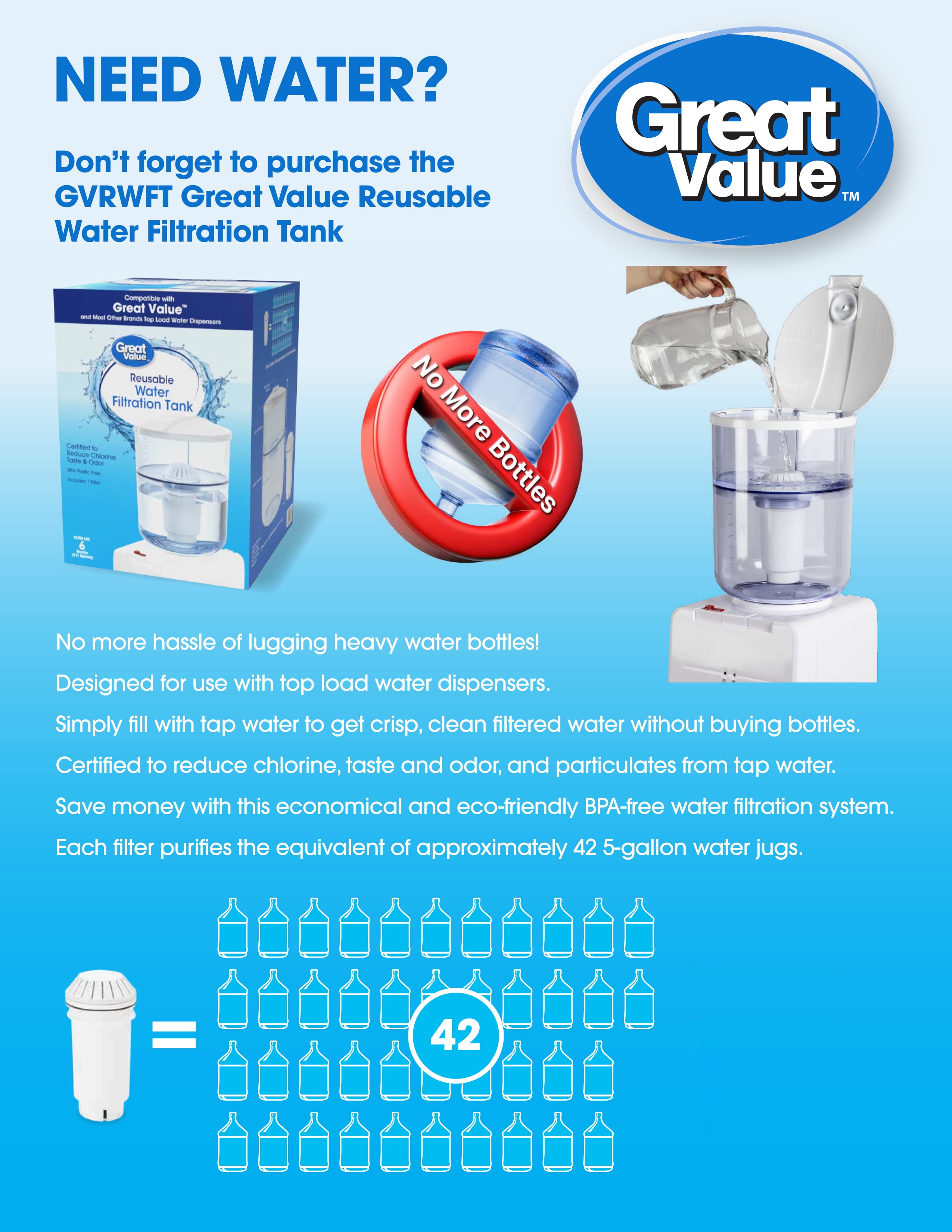 - Compatible with the Great Value GVRWFT Reusable Water Filtration Tank, or will accommodate 3, 4, or 5-gallon water bottle jugs (sold separately)