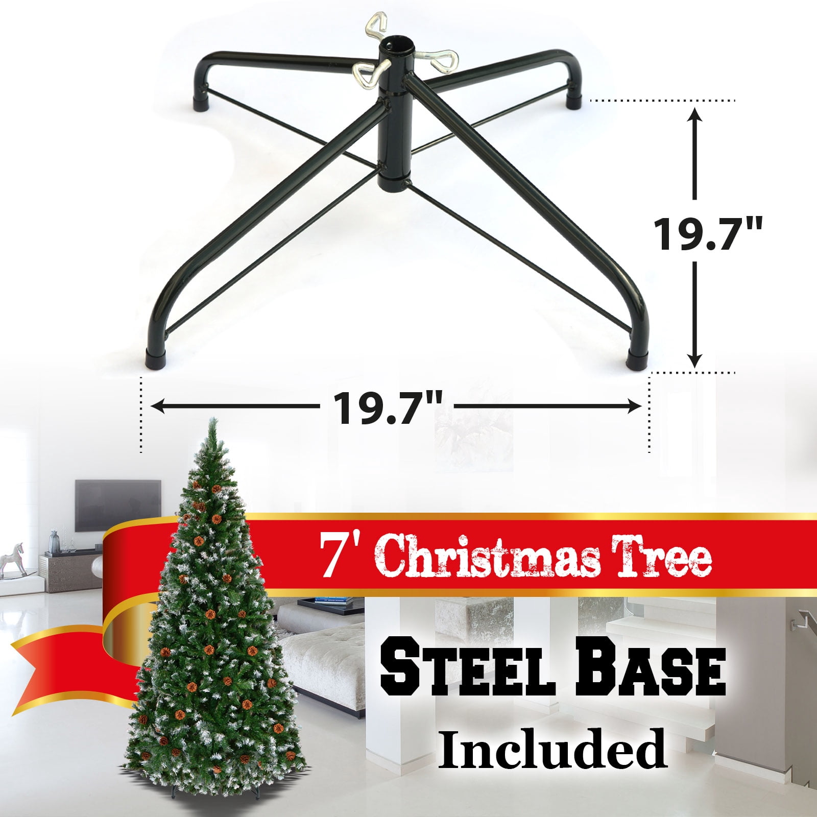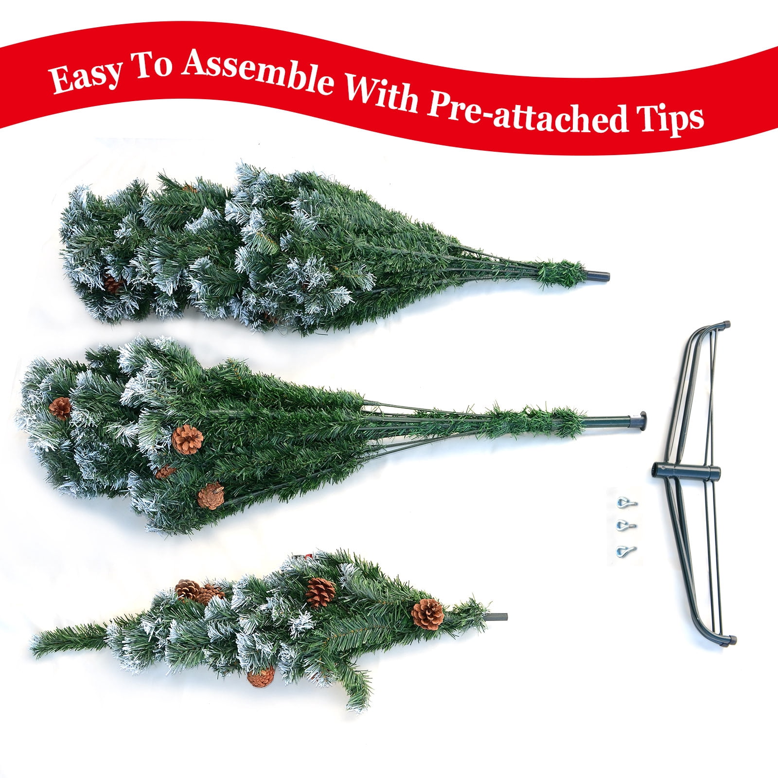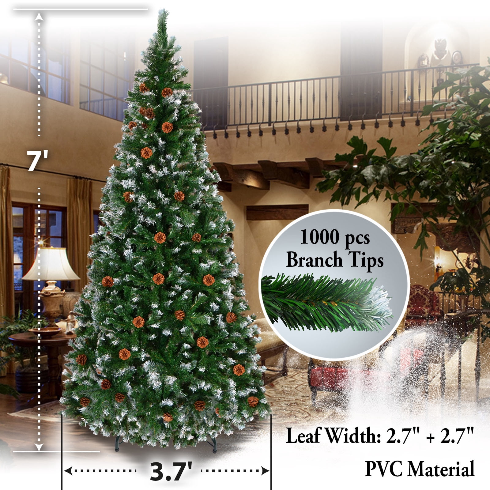 Green 7′ Snow Tipped Christmas Tree with pinecones Artificial Realistic Natural Branches -Unlit With Steel Stand (7′ with 1000 Tips and 38 pinecones)