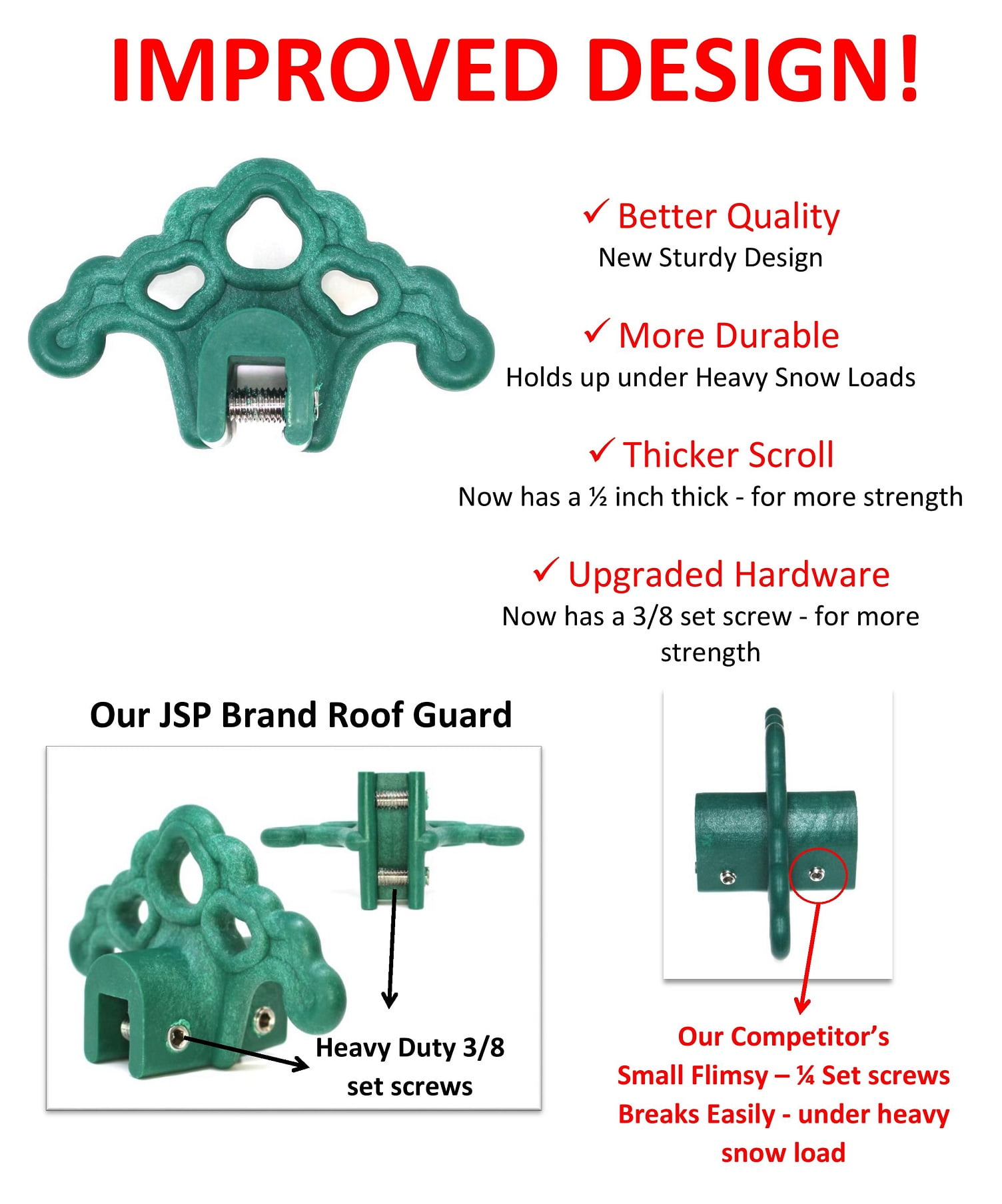 JSP Manufacturing®® Green Standing Seam Roof Snow and Ice Guards – 10 Pack Our JSP Brand Standing Seam Roof Snow and Ice guards have a New & Improved design. Our new design are Stronger and more durable, these heavy duty guards are designed to last! They are designed to keep snow and ice off standing seam metal roofs. Featuring upgraded hardware, that will hold up better under the pressure of snow and ice. These strong and durable guards will protect your property and people from injury and liability claims from injury. Prevent Sliding Snow Ice Buildup. Green Standing Seam Roof Snow and Ice Guards Prevents sliding snow and ice buildup Protect your property and people from damage and injury For use on standing seam metal roofs New Improved Design / Upgraded Hardware Attaches with the (2) New upgraded 3/8 stainless steel set screws provided Easy Installation – uses 3/16″ allen wrench No drilling required Improved Design is Stronger and more durable, designed to last. Made in USA Brand: JSP Manufacturing® MPN: RFGD-SS-GREEN-10Pack Style: Standing Seam Roof Guards Colors Available: Green Quantity: 10 Pack Material: Glass Filled Polymer Manufacturer: JSP Measures Approximately: Width: 5-1/4 inches Length: 2-1/2 inches Height: 3-1/2 inches Slot Width: 9/16 inch Slot Height: 15/16 inch *Please Note: Photo colors may vary slightly from the actual product due to lighting and monitor settings.