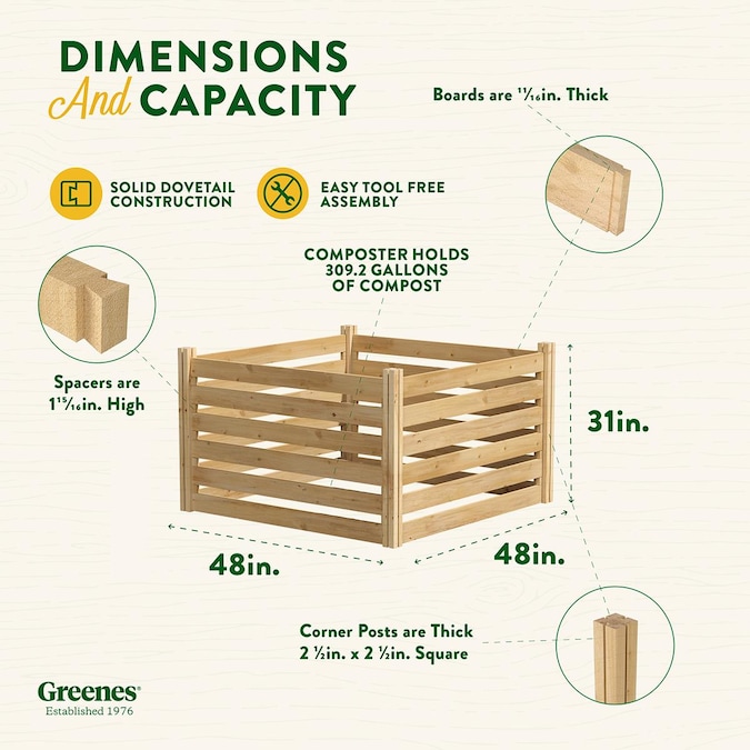 Create an environmentally friendly, economic composting system with Greenes Composting Bins. These cedar bins allow you to turn household waste into a natural food for your lawn, garden, and flower beds. Simply layer greens (such as vegetable and fruit peelings, coffee grounds, tea bags, and grass clippings) and browns (such as eggshells, cardboard, corncobs, and cotton towels) and allow materials to begin to compost. The bins’ open design makes it easy to turn the pile every two to three weeks with a shovel or pitchfork to aerate the product and speed up the breakdown process. Depending on the climate and the mix of materials, your compost will be ready to use in 3 to 12 months. To keep a continuous supply, create a multi-bin system with our add-on kits (sold separately); after one bin is full and the materials have begun to break down, simply move them to the next bin and begin the process again in the first bin. Composed of 4 posts, 24 boards, and 40 spacers, this kit assembles with only a rubber mallet.