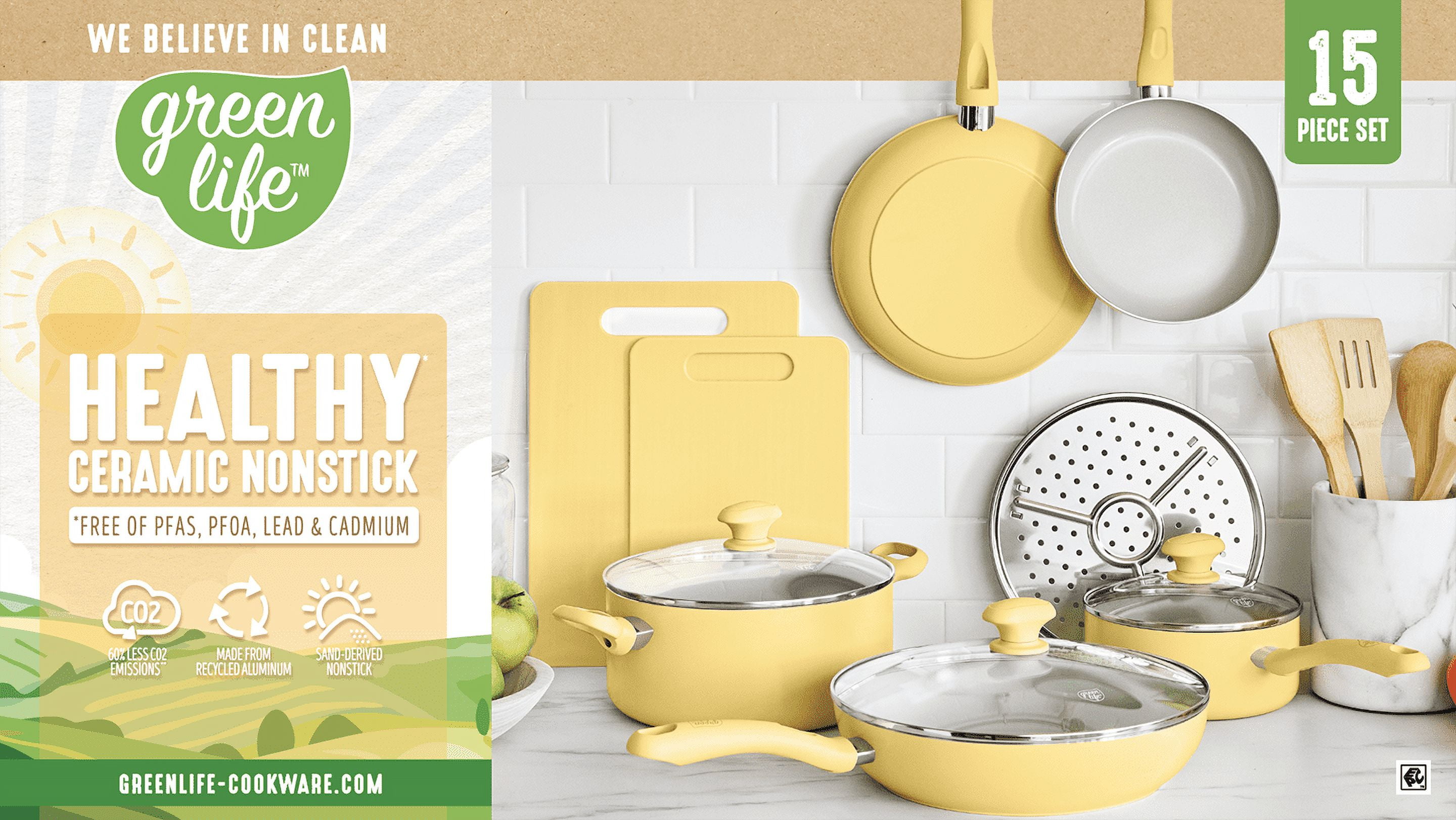GreenLife Savory Ceramic Nonstick Yellow 15pc Cookware Set. This versatile collection is all about comfort and control. Designed for effortless performance and cleanup, this set features our diamond-infused Sandstone nonstick coating, which is Toxin-free. GreenLife?s healthy ceramic nonstick is not stuck in the past?that?s why our ceramic nonstick coating starts with sand and creates 60% fewer CO2 emissions during the curing phase than traditional coatings. The pans are also crafted with recycled aluminum because we want everyone to cook healthy for years to come. Finished in vibrant colors, this set is outfitted with stay-cool handles to keep your cooking comfortable. Durable glass lids for a good look at any meal in progress without sacrificing heat. For all stovetops, except induction. Oven safe up to 350?F. Dishwasher safe.