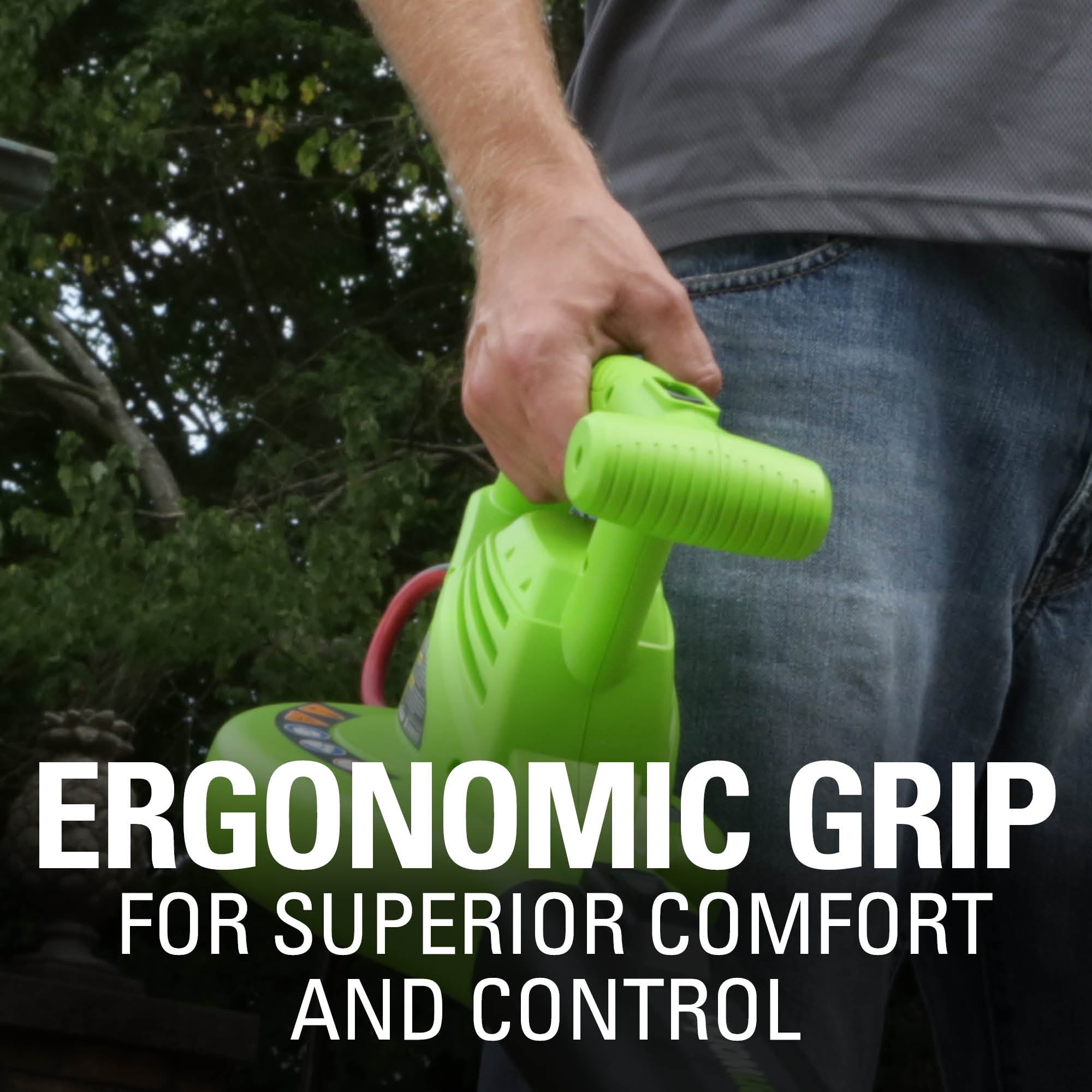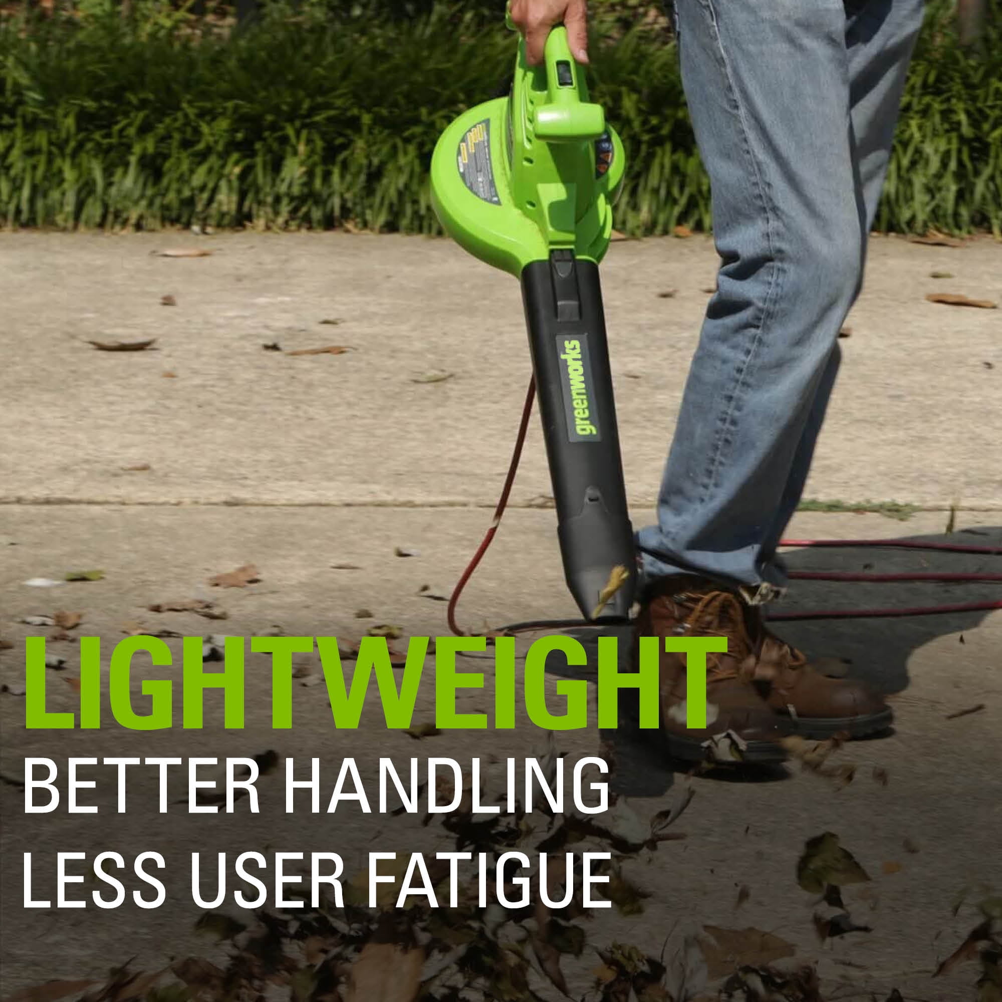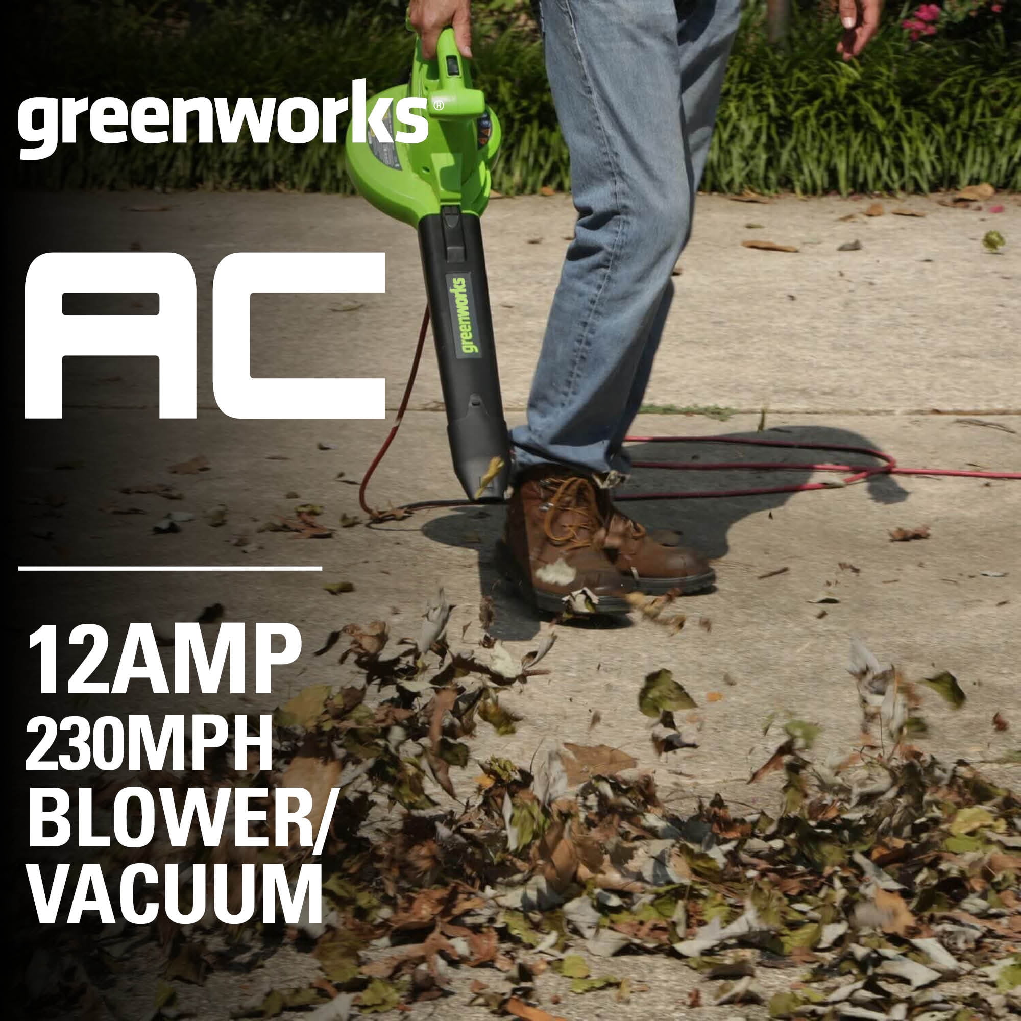New Greenworks 12 Amp 375 CFM Corded Electric Leaf Blower/Mulcher/Vacuum: 2-speed switch delivers wind speed up to 230 MPH, perfect for blowing away debris to removing leaves from your lawn 10:1 mulch ratio allows you to turn 10 bags of leaves to a single bag Quick and easy tool-less transition from blowing to vacuuming when the need arises leaves your yard looking pristine Lightweight design for better handling and less user fatigue Virtually no vibration when compared to gas blowers
