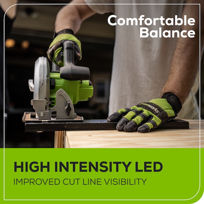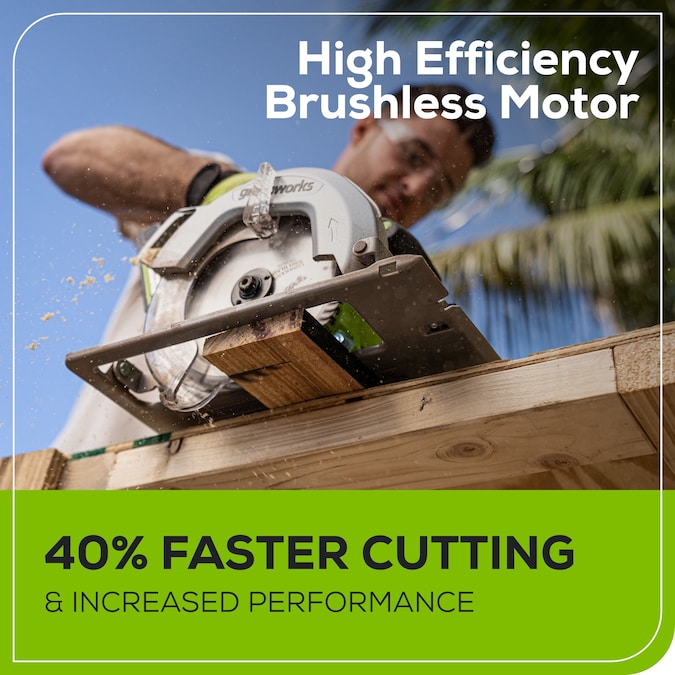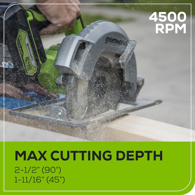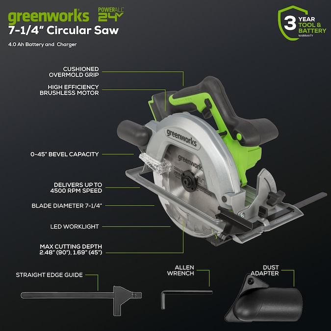 Discover the Greenworks 24V Circular Saw Kit, complete with (1) 4Ah battery and charger, designed to elevate your cutting experience. Equipped with a 7-1/4-inch blade and boasting a 2-1/2-inch cut capacity, this tool ensures peak performance and unparalleled precision. Its 50° bevel and adjustable edge guide enable meticulous cuts, while delivering up to 4,500 RPM for effortless slicing through wood, plastic, plywood, metal, and more. Say goodbye to cluttered workspaces with the vacuum dust adaptor, while onboard LED lights illuminate your project area. Enjoy swift blade changes with the included hex wrench, minimizing downtime. Weighing just 11.9 lbs. with the 4.0 Ah battery, this saw offers enhanced control for various applications. Plus, with the included battery, you can make up to 100 cuts (2×4″) on a single charge, ensuring uninterrupted workflow. Experience efficiency and convenience like never before with the Greenworks Circular Saw Kit.