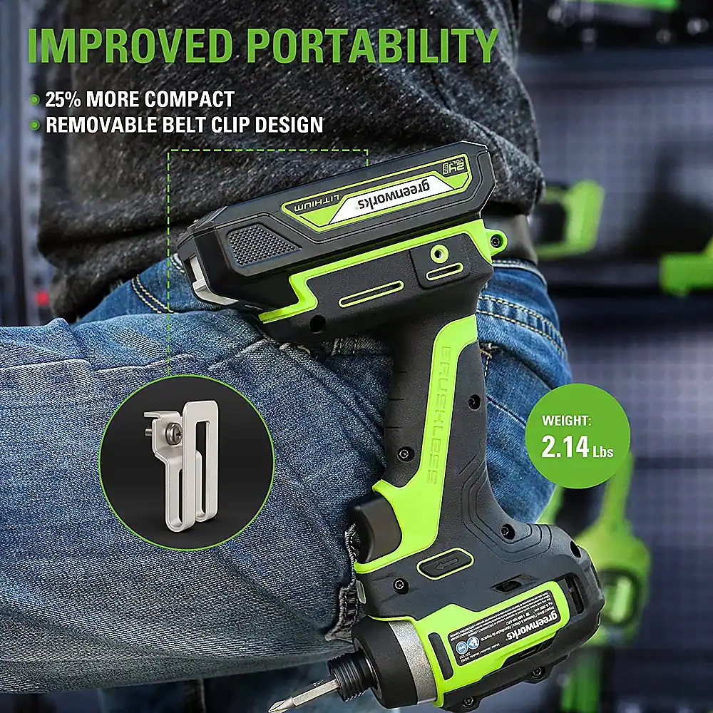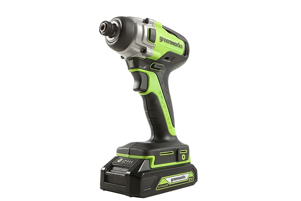 This Greenworks 24V 1/4″ impact driver is packed with power and performance, delivering 1900 in./lbs of torque. Variable speed trigger allows you to control the amount of power to the desired level. The premium brushless motor allows for higher efficiency, longer runtimes, and extended motor life. The included Greenworks 24V Lithium-ion battery powers 100+ tools. The 24V battery delivers fade-free power with no memory loss after charging, providing 20% more power and 35% longer run-time than others on the market.