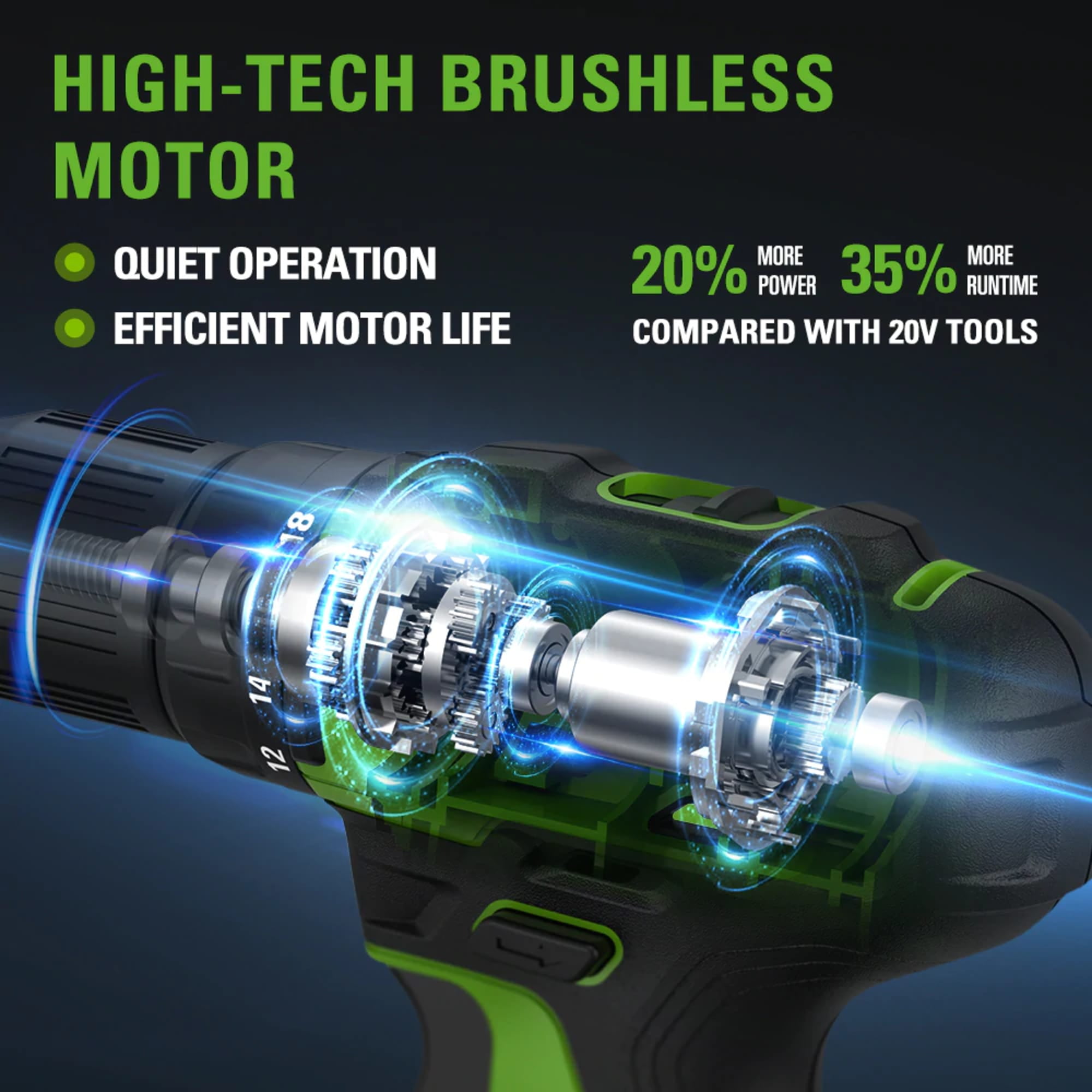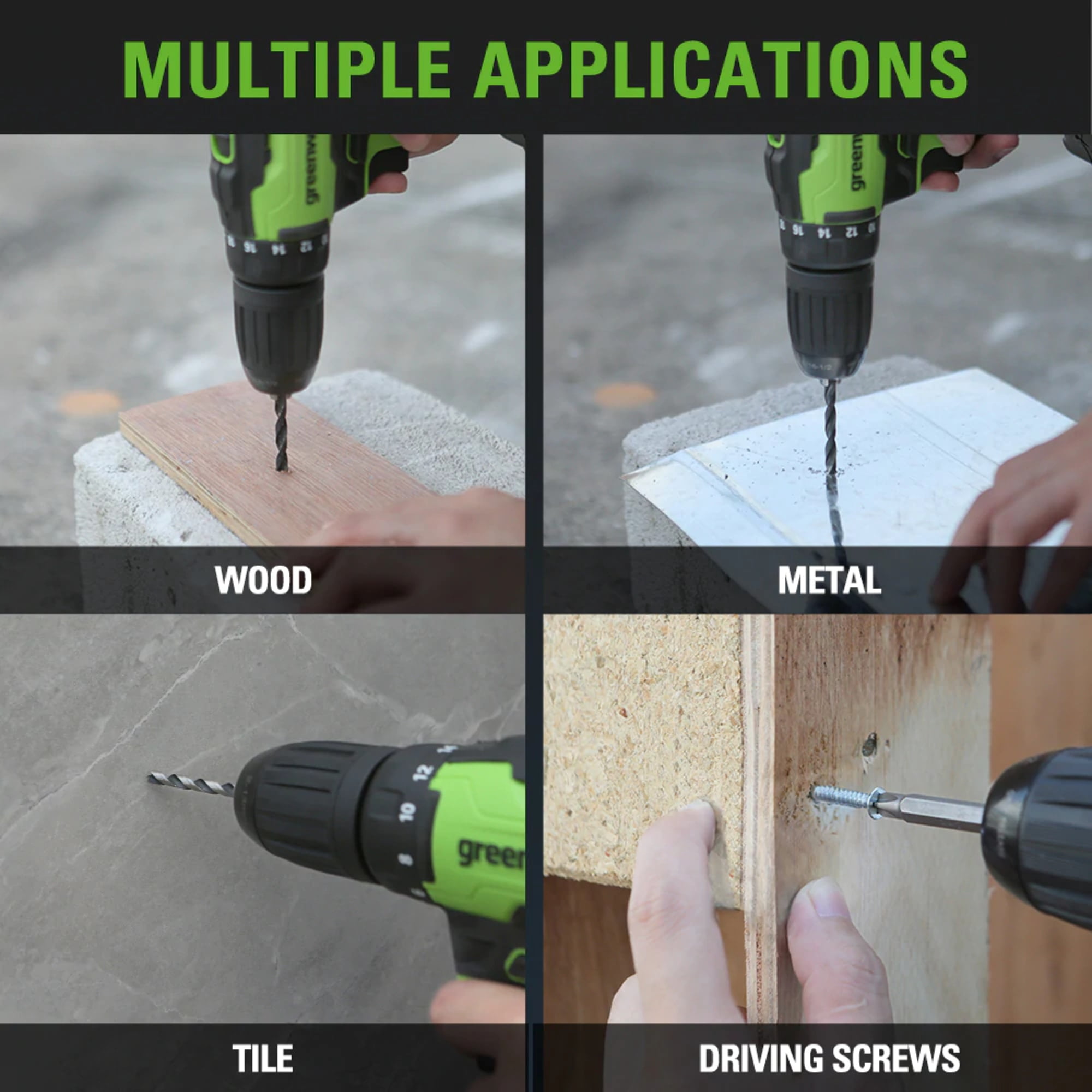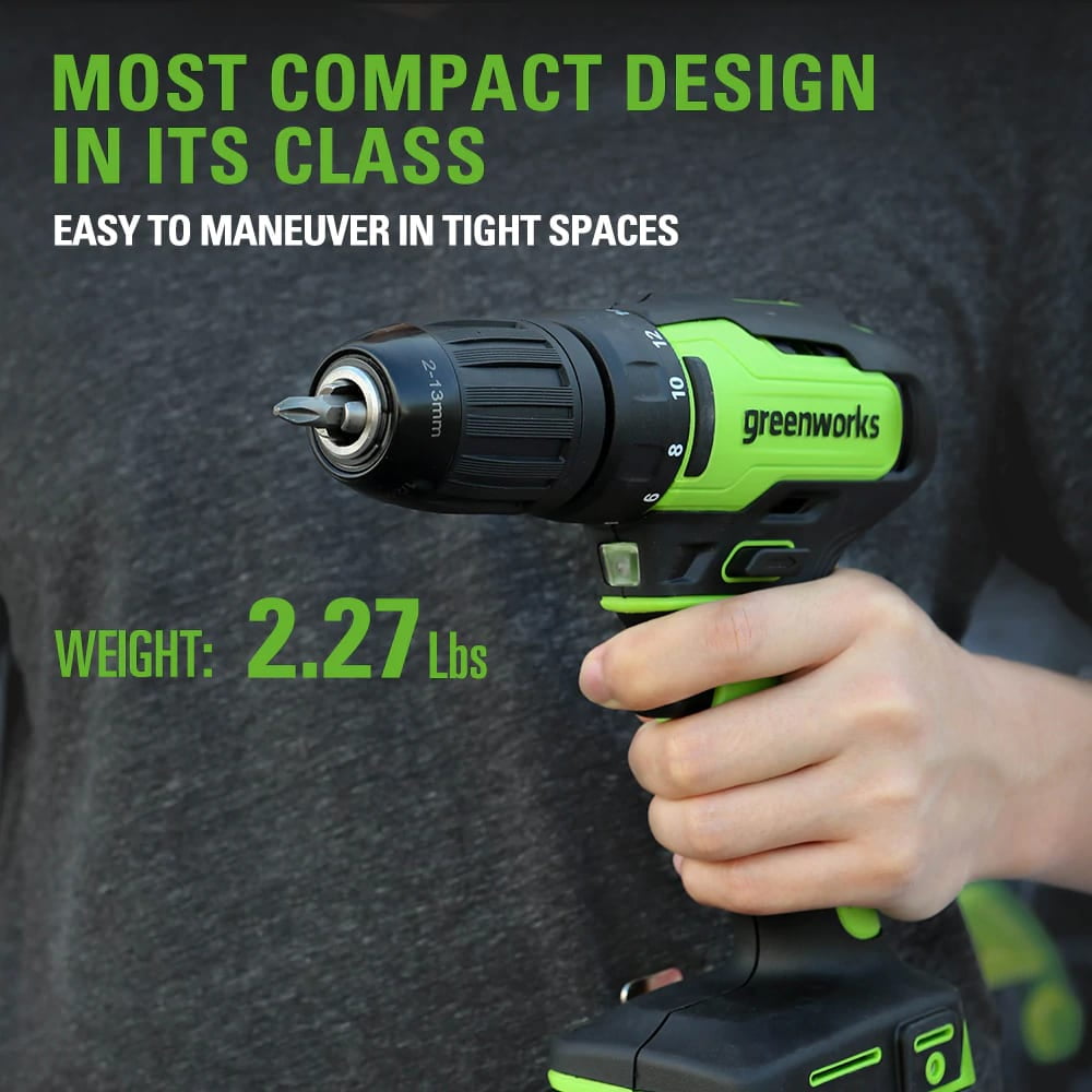 The new Greenworks 24V 1/2-inch Drill/Driver is packed with power and unprecedented performance. Two speed settings with a variable speed trigger allow you to control the amount of power needed. The premium brushless motor allows for higher efficiency, longer runtimes, and extended motor life. The included Greenworks 24V Lithium-ion battery battery powers 100+ tools. The 24V battery delivers fade-free power with no memory loss after charging, providing 20% more power and 35% longer run-time than others on the market. Bonus Greenworks Carrying Bag and drill bits included!