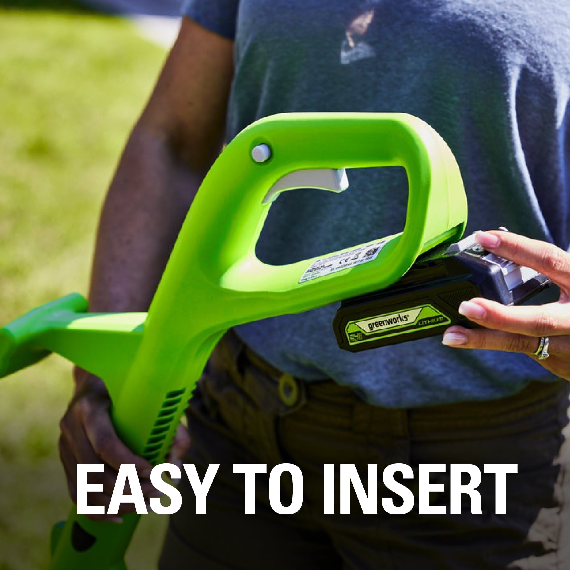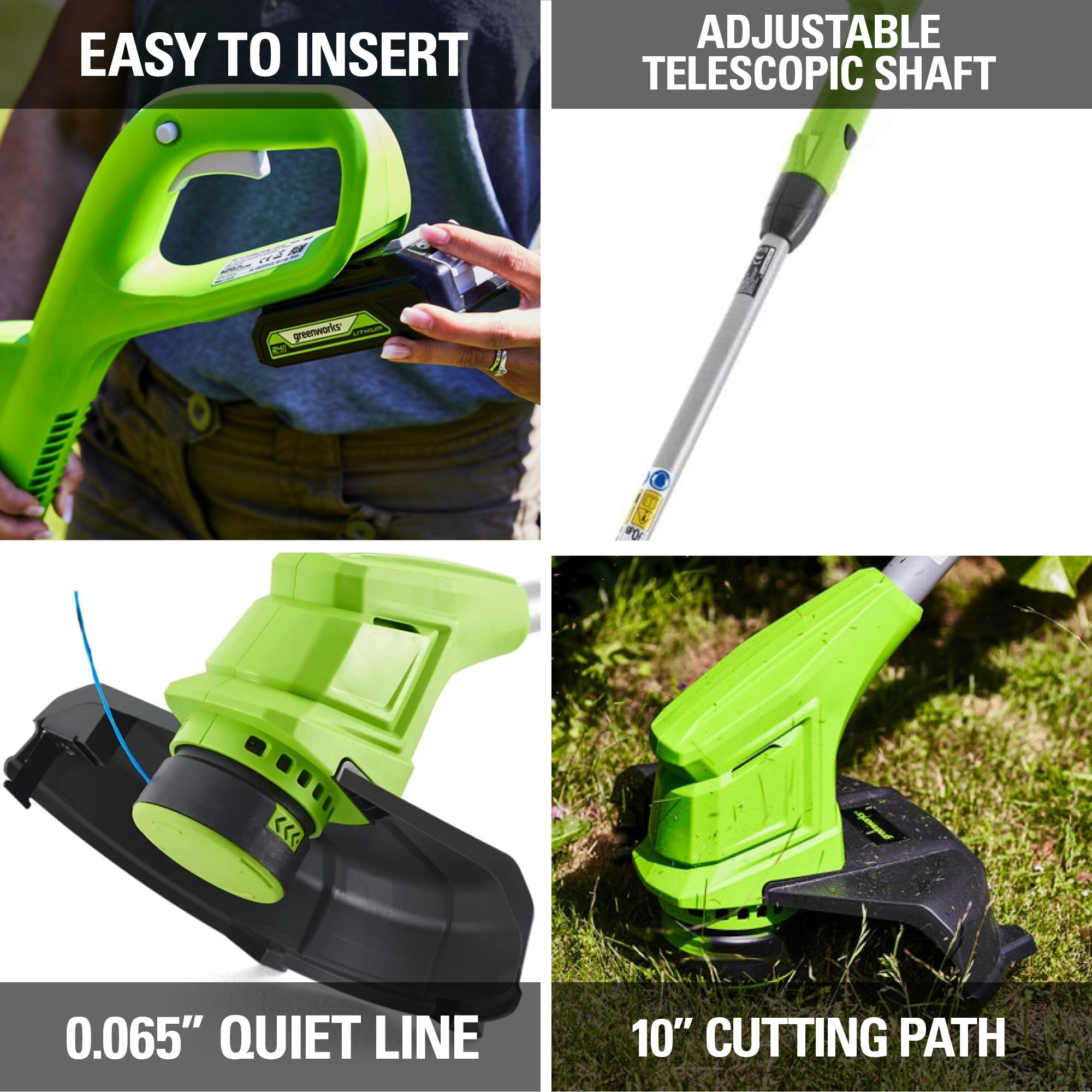 Features of Greenworks 24V 10-inch String Trimmer: Combines innovative lithium-ion battery technology with high efficiency motors to deliver up to 30% more run time on a single charge Up to 30 minutes of runtime on fully charged battery Trimmer converts to an edger with one touch for easy walk-behind edging Lightweight and adjustable to add comfort and reduce user fatigue No cords to pull and the tool starts with a push of a button 24 volt battery used in this Greenworks trimmer will power the entire family of Greenworks 24 volt tools Gas-free is quieter and all Greenworks products have zero carbon emissions in the yard Includes one 24V 2.0 Ah battery and charger 3-year warranty What’s Included: (1) 24V 10-inch String Trimmer (1) 2.0 Ah Battery and Charger (1) Battery Charger (1) Owner’s Manual