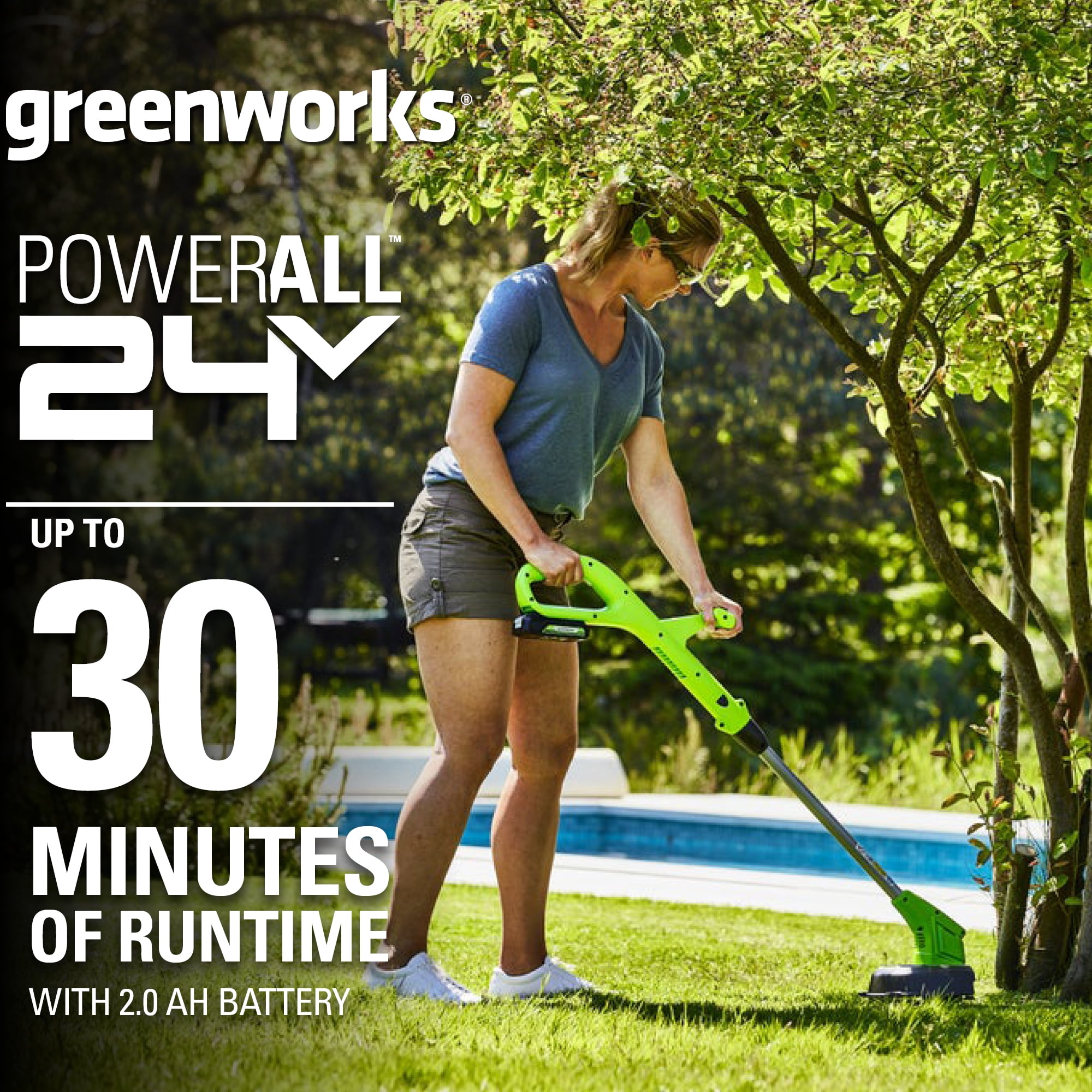 The Greenworks 24 volt trimmer/edger is a powerful gas trimmer that converts to an easy walk behind edger with the push of a button, saving you time and money with this two-in-one tool. Greenworks combines innovative lithium-ion battery technology with high efficiency motors to create a trimmer that delivers up to 30% more run time on a single charge – all the power and runtime you need for a beautifully finished yard without the fumes mess and maintenance of gas-powered lawn care tools. The trimmer converts to an edger with one touch for easy walk-behind edging with a guide wheel for a straight precise cut. The multi-position pivoting trimmer head adjusts for easy trimming and hard-to-reach places. The retractable flower guard keeps a safe distance from your delicate plants and flowers. The trimmer is lightweight and adjustable to add comfort and reduce user fatigue. There are no cords to pull and the tool starts with a push of a button. Superior to other battery types, lithium-ion batteries offer maximum performance with up to three times longer running times. Consistent, full power for the duration of the charge, gives you optimum no fade performance from start to finish with about one-third the weight of other battery types. The same 24 volt battery used in this Greenworks trimmer will power the entire family of Greenworks 24 volt tools, giving you the total solution to gas free yard care. Reliable and tough, all Greenworks lawn tools are backed by an industry leading four year limited warranty. Plus, gas-free is quieter and all Greenworks products have zero carbon emissions in the yard. Greenworks: high-powered, more versatile, longer running. With Greenworks, life gets easier.
