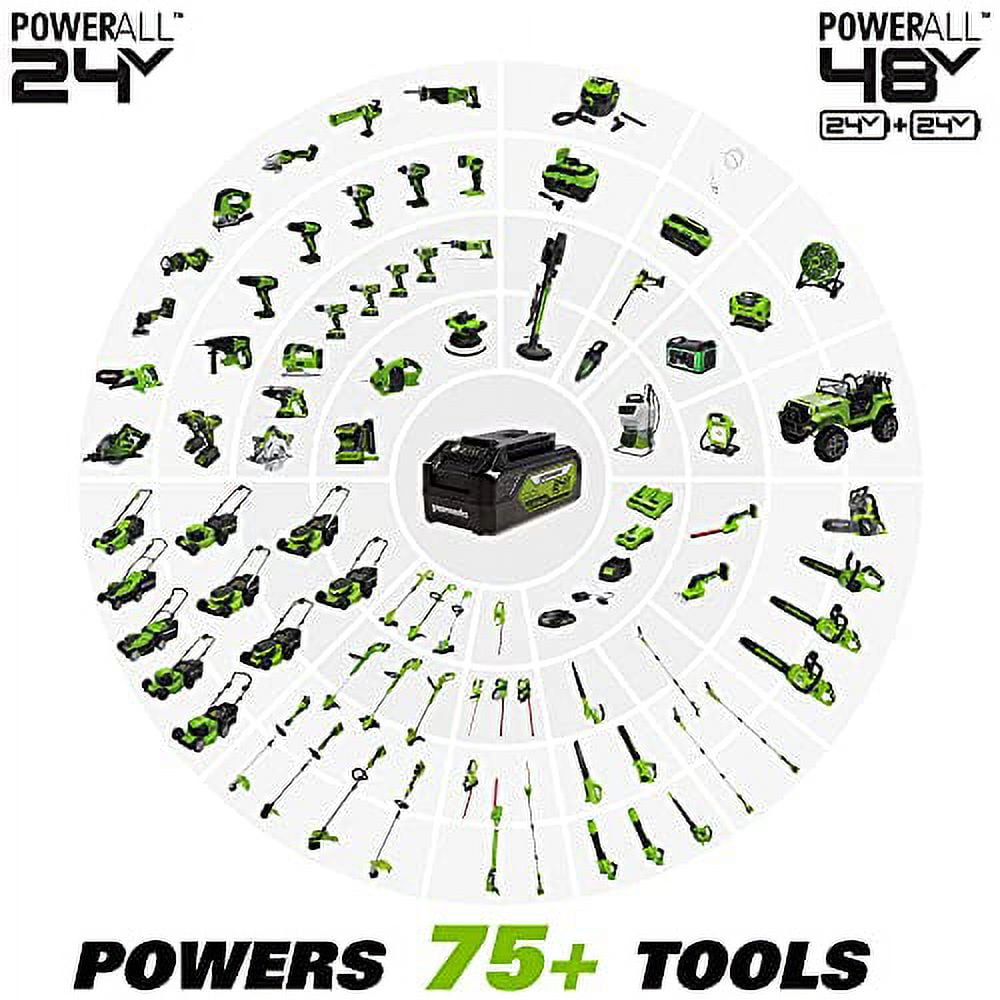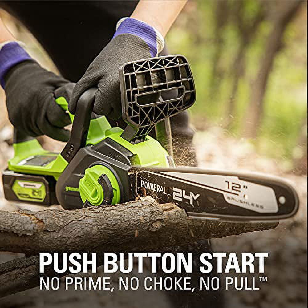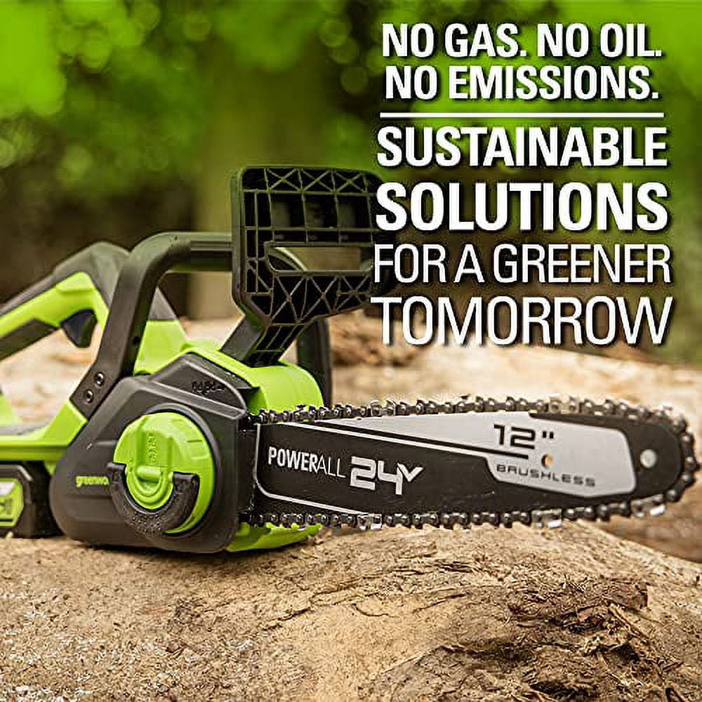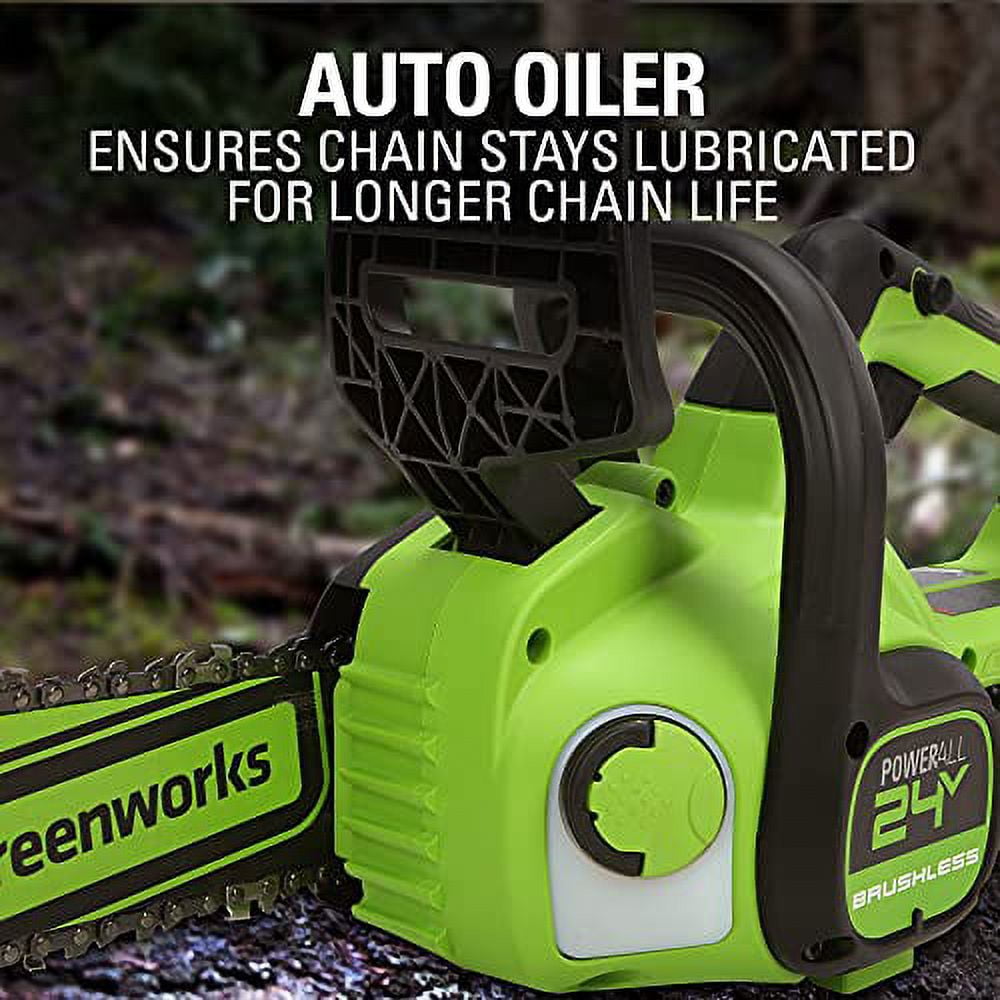 New Greenworks 24V 12″ Brushless Chainsaw: Greenworks 24V Lithium-Ion battery provides 20% more power and 35% more run-time, and delivers fade-free power with no memory loss after charging Highly efficient 24V brushless motor provides more torque, quiet operation, and longer life 12″ bar and chain (low kickback) is perfect for homeowners and occasional users Auto-oiler mechanism ensures the chain stays lubricated, and the oil level indicator window allows you to gauge oil usage Electric start – No gas or fumes, no carburetor, no spark plug, and no starter rope USB port in battery charges all portable electronic devices, including phones & tablets (30000 mAh Power Bank) What’s Included: (1) 24V 12″ Brushless Chainsaw (1) 4.0 Ah USB Battery (1) Charger (1) Owner’s Manual