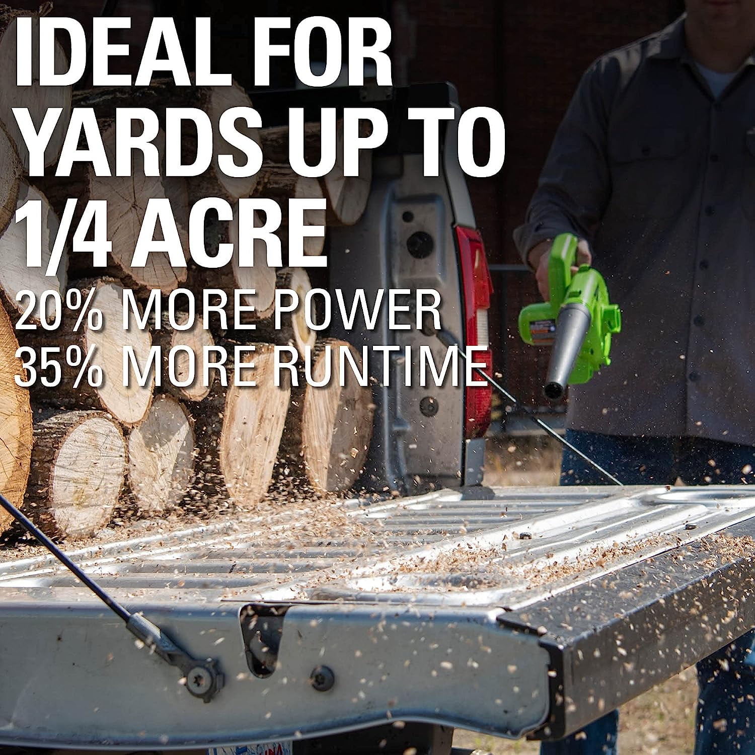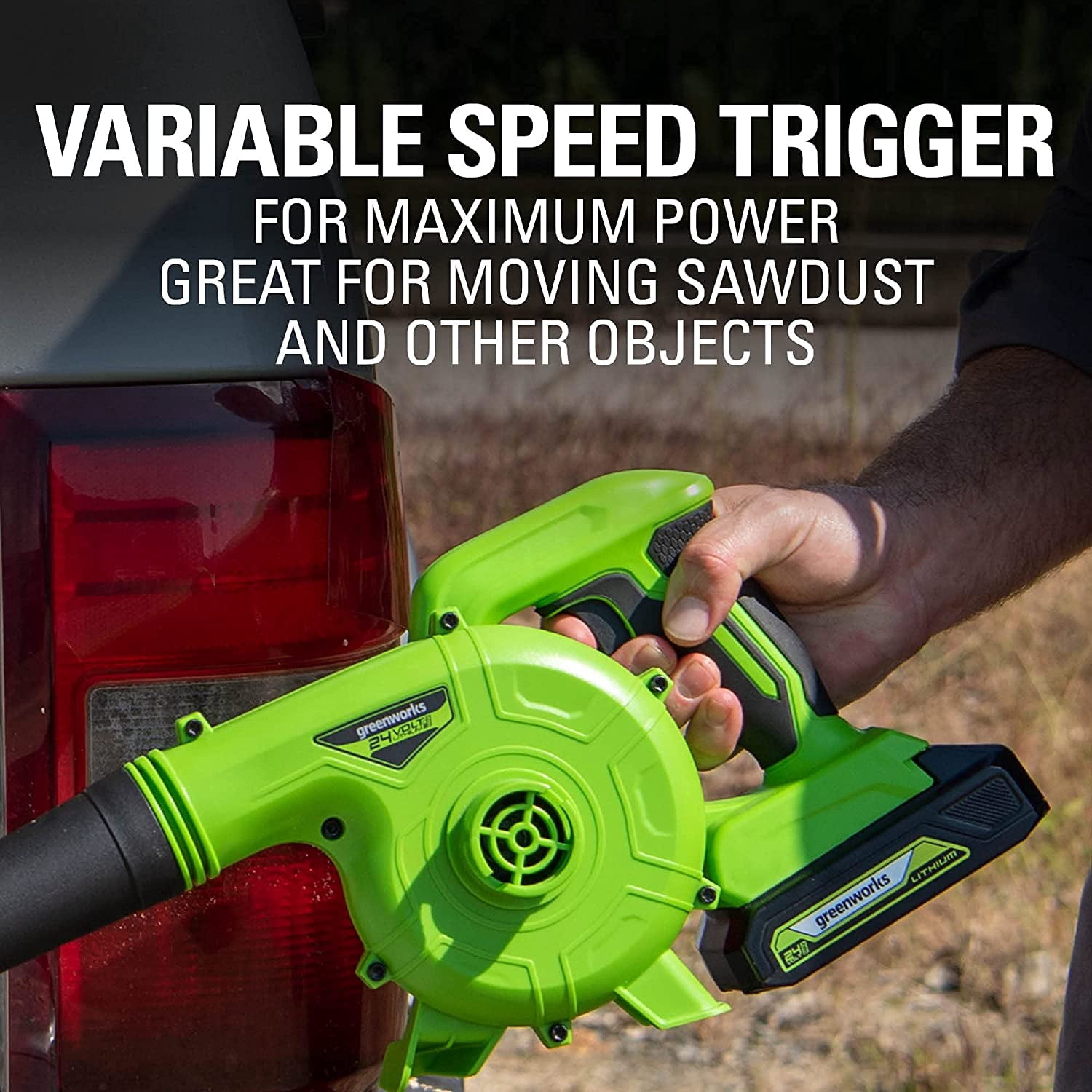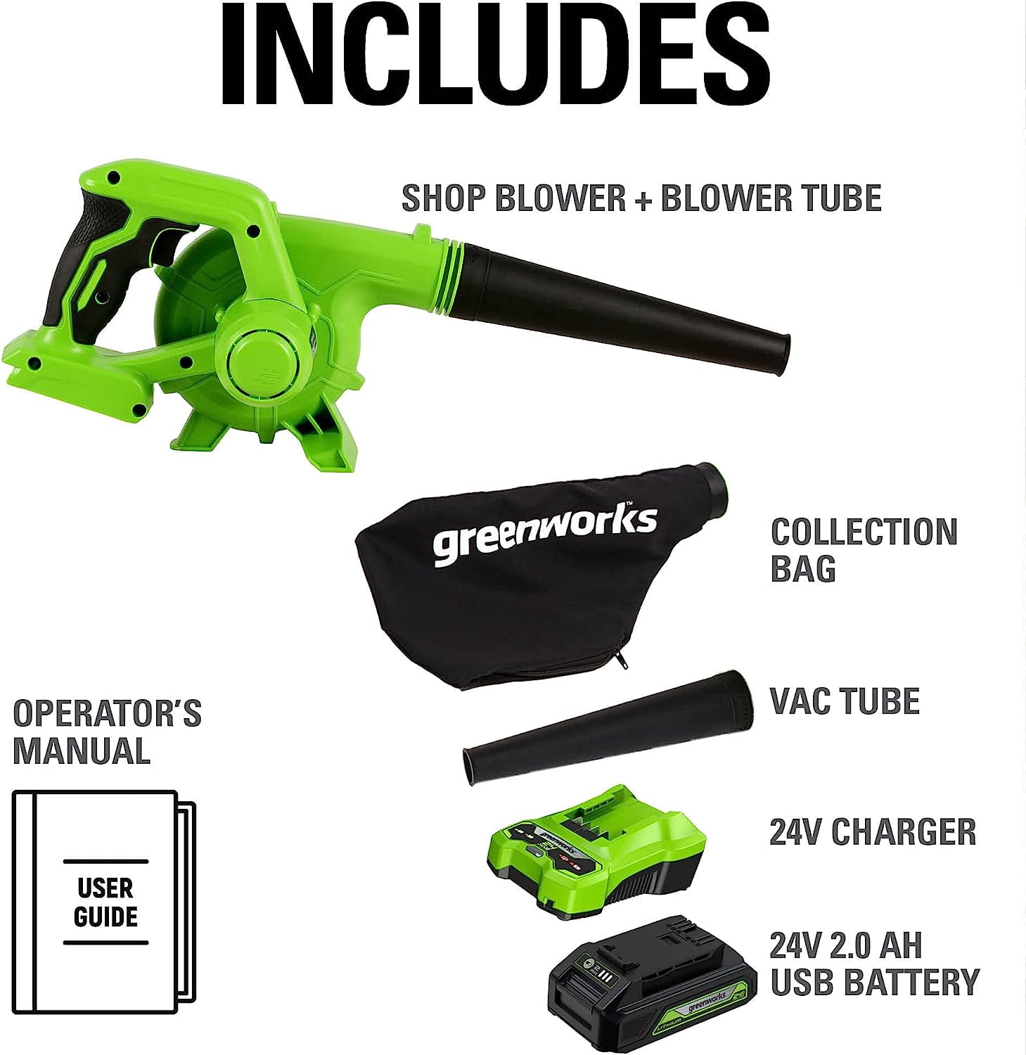 About this item High-performance 24V motor: Delivers 180 CFM at 90 MPH for efficient light-duty cleaning Adjustable speed control: Variable speed trigger allows for tailored power on demand Easy mode switching: Tool-less transition from blower to vacuum mode (bag included) Enhanced user comfort: Soft, over-molded grip reduces fatigue during extended use USB Battery Power Station: 12000mAh Power Bank charges portable devices on the go All-inclusive package: Includes 24V 2Ah USB Battery and Charger for a complete solution What’s Included (1) 24V 180CFM/90 MPH Shop Blower (1) 24V2.0 Ah battery (1) Charger (1) Owner’s Manual Warranty + Service 3 year tool limited warranty 3 year battery warranty Power 125+ Tools with any Greenworks 24V Battery