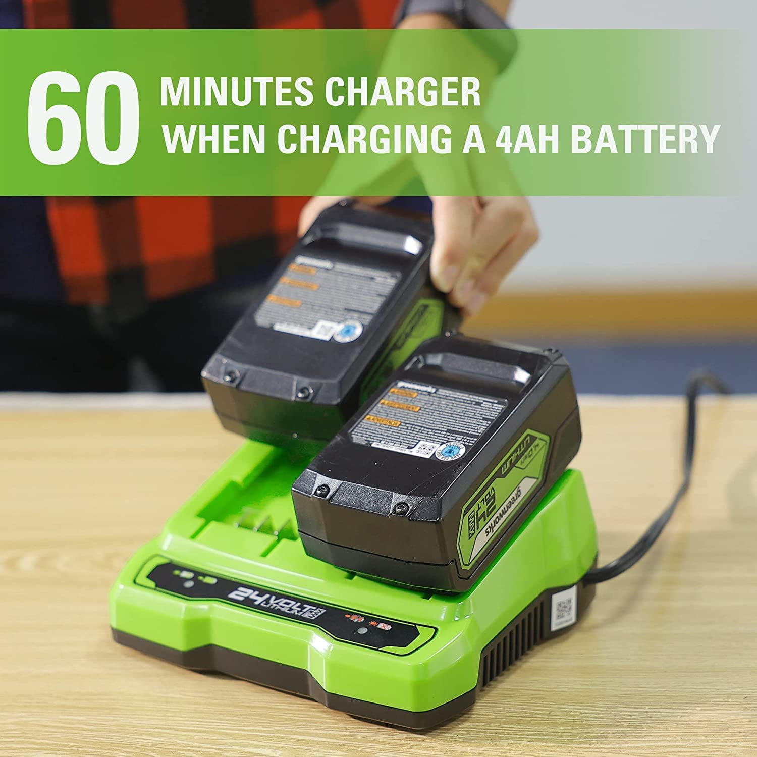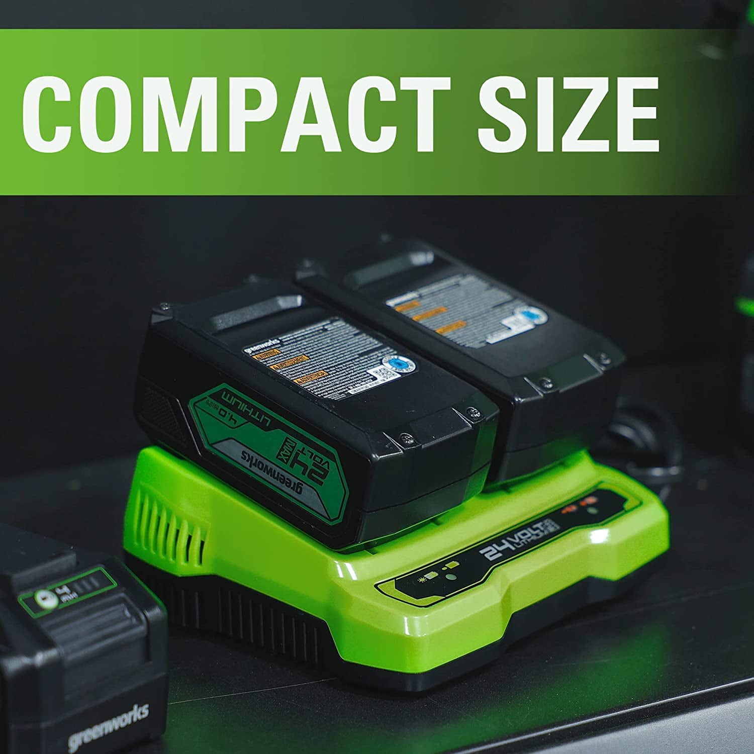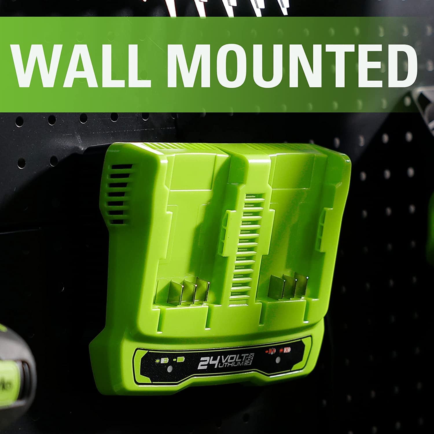 Greenworks 24V 4A Dual Port Charger: Diagnostic LED charging indicator. Communicates current charge level, and any battery or charger issues Charges (2) 24V batteries simultaneously, or (1) 24V battery twice as fast Can be used on a benchtop or mounted on the wall Charges all Greenworks 24V battery packs (except enhanced series)