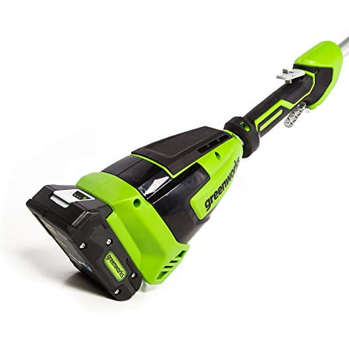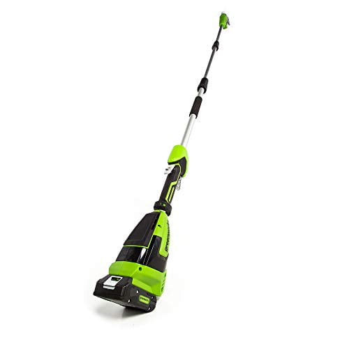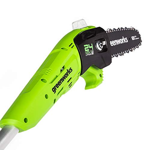 Greenworks 24V 8″ Cordless Pole Saw with 2Ah Battery and Charger: 8-inch bar and chain, perfect for cutting branches and limbs in elevated hard to reach areas 3-piece aluminum shaft provides 9-ft. total length and 11-ft. total reach Automatic oiler applies oil to the bar and chain to ensure durability and extend the life of the chain Translucent oil tank for clear view of oil level Hassle free push button start 7.27 lb