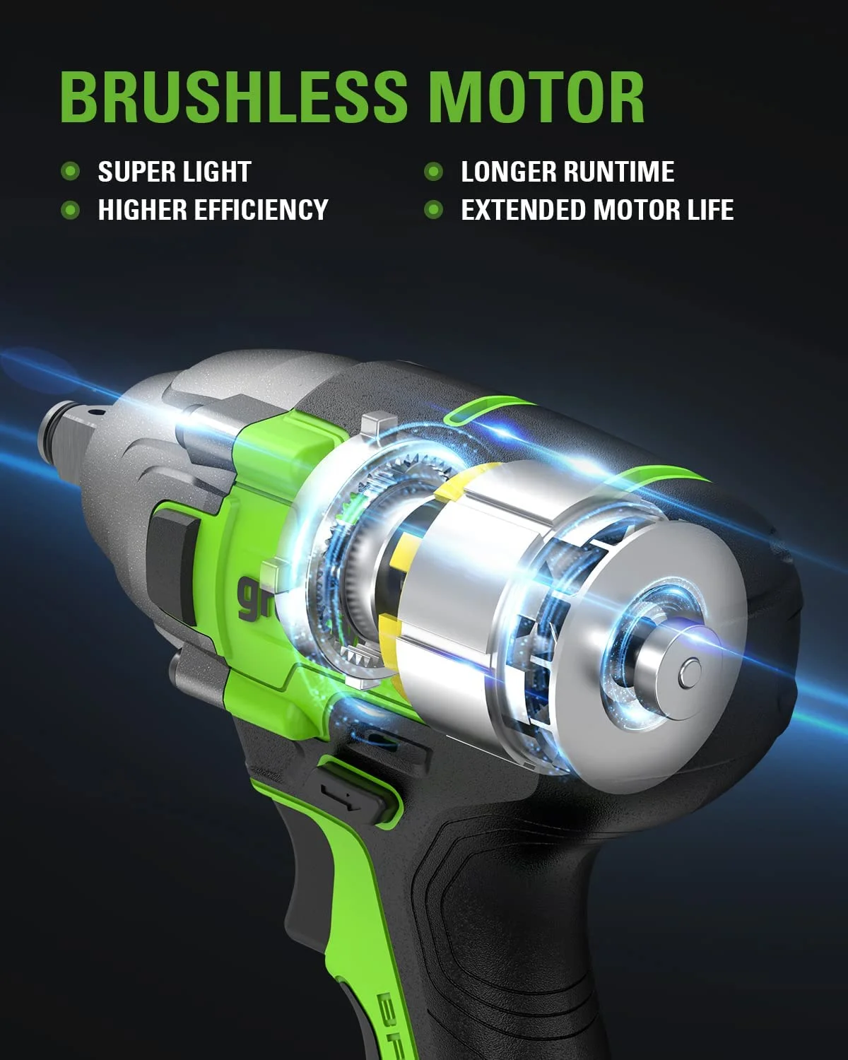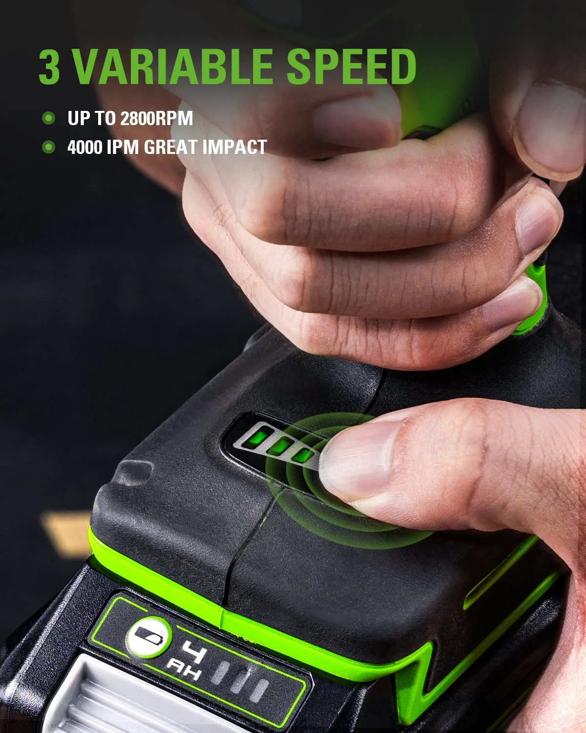 New Greenworks 24V Brushless 1/2″ 300 ft/lbs Impact Wrench: 3 Speed Selector: With variable speed trigger, you get precise control over a variety of applications Lightweight and Compact: 35% shorter compared to similar brushed units and well-suited for work in small or tight spaces Highly Efficient Brushless Motor: Provides 2640 in-lbs. of torque and 2800 RPM for your most demanding driving and fastening applications LED Light: Illuminates your workspace when working in low light situations Cushioned over mold Grip: Adds pleasant hold and ideal comfort to use with less hand fatigue Impact rate: 4000 IPM Includes: 1/2-inch impact wrench, 4.0Ah battery, charger, tool bag