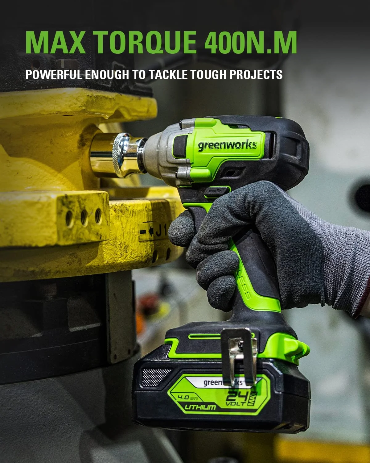 The new Greenworks 24V Cordless 1/2 inch impact wrench with 4.0Ah battery & charger has an impact rate of 4000 IPM max. With 300 ft.-lbs. this powerful impact wrench is equipped to tackle the toughest tasks for your home and garage. The brushless motor allows for higher efficiency, longer runtimes, and extended motor life. The Greenworks 24V Lithium-ion battery system powers 100+ tools. The 24V battery delivers fade-free power with no memory loss after charging, providing 20% more power and 35% longer run-time than others on the market.