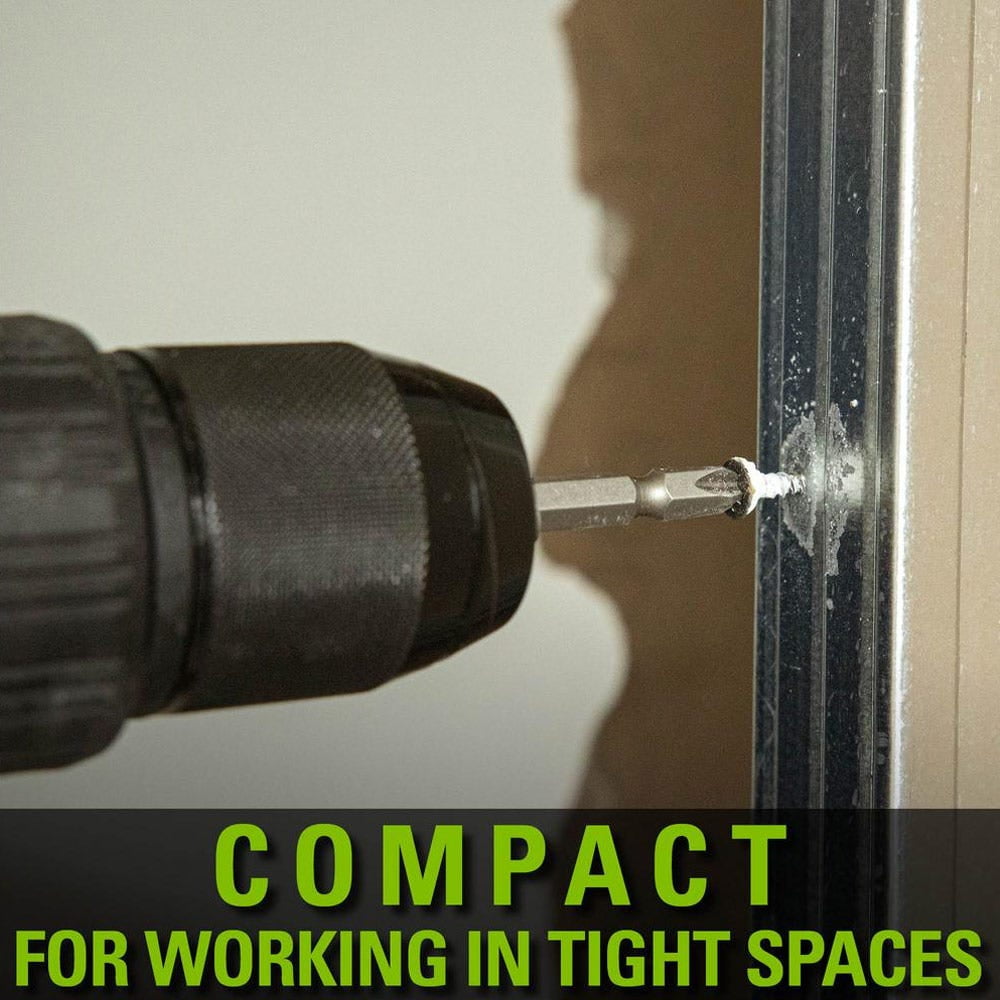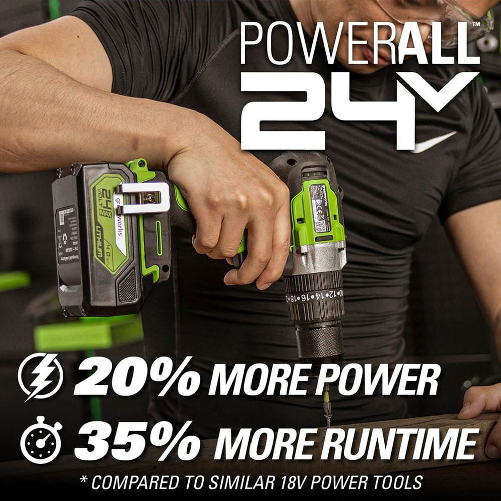 New Greenworks 24V Brushless 1/2″ Hammer Drill: Greenworks 24V battery provides 20% more power and 35% more run-time, and delivers fade-free power with no memory loss after charging Highly efficient 24V brushless motor provides more torque, quiet operation, and longer life 1/2″ metal keyless ratcheting chuck for easy bit changes 20-position clutch for torque control to avoid stripping / over tightening screws and 2-speed gearbox with speeds of (0-450, 0-1,750 RPM) Drill Mode: For drilling holes in wood, plastic, and metal Drive Mode: For driving screws and bolts Hammer Mode: Drilling holes in masonry and concrete Convenient built-in LED light for working in poorly-lit spaces Cushioned over mold grip for superior comfort and control Included belt clip allows you to free your hands while completing other tasks at hand
