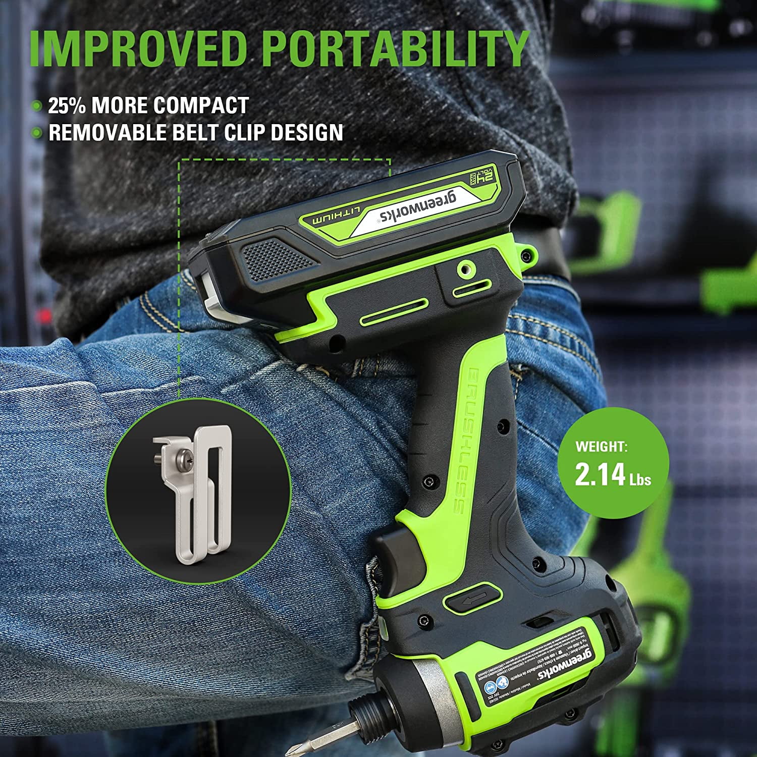 New Greenworks 24V Brushless 1/4″1900 in./lbs. Impact Driver: 1/4″ Hex Collet & Variable Speeds: Allow for more versatility in a variety of materials with 3,500 IPM, 1,900 in-lbs (220Nm) torque, 2,800 RPM Lightweight and Compact: 35% shorter than similar brushed units and you’re given extra convenience when working especially in tight spaces Premium Brushless Motor: You get more power, cooler operation at high speeds, enhanced battery runtime and longer service life LED Work Light: Illuminates your workspace so you just keep your mind on your work even in the dark