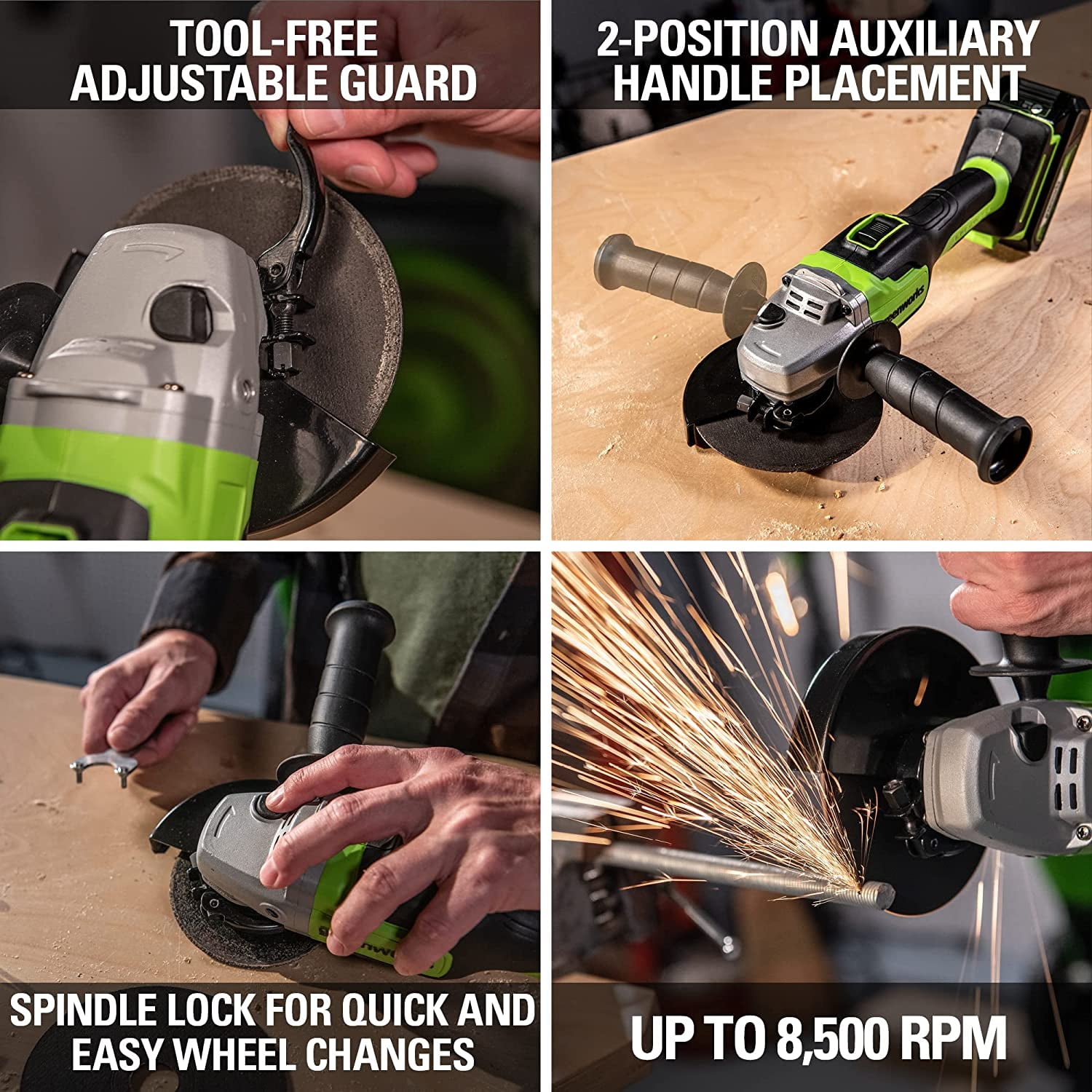 Greenworks 24V battery provides 20% more power and 35% more run-time, and delivers fade-free power with no memory loss after charging Highly efficient 24V brushless motor provides more torque, quiet operation, and longer life 4.5 in. disc is perfect for cutting or grinding applications