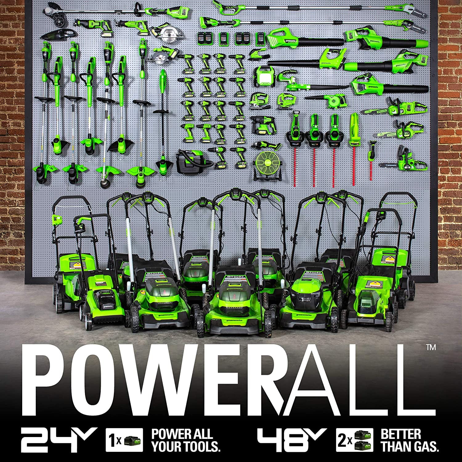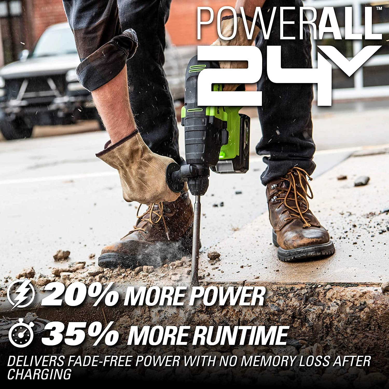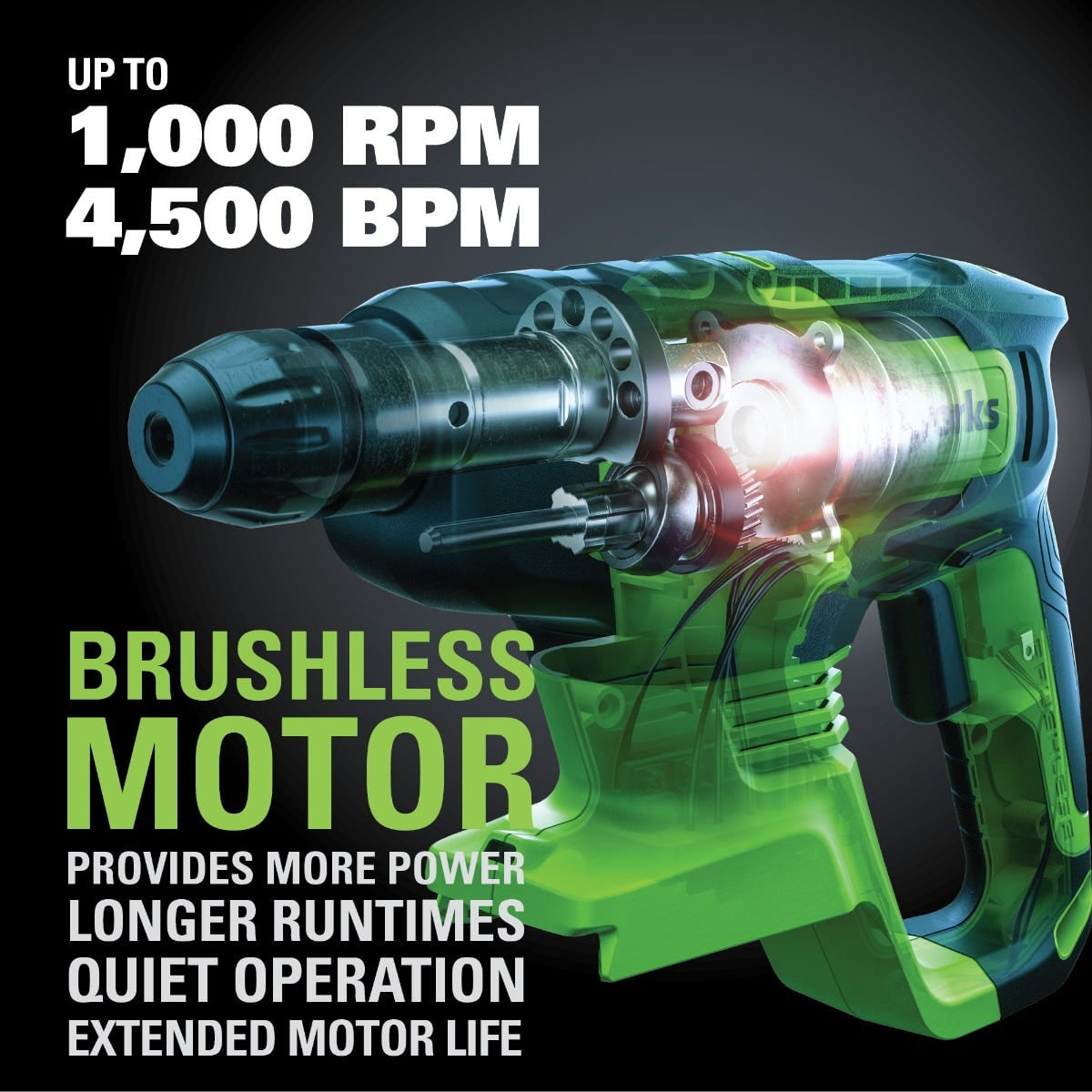 Greenworks 24V Brushless SDS-Plus 2J Rotary Hammer, Battery Not Included HM24L00 Greenworks 24V battery provides 20% more power and 35% more run-time and delivers fade-free power with no memory loss after charging. Brushless Motor provides 0-1,000 RPM and 4,500 BPM to power through the toughest materials. SDS-Plus chuck for quick and tool-free bit changes. Optimized 2 Joules mechanism provides faster than corded speed. 4-mode selector for drill, rotary hammer, chisel, and chisel adjust. Includes adjustable side handle with integrated depth stop rod.