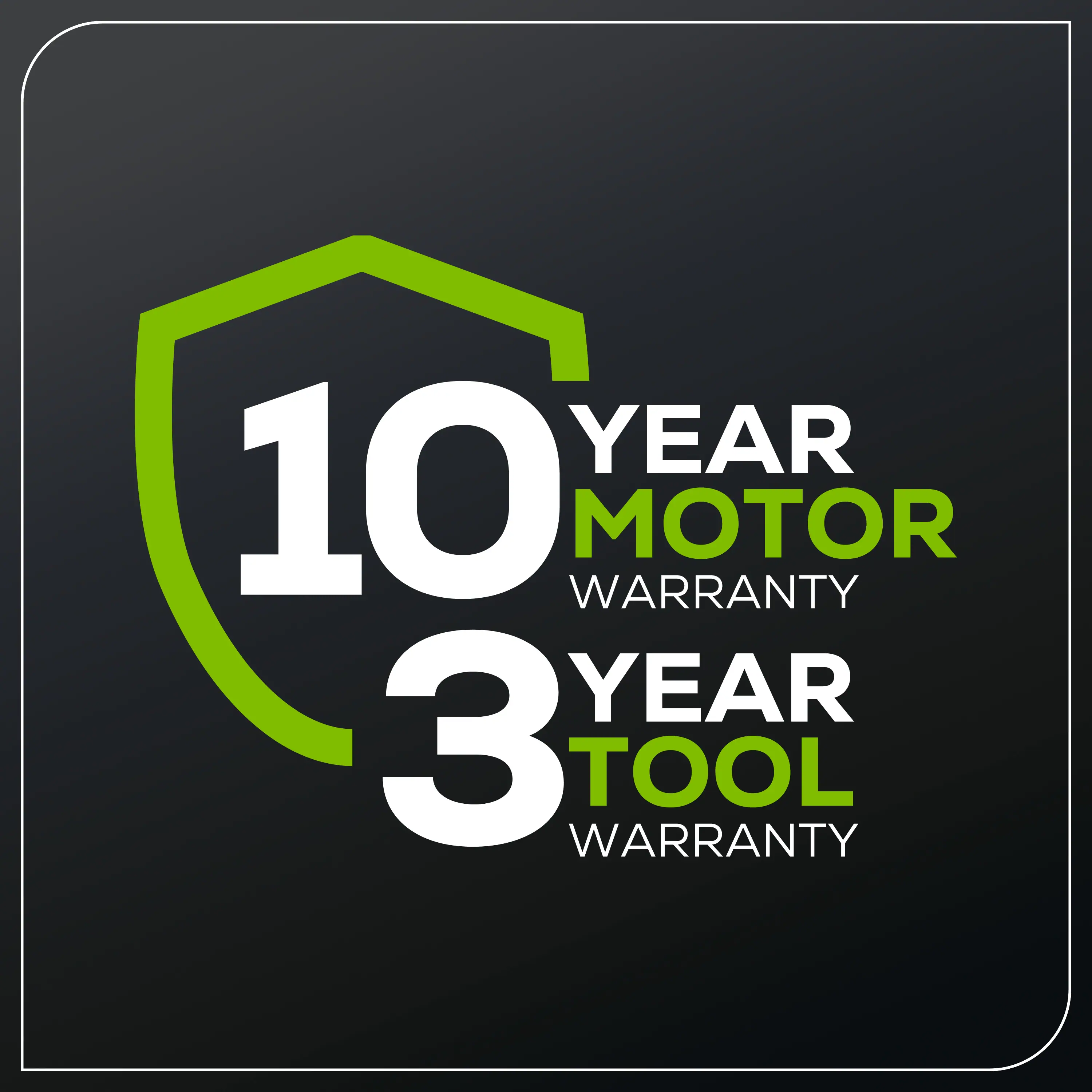 - Warranty – Parts: 10 Year Motor, 3 Year Tool Warranty