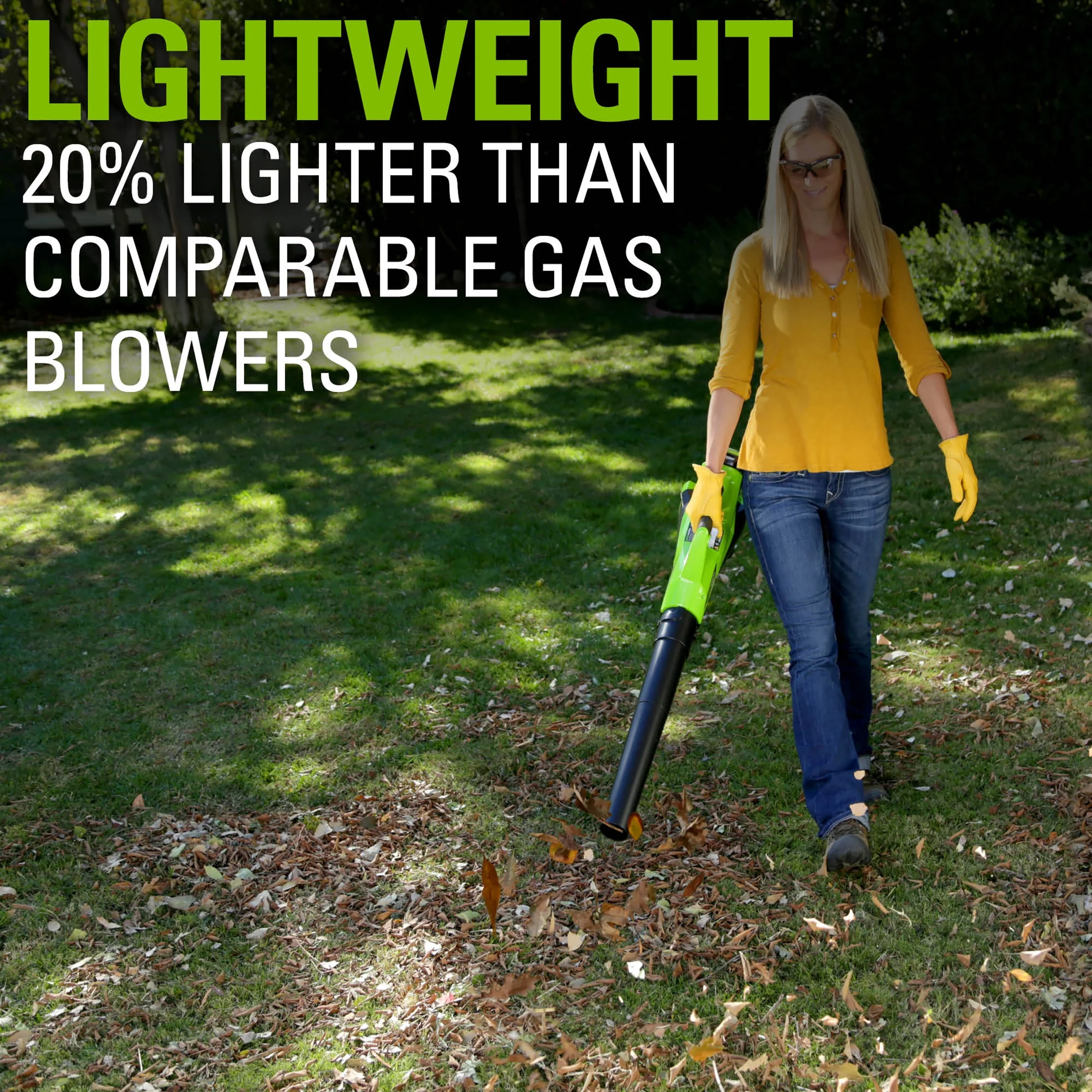 Features of Greenworks 40V 390 CFM 110 MPH Cordless Leaf Blower: Innovative jet fan design maximizes air flow efficiency 110 MPH and 390 CFM for gas-like performance Variable speed trigger with cruise control for optimized air speed control Soft grip handle for added comfort Compatible with Greenworks 40V Li-Ion system for higher efficiency and longer run time with an assortment of tools to complete your yard work Includes one 2.5 Ah battery and charger 3-year warranty What’s Included: (1) 40V Cordless Axial Leaf Blower (1) 2.5 Ah Battery (1) Battery Charger (1) Owner’s Manual
