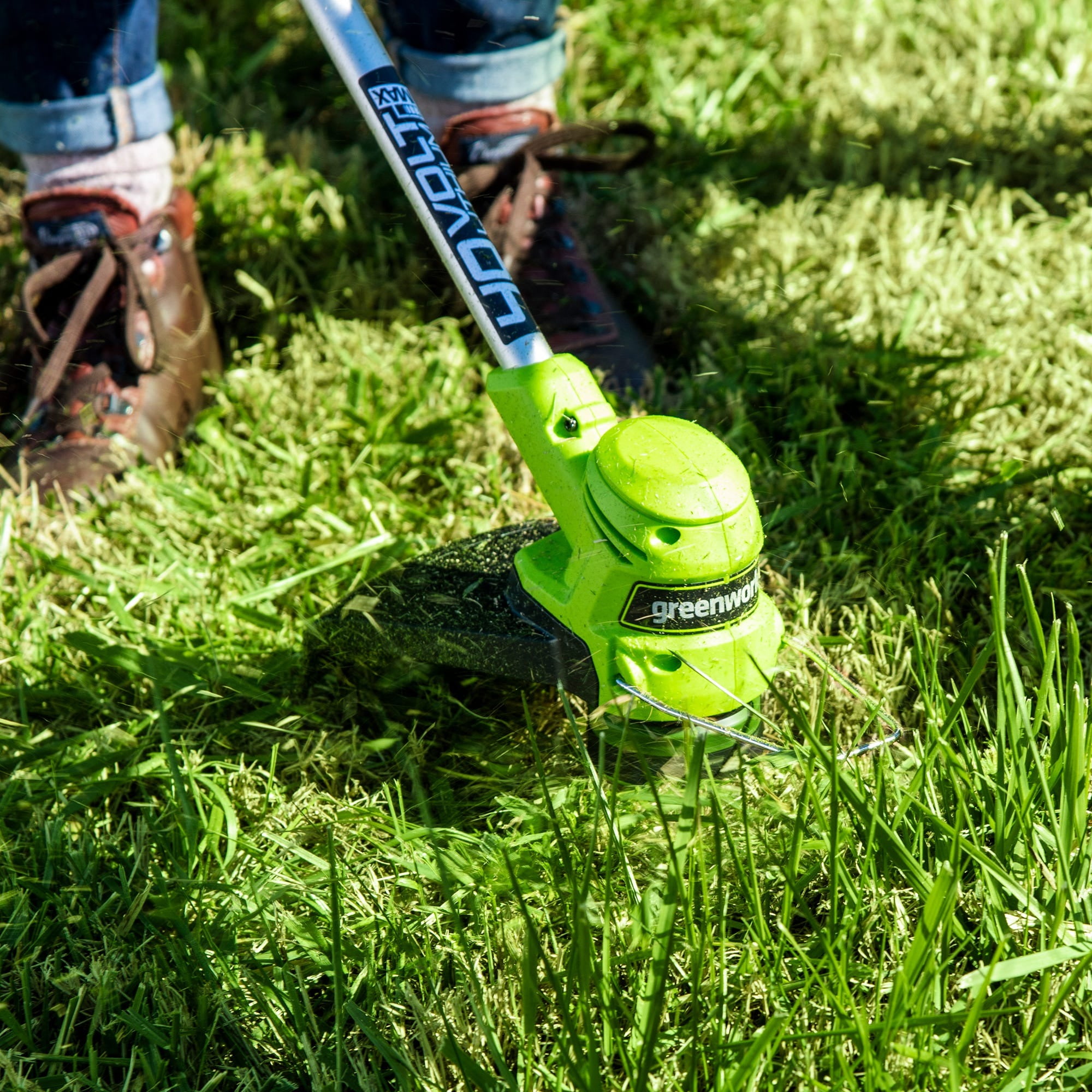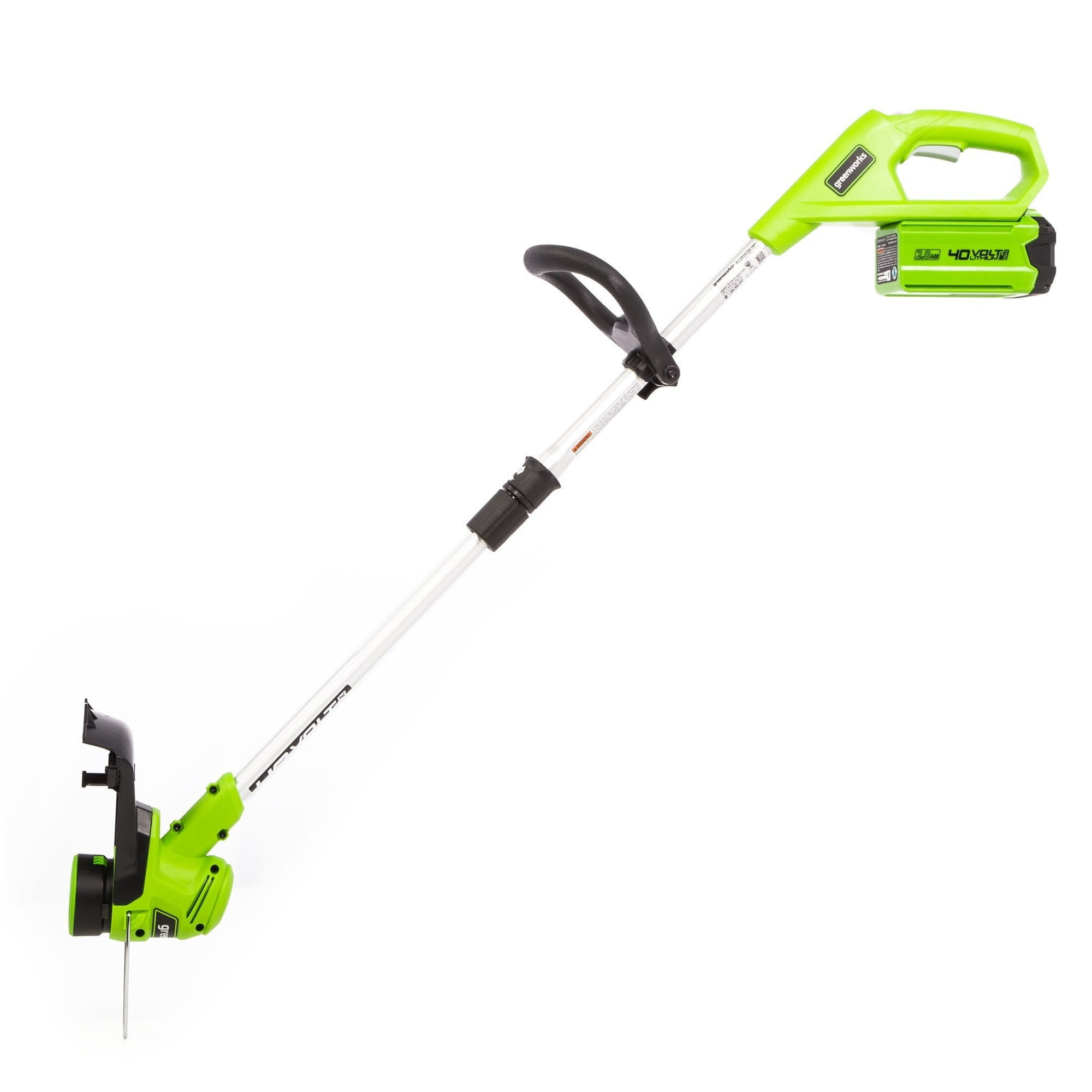 Greenworks 40V 12″ Cordless String Trimmer: 12″ cutting path for quick and easy trimming with powerful results to cut through the toughest weeds 0.065″ single line auto feed head for fast results Hassle free push button start Telescoping shaft adjusts to your height Includes one 40V 2.0 Ah battery and charger