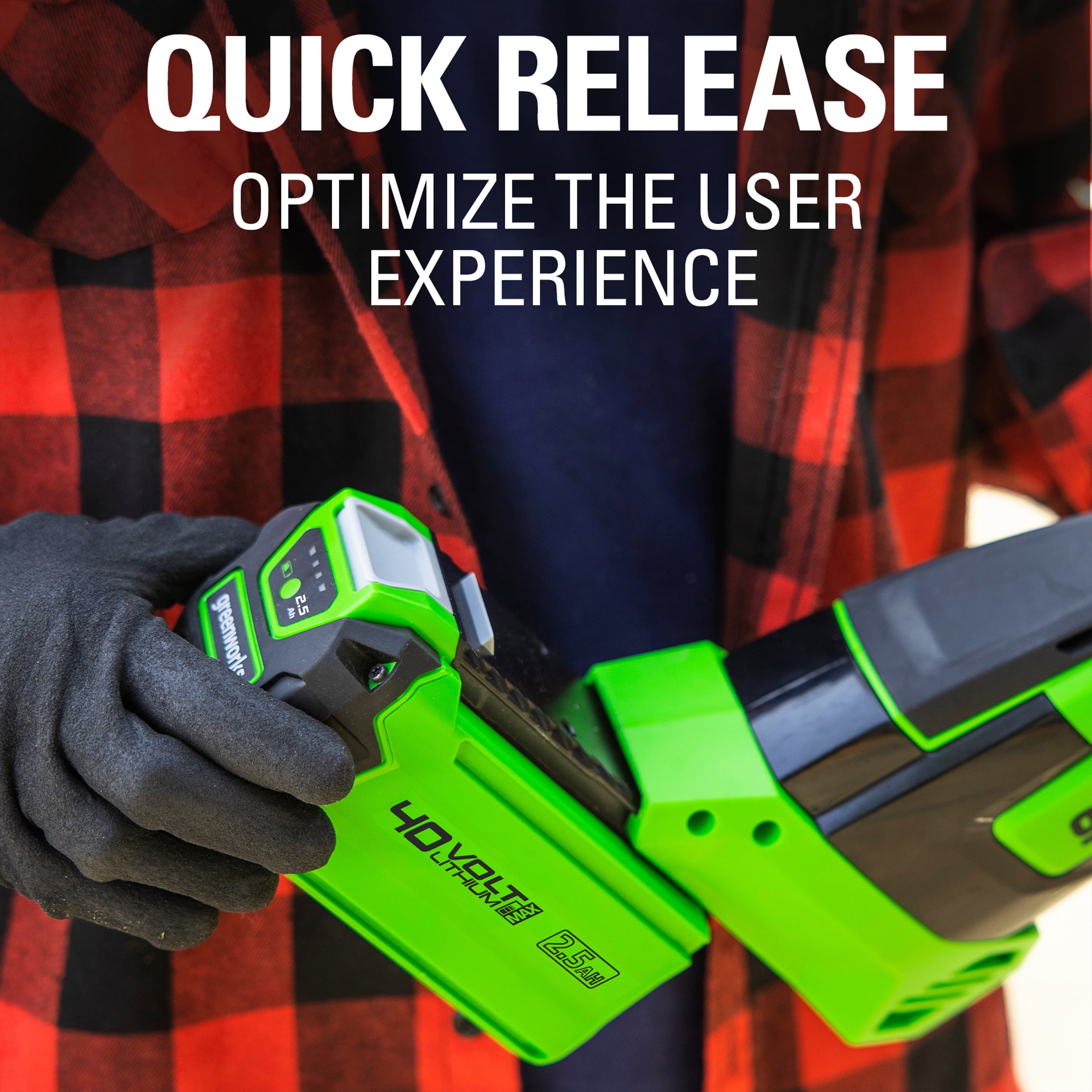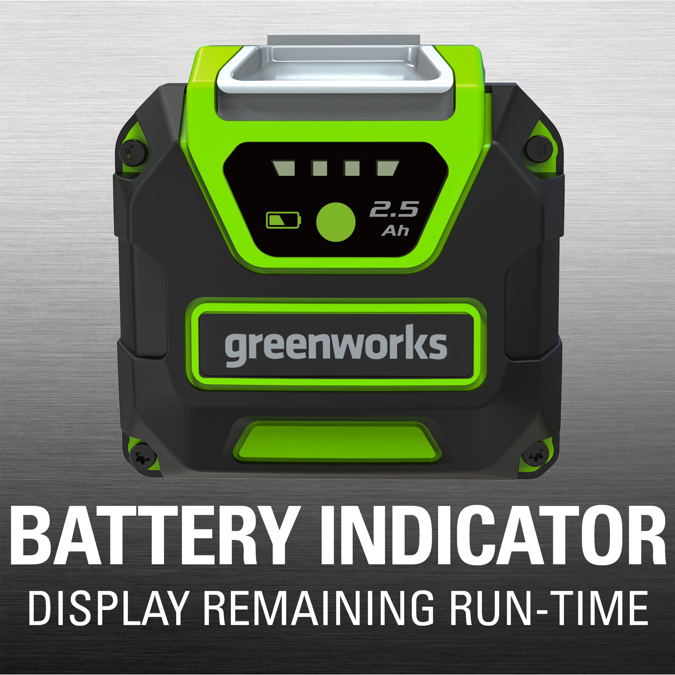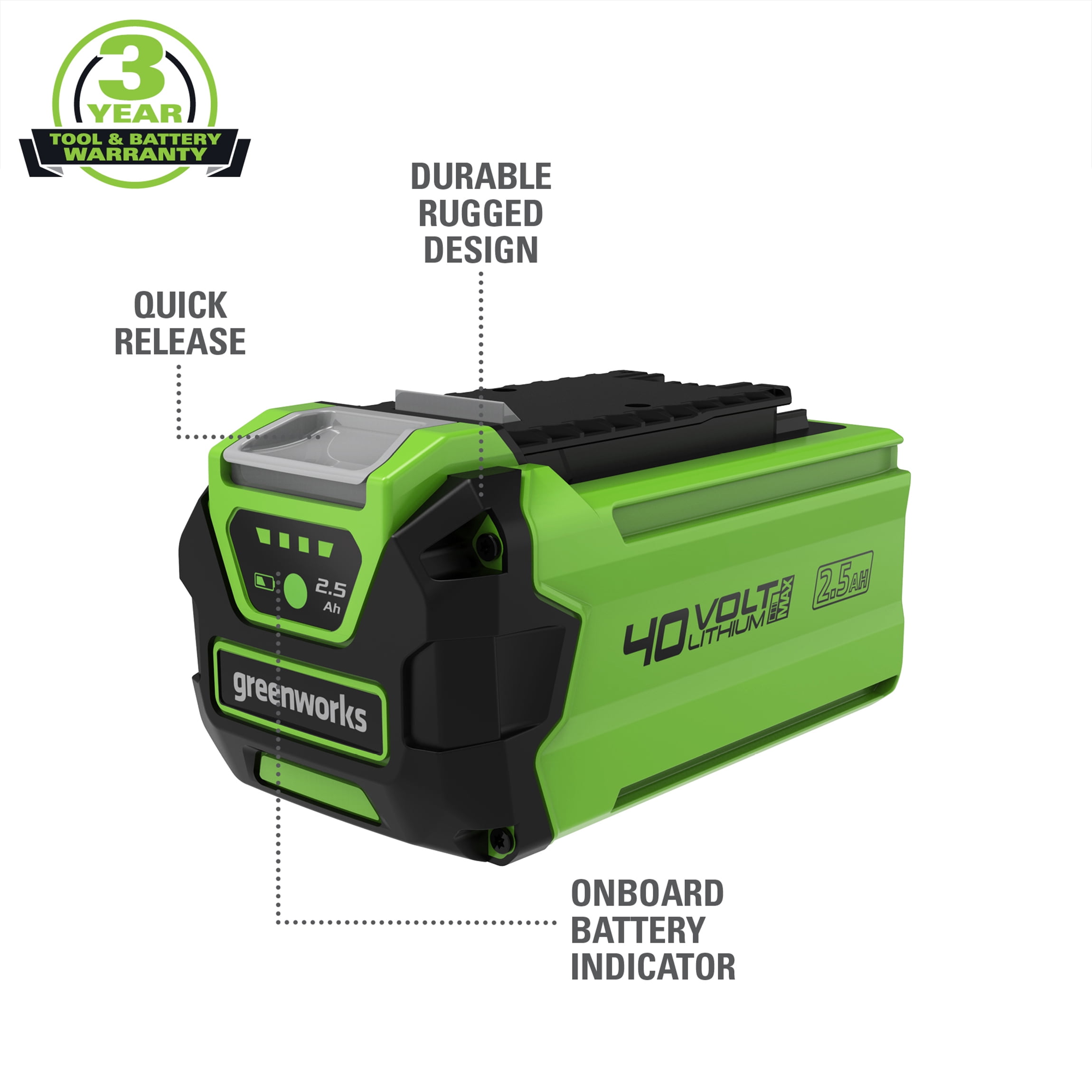 Features of Greenworks 40V 2.5 Ah Battery: High performance G-MAX 40V Lithium-Ion Battery delivers fade-free power with no memory loss after charging One Battery system for 25+ tools offers a complete yard work solution Quick charge time of 90 minutes Easy to use design snaps in and out of tools with USB charging Port Compatible Only with G-MAX 40V tools and charger BAF702 29482 What’s Included: (1) 40V 2.5 Ah Battery (1) Owner’s Manual