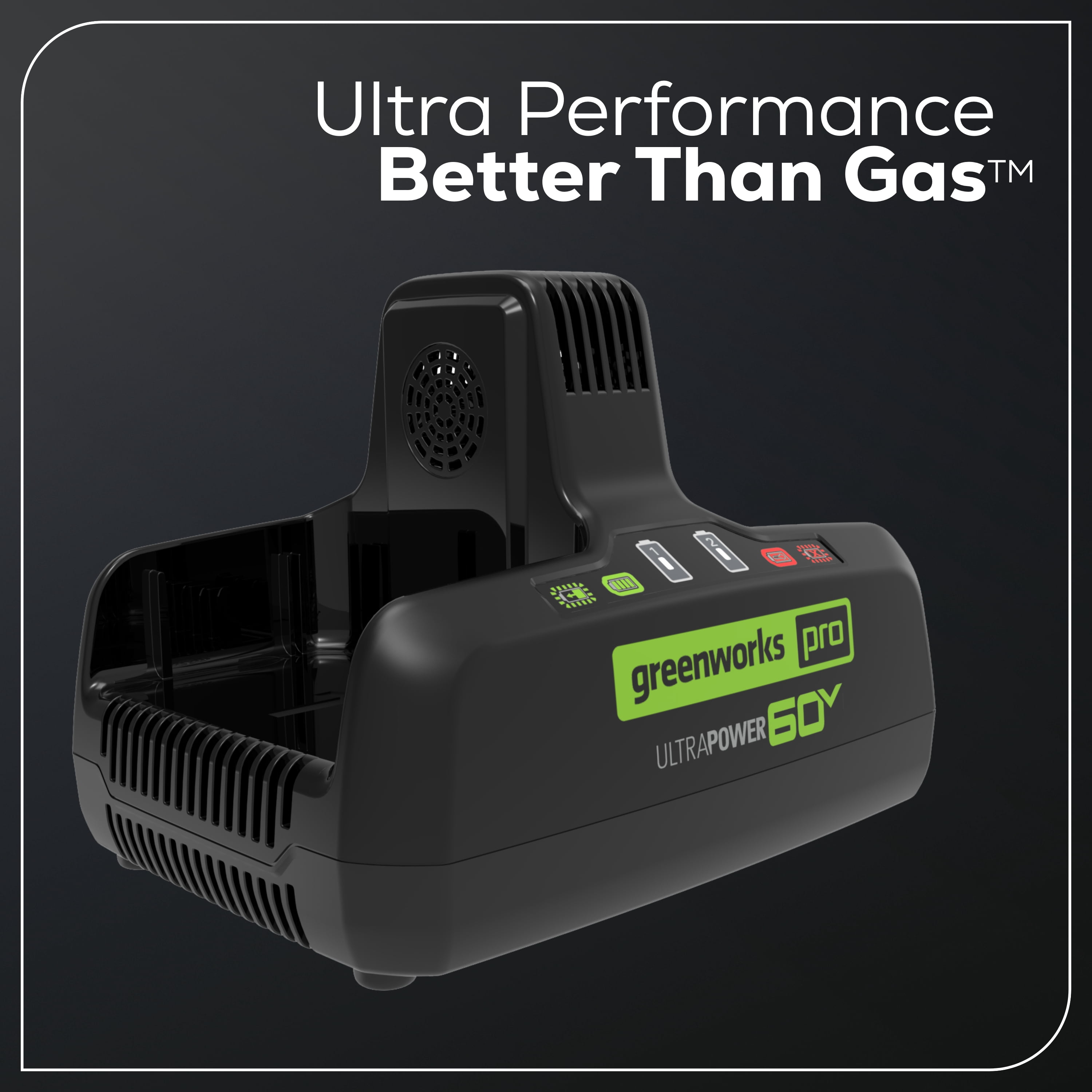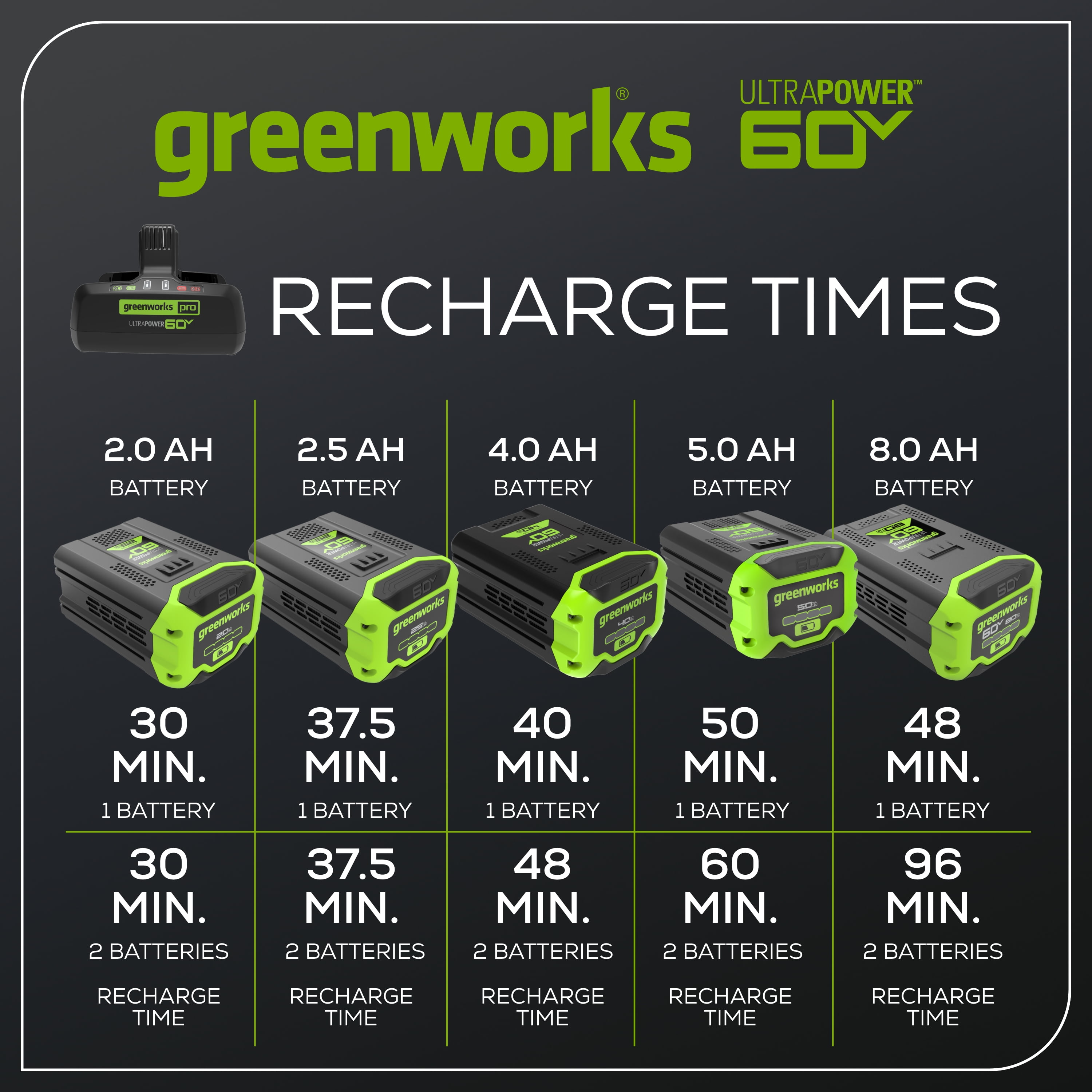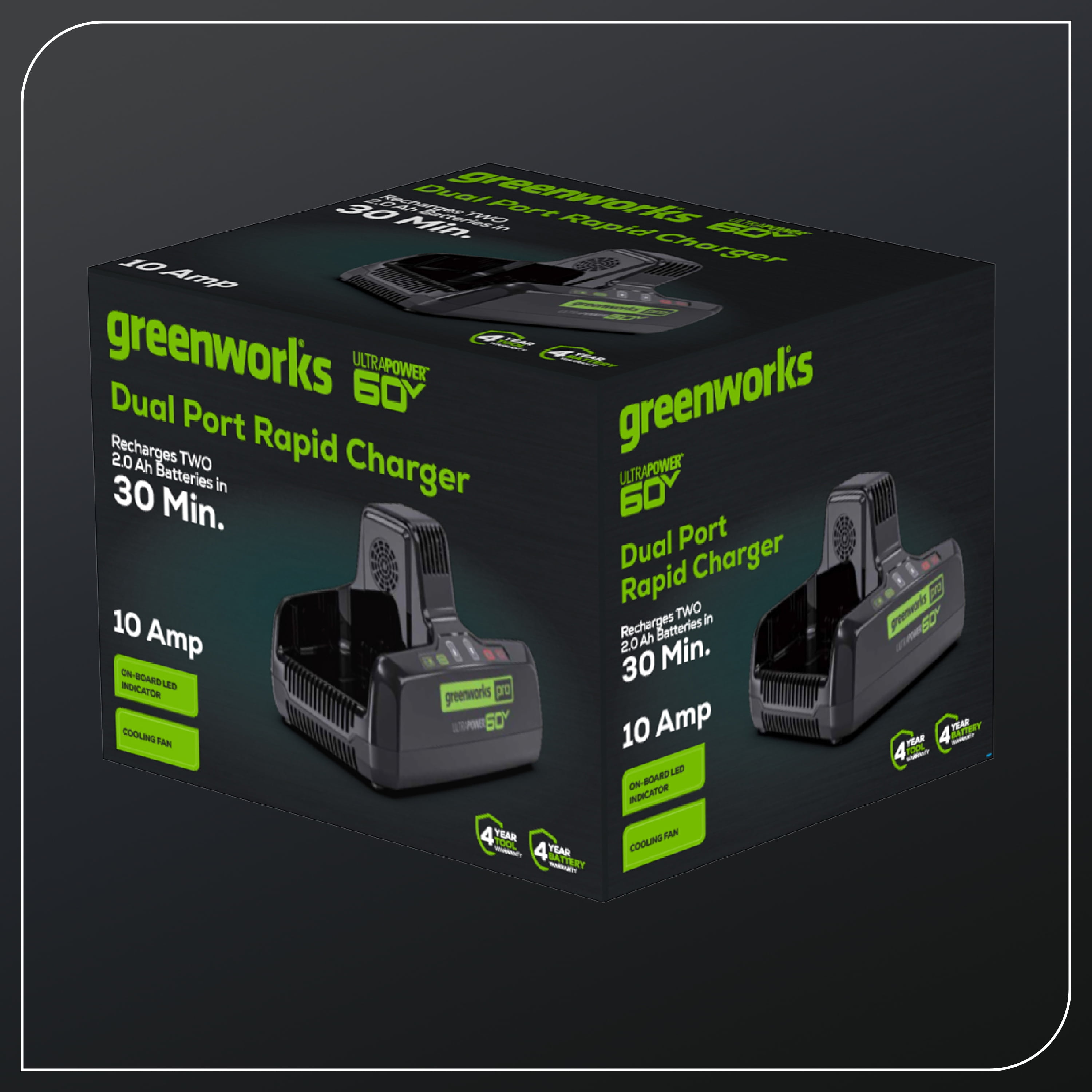 New Greenworks 60V 10Amp Dual-Port Rapid Charger: Recharges two 2.0 Ah batteries in 30 minutes Each 60V charger has an LED indicator that shows the remaining battery charge Delivers fade-free power with no memory loss after charging Charger provides the power needed for maximum performance by simultaneously charging 2 batteries. Compatible with all Greenworks 60-Volt tools