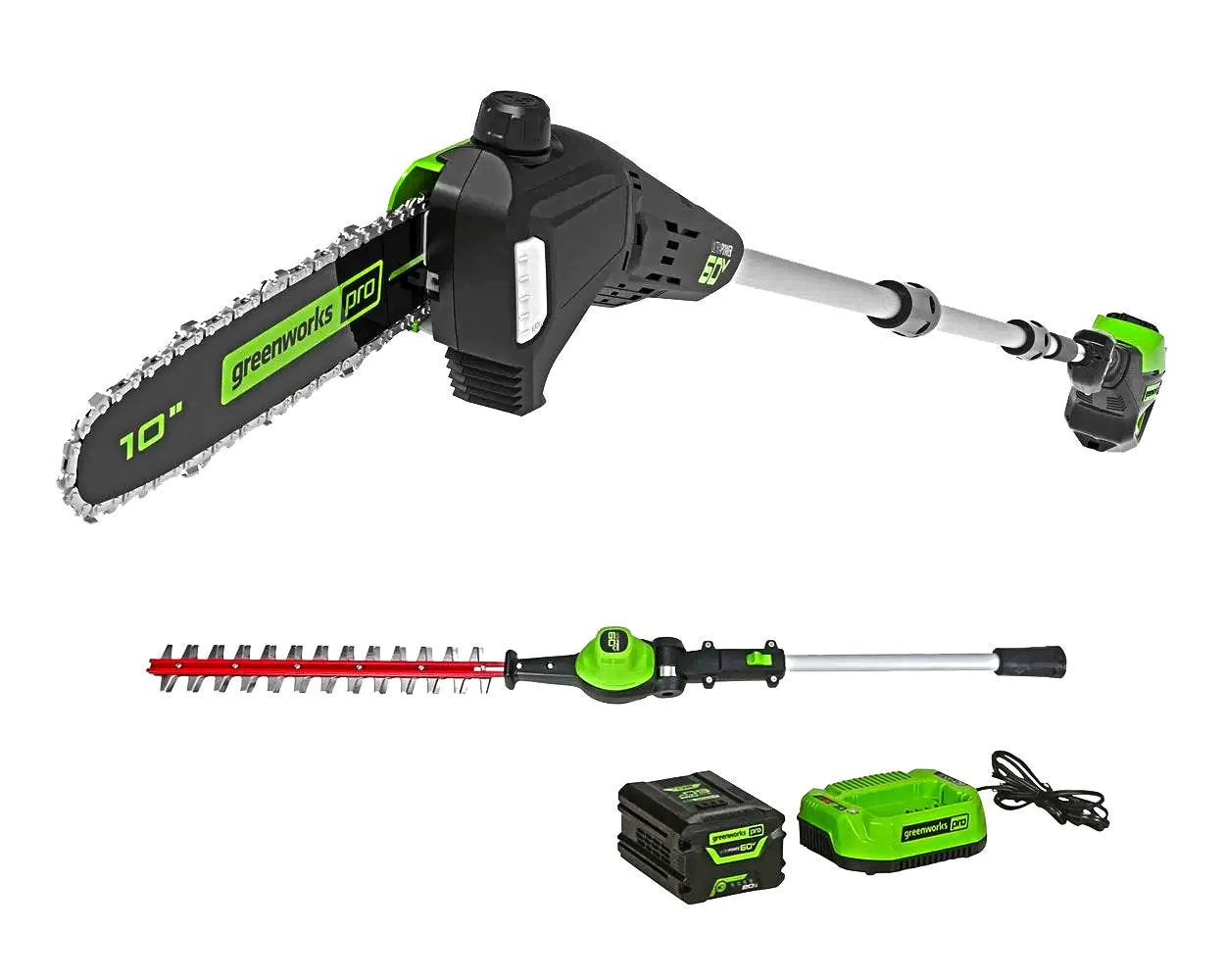 New Greenworks 60V 10″ Cordless Pole Saw & 20″ Pole Hedge Trimmer Combo Kit: Cordless Pole Saw features a 10″ bar with high-performance 1/4″ chain for quick cutting – Cordless Pole Hedge Trimmer features dual-action 20″ laser cut steel blades providing longer life Ideal for yard clean up, storm clean up and general pruning & limbing when extended reach is needed No Prime, No Choke, No Pull. Easy-starting system for fast starts every time, with no aggravating pull cord Advanced brushless motor technology delivers major torque, power, and life, with no maintenance required 2.0 Ah battery & charger included