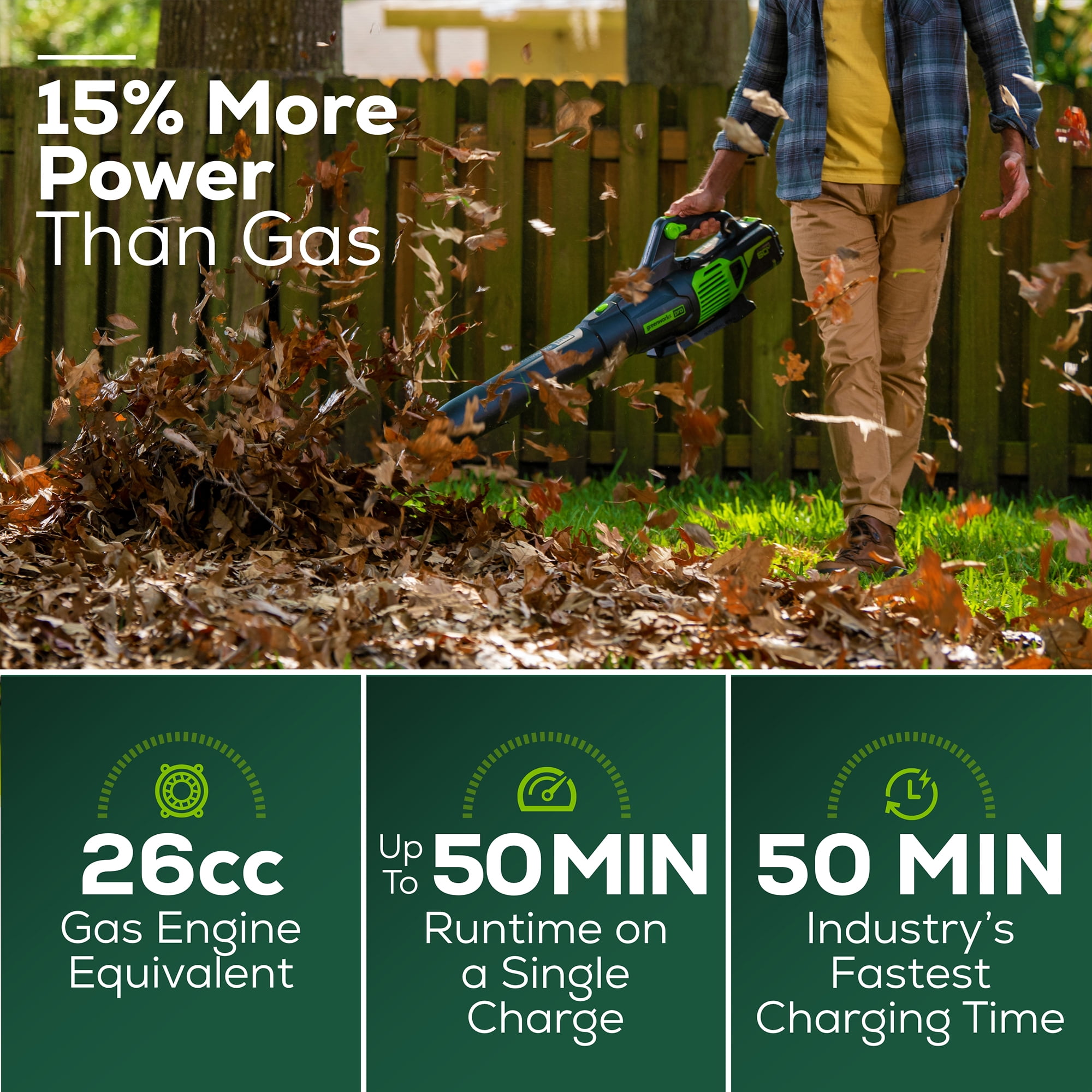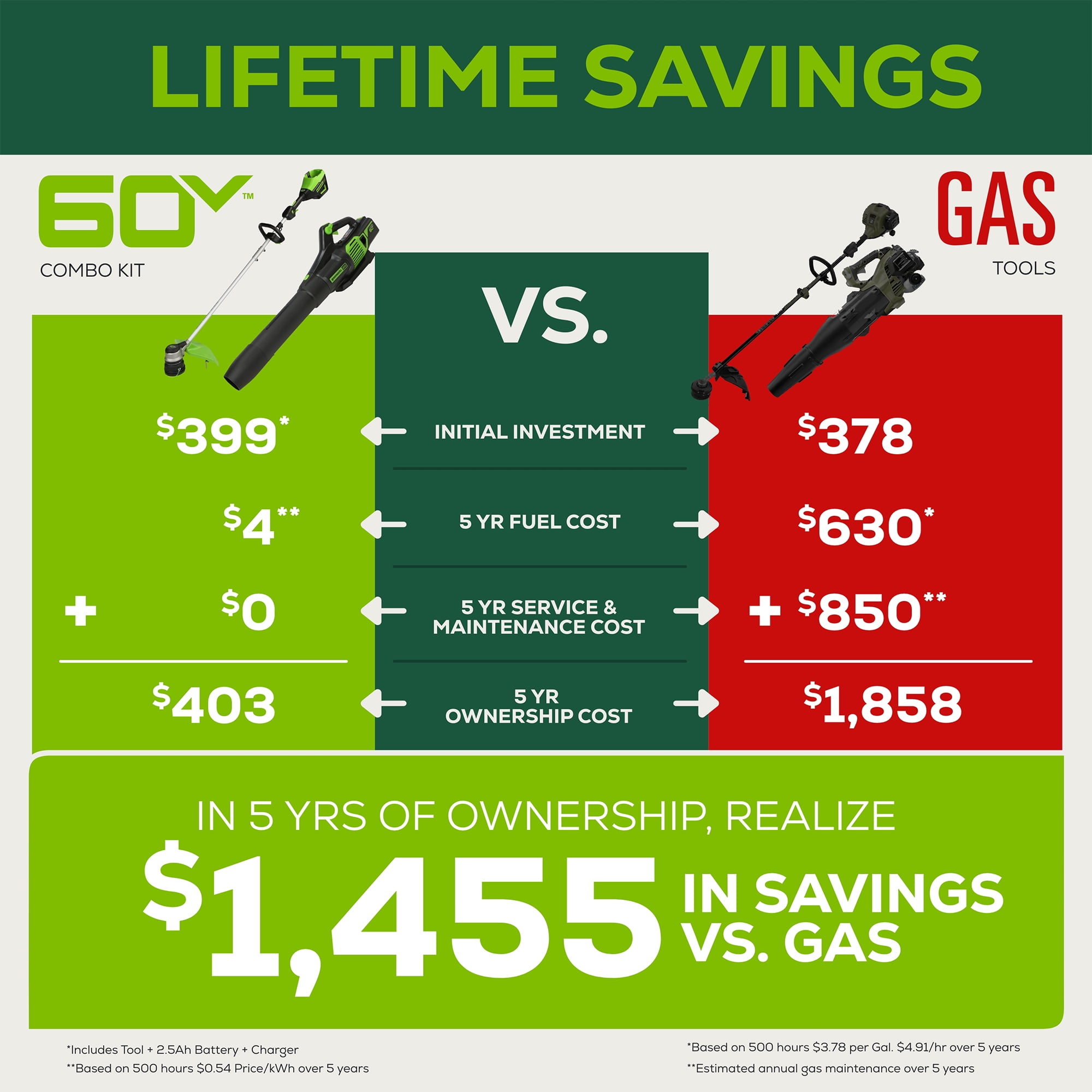 New Greenworks 60V 16″ Brushless String Trimmer: 16″ cutting path with high visibility guard for larger yard projects Dual feed .095″ spiral twist line tackles even the toughest and thickest weeds Compact and lightweight for comfort, control, and less fatigue – 25% lighter than comparable gas-powered models Durable die-cast aluminum trimmer head is made to last New Greenworks 60V 610 CFM Brushless Leaf Blower: Incredible power and performance, with blowing force of 130 MPH max air speed and 610 CFM max air volume Compact and lightweight for comfort, control, and less fatigue – 20% lighter than comparable gas-powered models Jet Fan Technology provides the best power-to-weight ratio in the industry Variable speed trigger with cruise control & turbo button for maximum performance and air control Concentrator nozzle increases air speed for stubborn debris Shared features: Includes 60V 2.5 Ah battery and charger Highly efficient brushless motor provides more torque, quiet operation and longer life