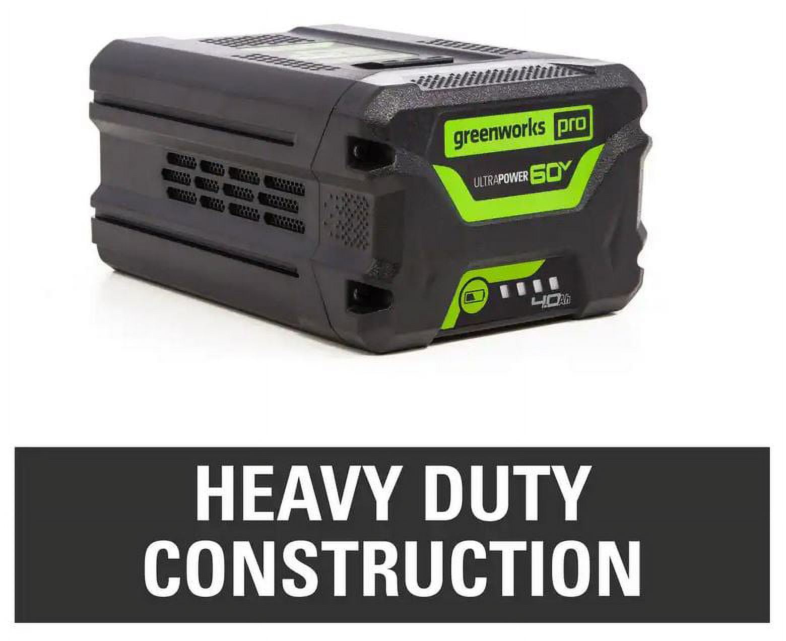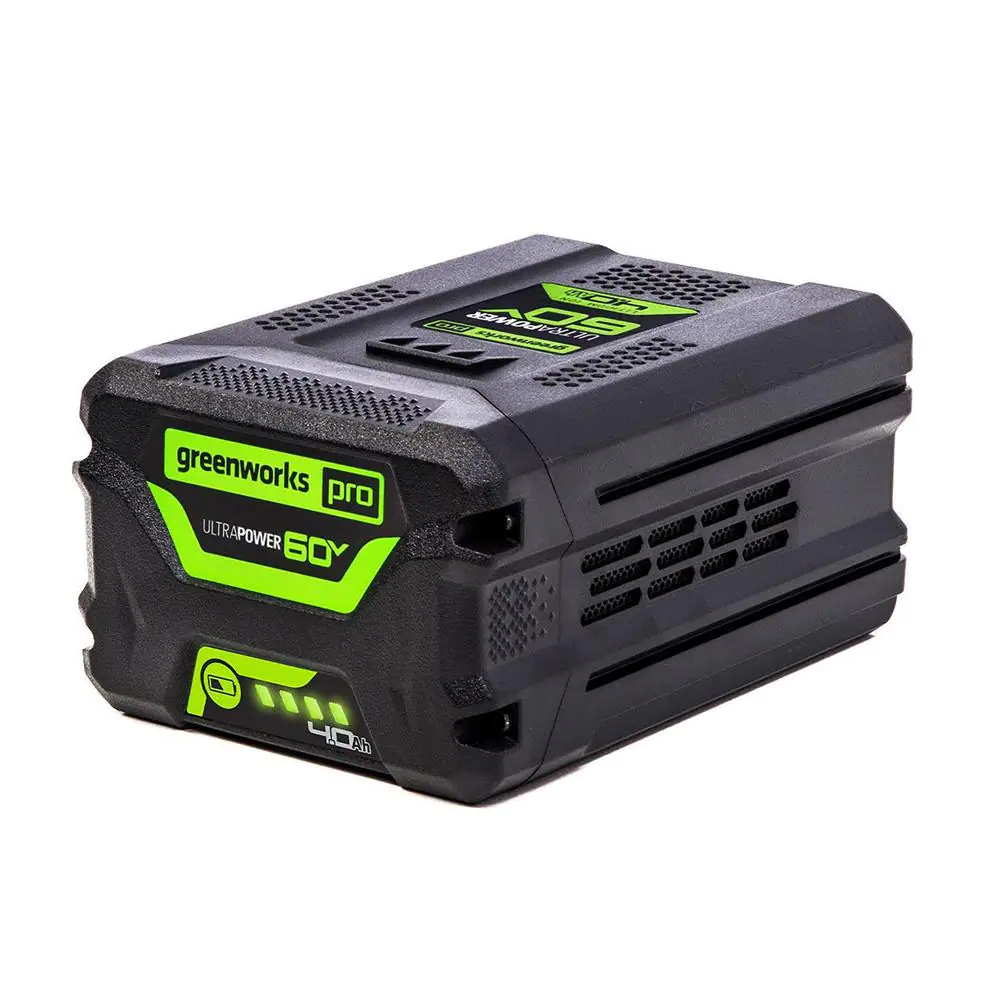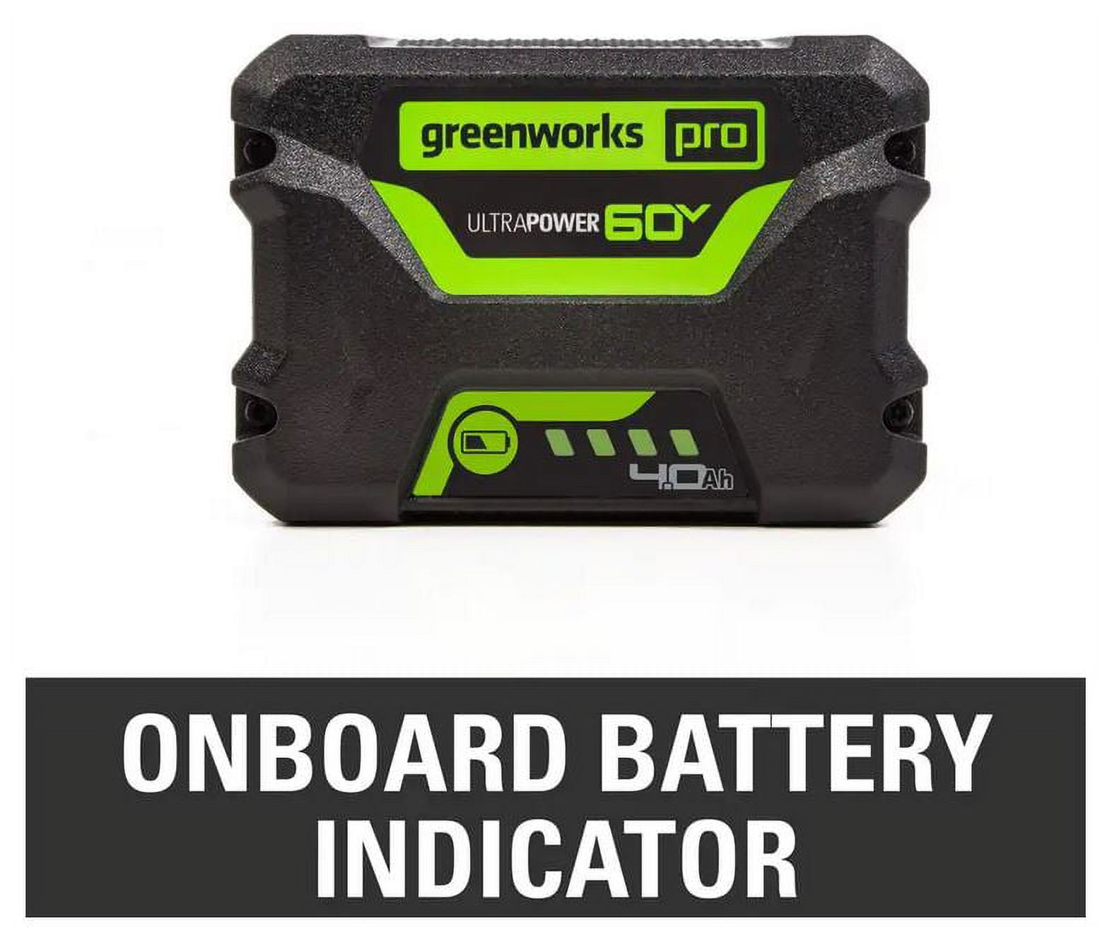 New Greenworks 60V 4.0Ah UltraPower Battery: Delivers fade-free power with no memory loss after charging On-board battery fuel indicator allows for on-demand reference of remaining power Compatible with all Greenworks 60V tools – pop the battery out of your cordless lawn mower and into your cordless string trimmer, leaf blower, chainsaw and more