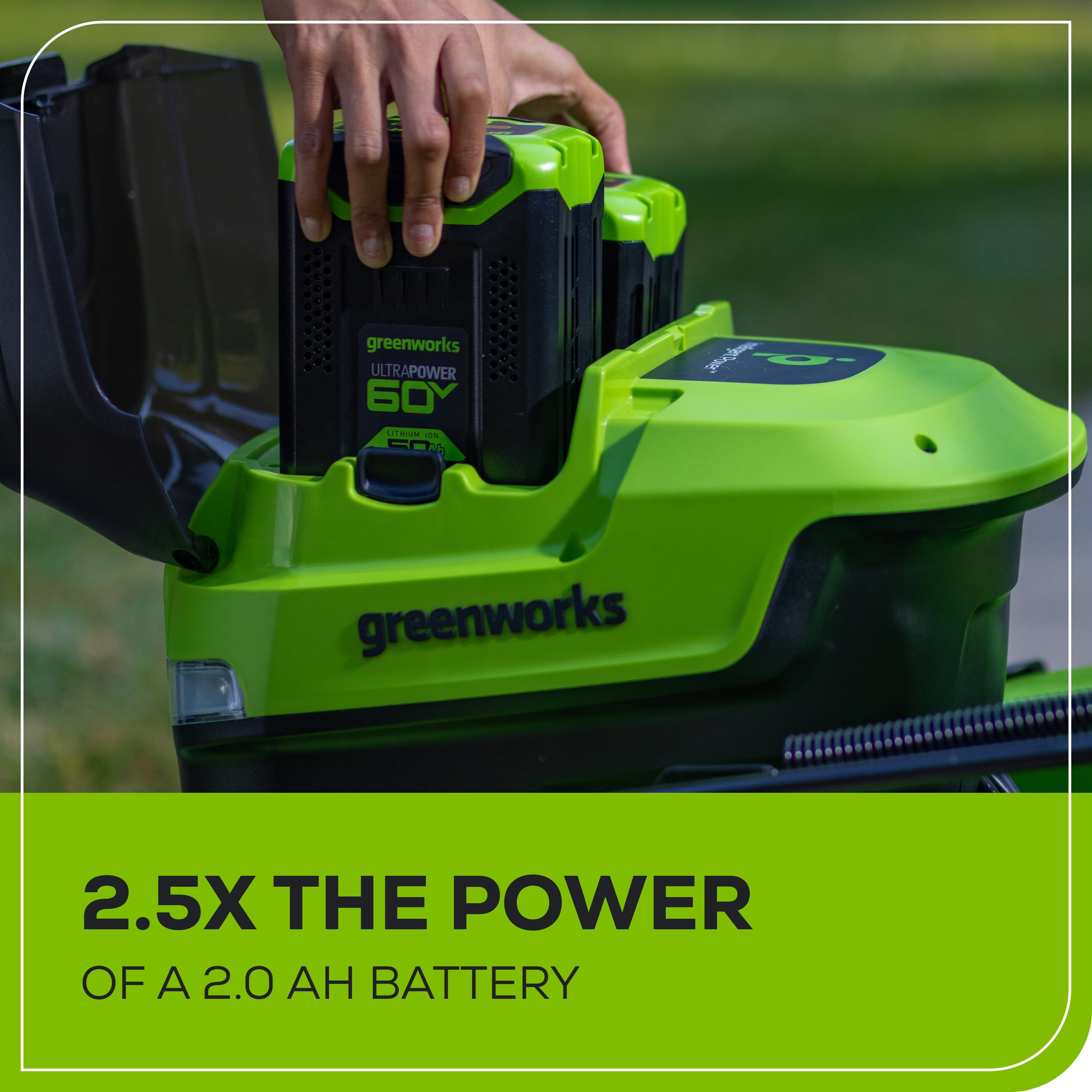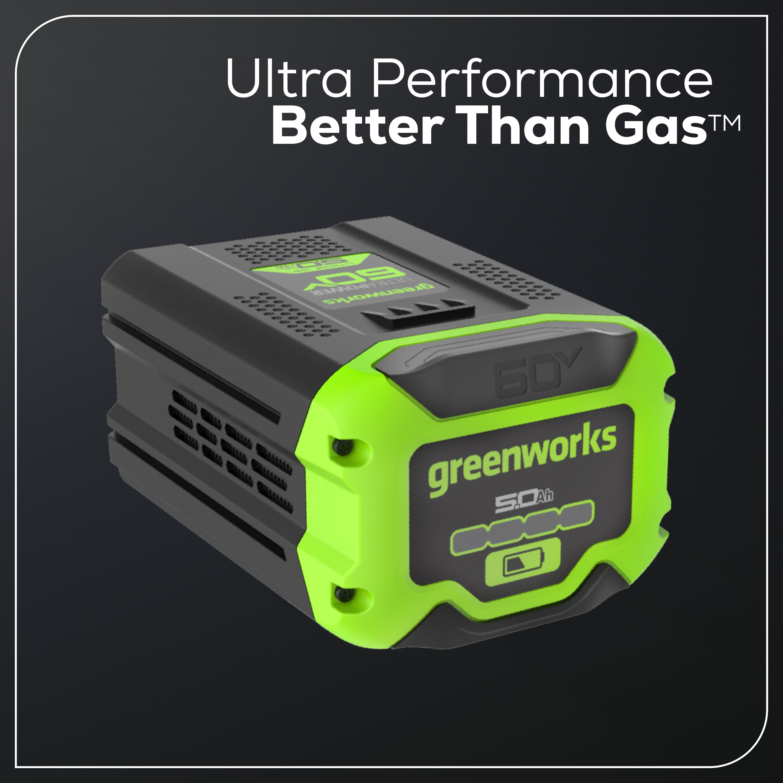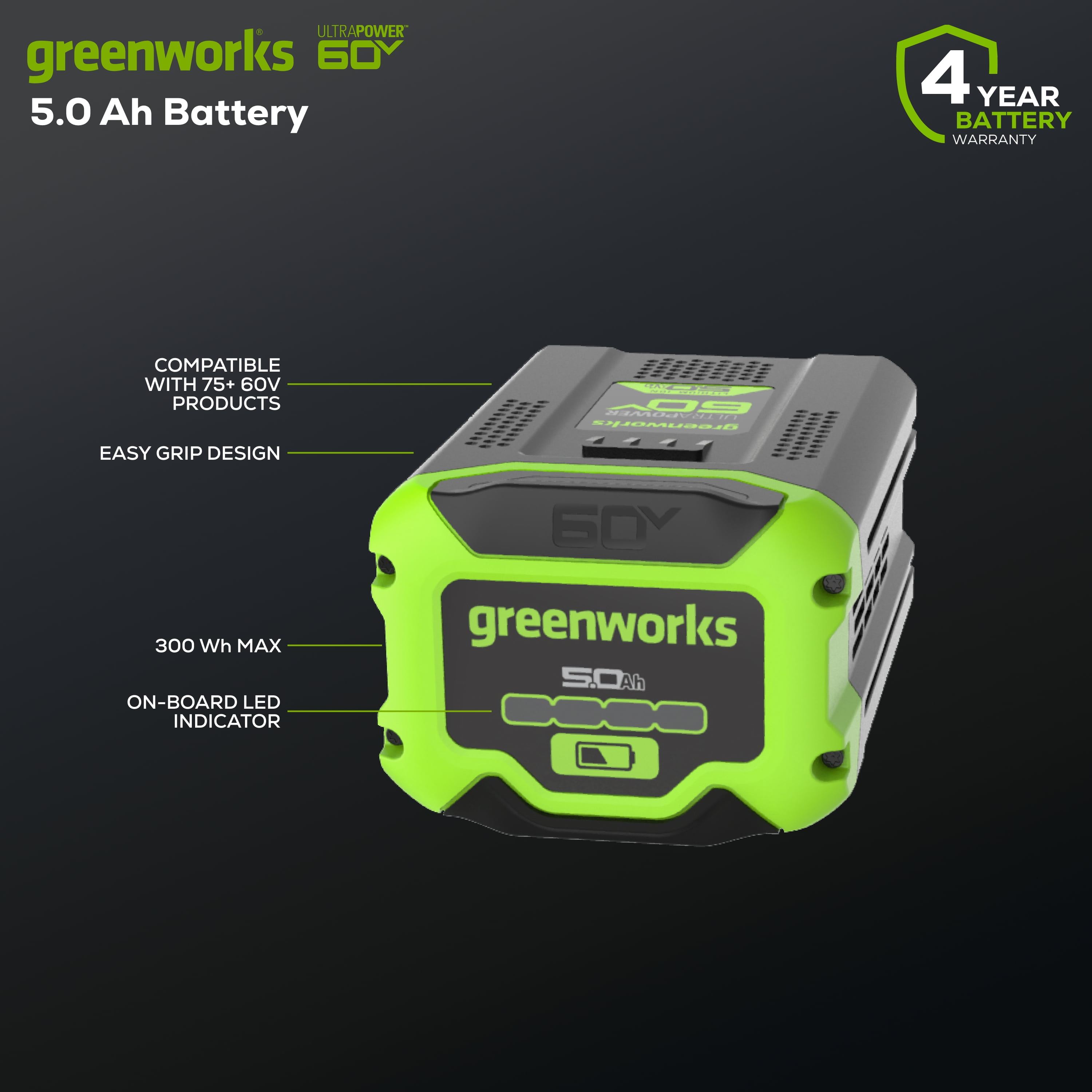 New Greenworks 60V 5.0 Ah HC Battery: Provides the power you need for maximum performance Compatible with all Greenworks 60V tools Battery delivers fade-free power with no memory loss after charging On-board battery fuel indicator allows for on-demand reference of remaining power Product Weight: 4.69 lbs