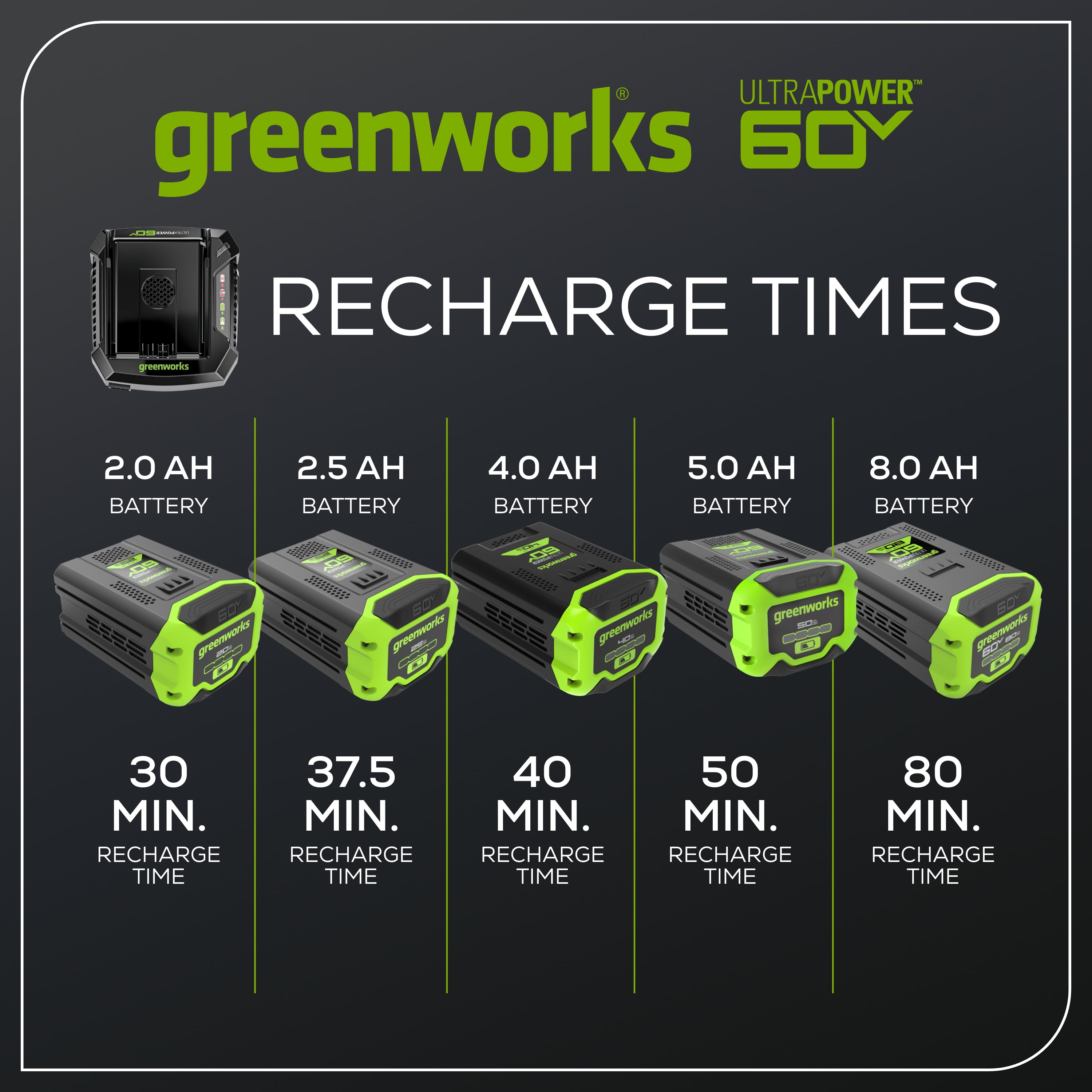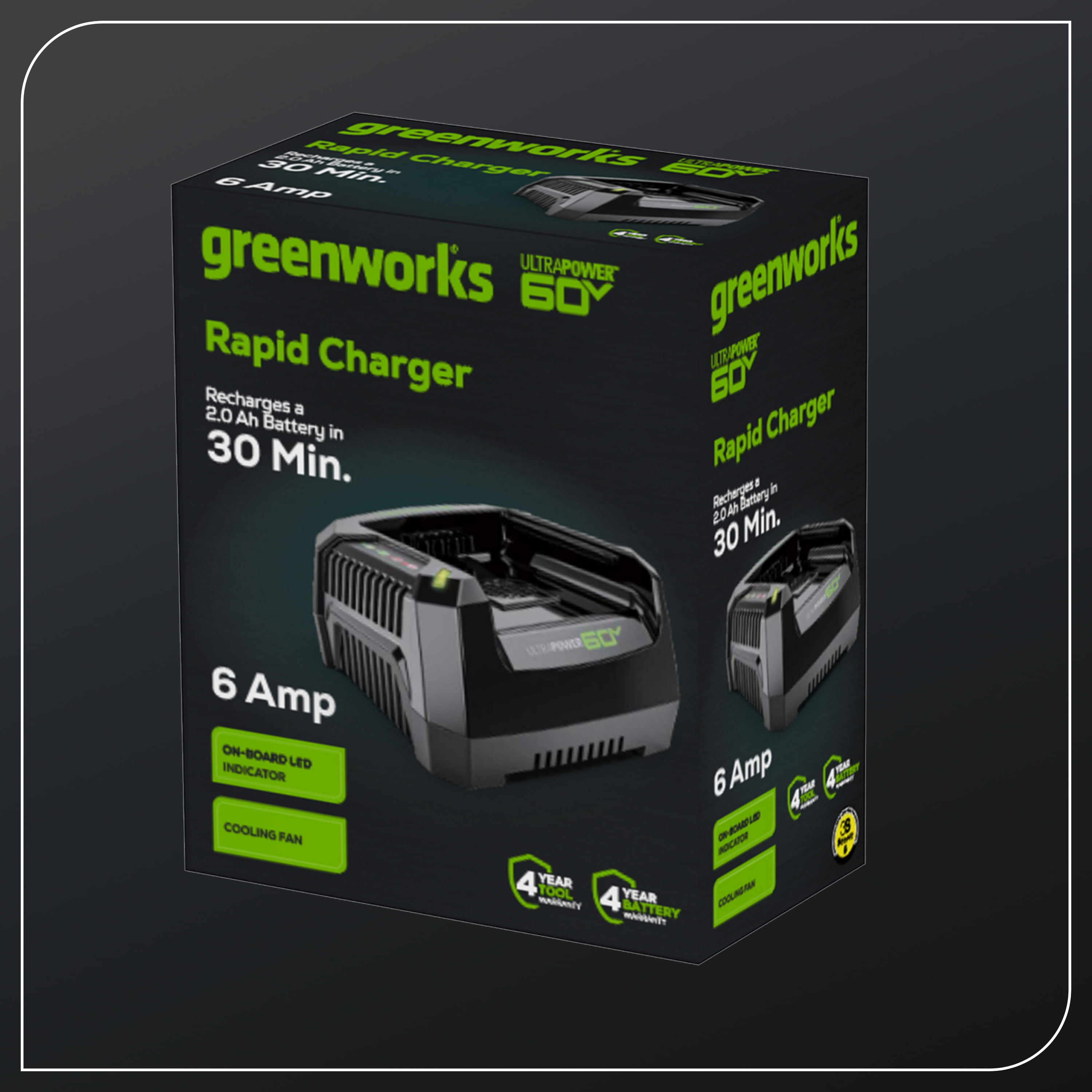 New Greenworks 60V 6Amp Rapid Charger: Recharges a 2.0 Ah battery in 30 minutes Delivers fade-free power with no memory loss after charging Each 60V charger has an LED indicator that shows the remaining battery charge Charger provides the power needed for maximum performance Compatible with all Greenworks 60-Volt tools