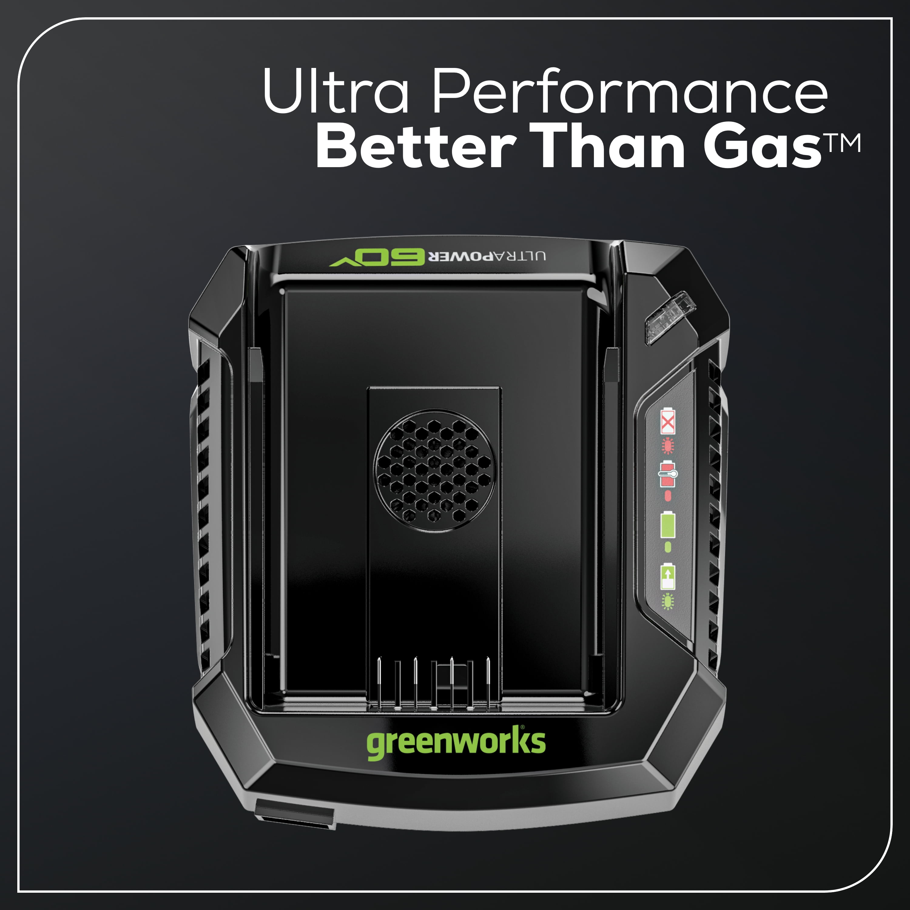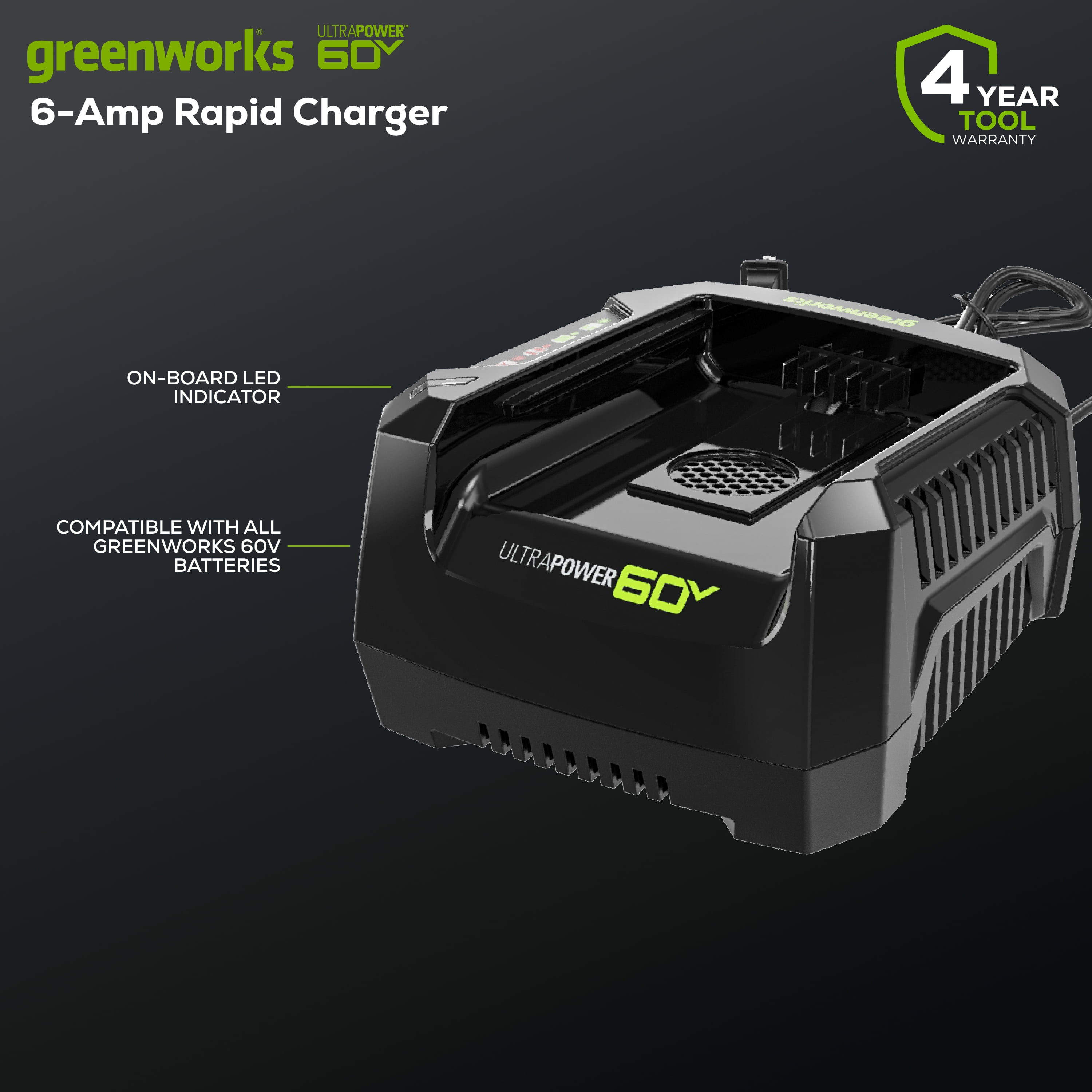 The Greenworks 60V UltraPower 6-Amp Rapid Battery Charger is compatible with over 75+ Greenworks tools to power all types of projects. The 6-amp battery charger includes a diagnostic LED indicating current charge level, battery temperature and issue display. It is backed by a 4-year limited warranty, so you can be 100% sure you are getting fantastic quality. This rapid battery charger can be wall-mounted or used on bench tops for added versatility.