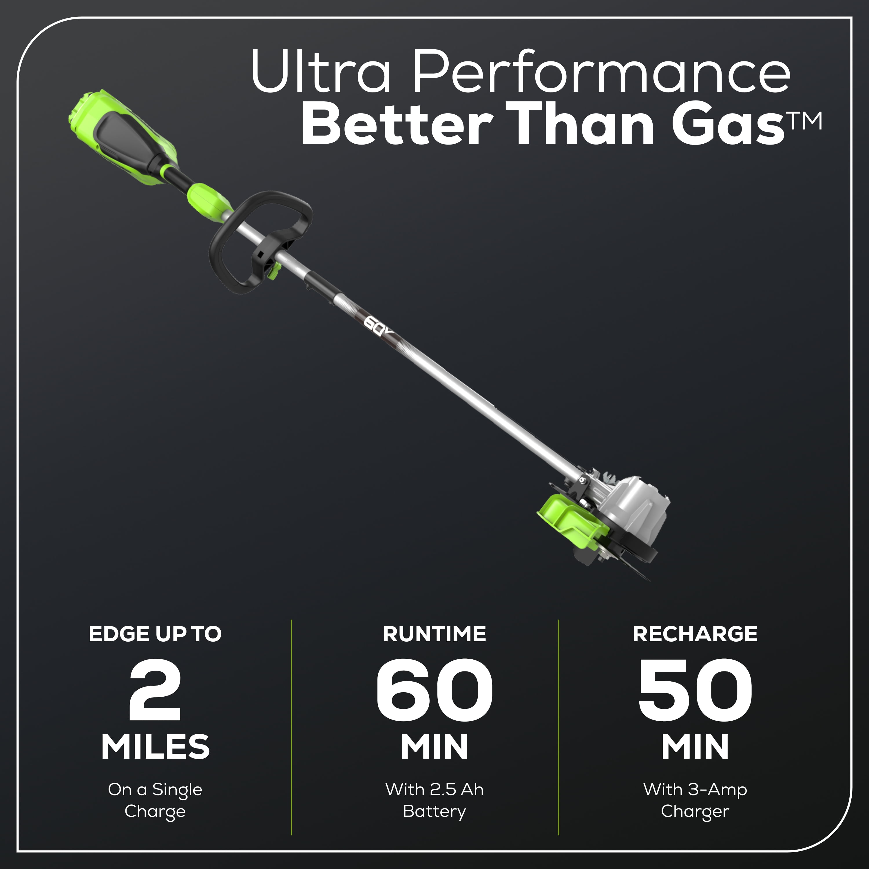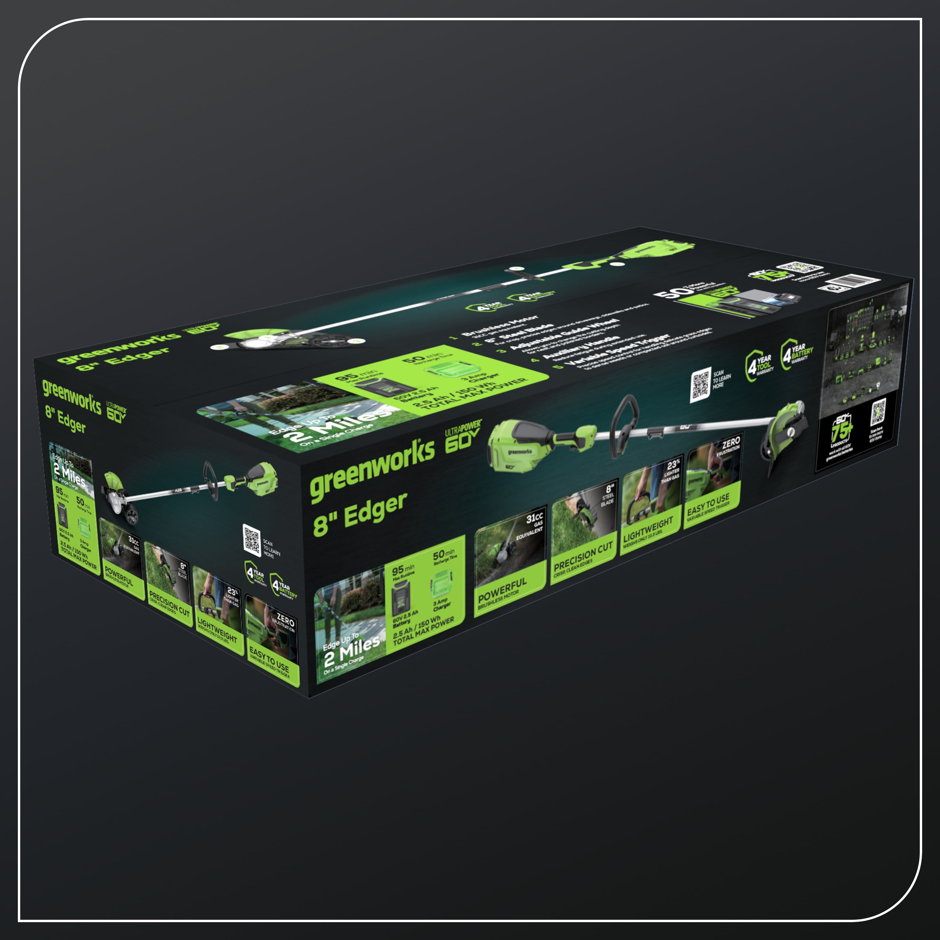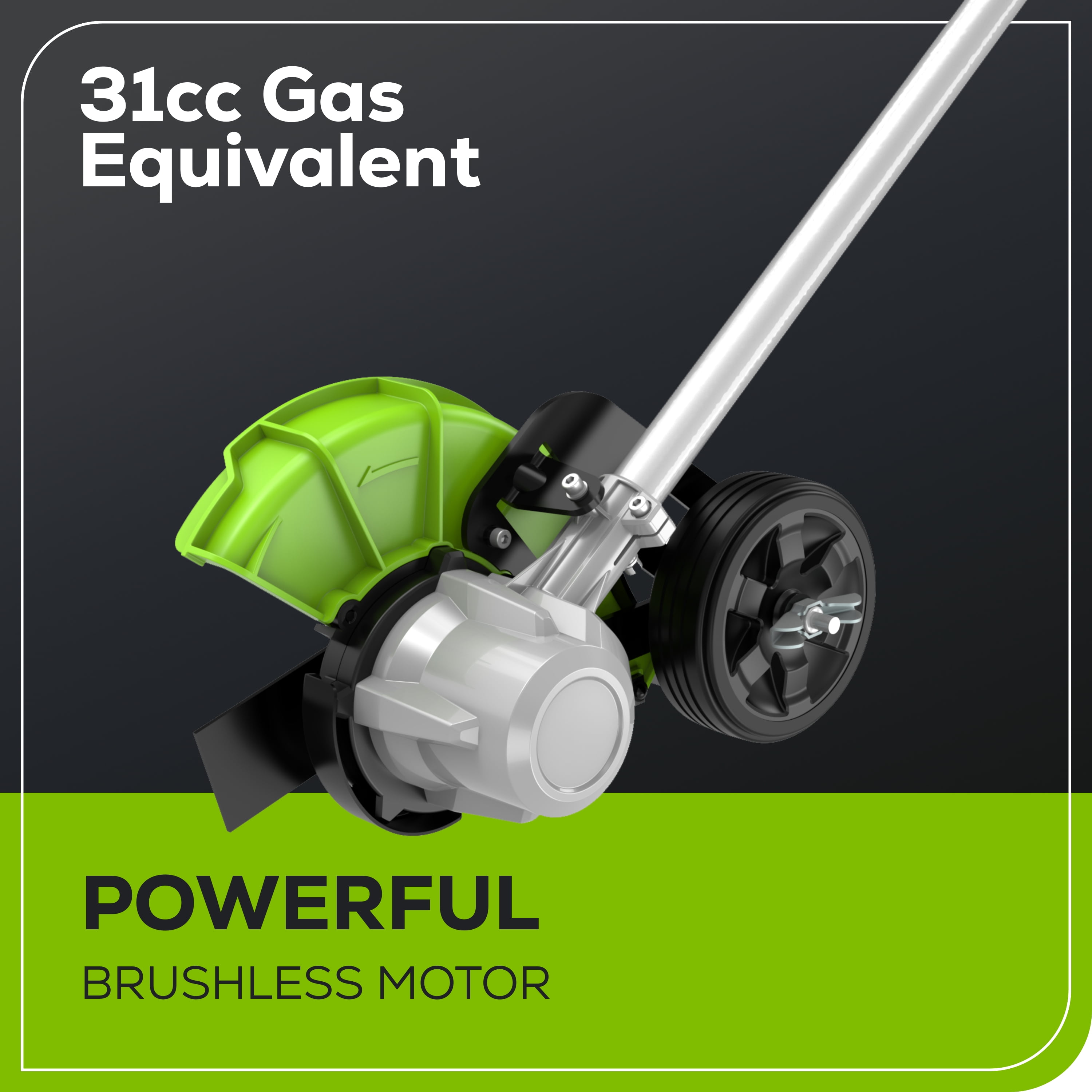 New Greenworks 60V 8″ Edger: Runtime: Trim up to 2 miles on a single charge Power equivalent: Constant 31cc gas-equivalent power 8″ Steel Blades: For crisp clean edges Variable speed trigger: For on demand power Design: Lightweight and ergonomic design for comfort and control; 23% lighter than gas String Trimmer Type: Walk Behind Battery Platform: Battery powers 75+ 60V Greenworks products