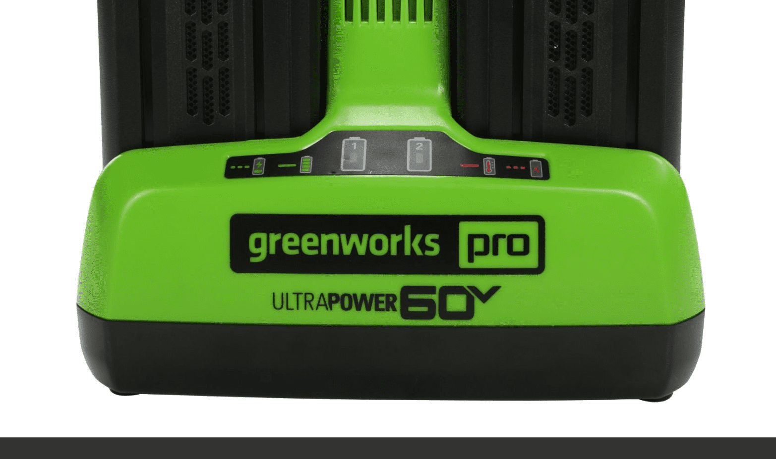 New Greenworks 60 Volt UltraPower 6 Amp Dual-Port Battery Charger: Diagnostic LED indicator communicates current charge level, battery temperature & any battery issues Simultaneously charges two Greenworks 60V batteries Compatible with all Greenworks 60V batteries