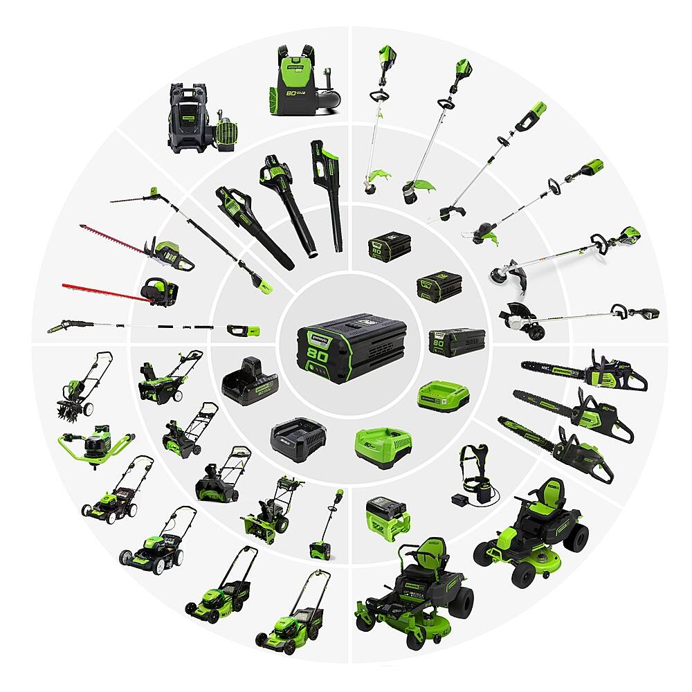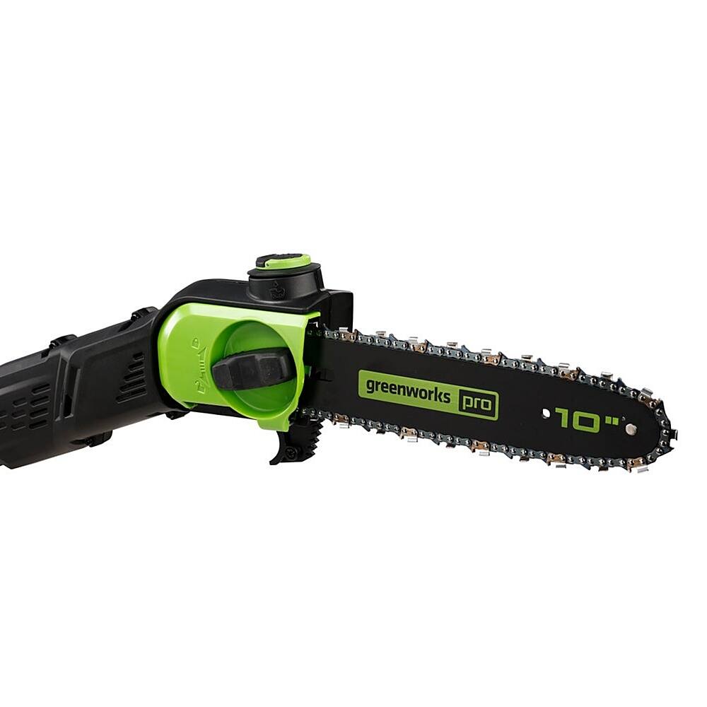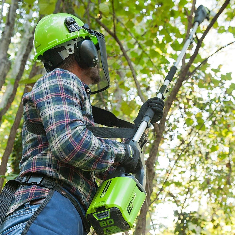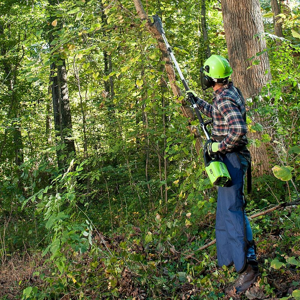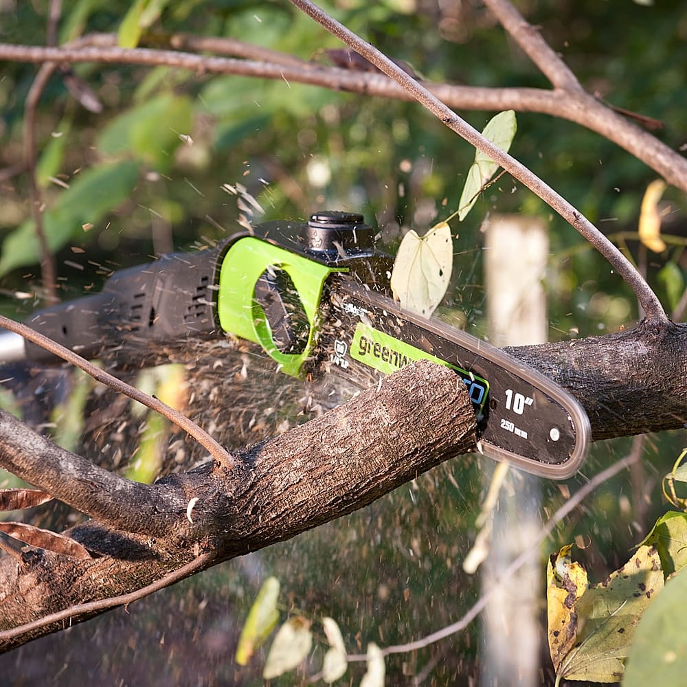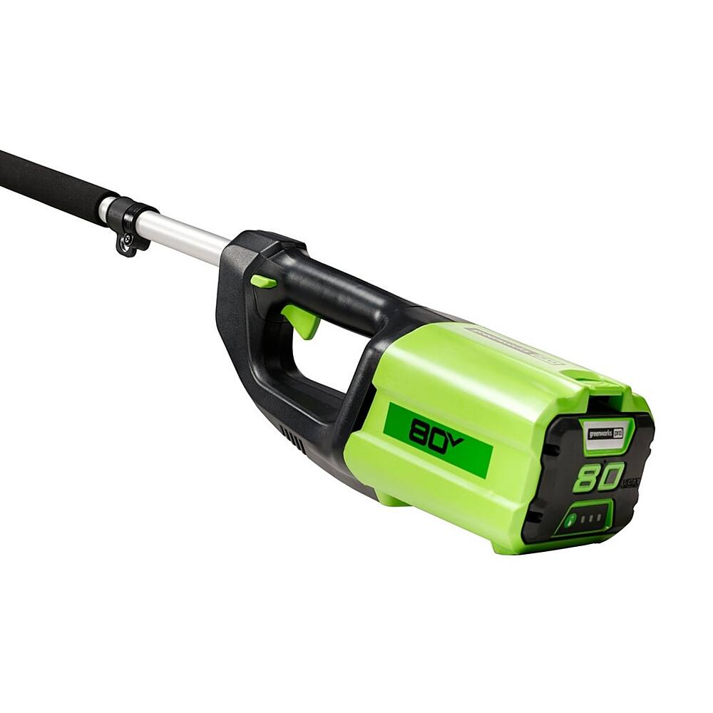 Trim high limbs with ease with the Greenworks 80V battery-powered pole saw. With up to 83 cuts on a single charge, this lightweight, quiet-running saw features chain speeds up to 32.15 ft/s for fast cuts with no bogging down. With hassle-free, trigger starts, you’ll get to work fast, with no priming, no choke, and no pull cord; plus, battery fully recharges in just 30 minutes. Greenworks exclusive Intelligent Power combines TRUBRUSHLESS motor technology, lithium-ion battery power, superior cutting, and ultra-fast control systems for power output equivalent to a 25cc gas-powered motor.