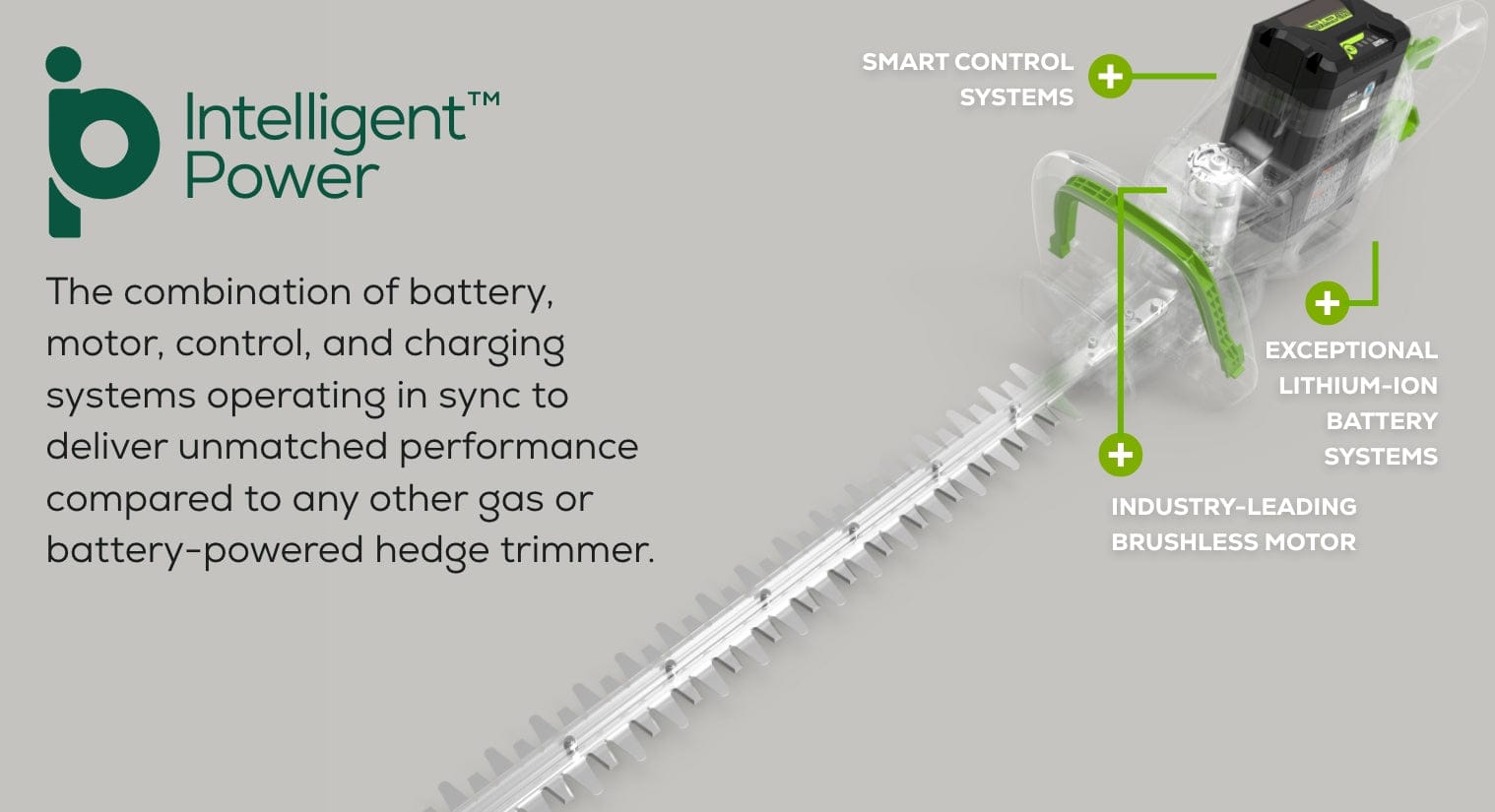 Enjoy constant, fade-free power with no dangerous emissions, smells, hassles, or maintenance with the battery-powered Greenworks 80V 26” hedge trimmer. Limbs up to 1.1” are no match for this lightweight, quiet-running trimmer. It features dual-action, 26” laser-cut steel cutting blades and consistent cutting speeds up to 3,200 strokes per minute for fast, efficient cuts. The 180-degree rotating rear handle delivers precision cutting at any angle, and an over-molded, wrap-around front handle provides three-sided gripping for ultimate comfort and control. Greenworks unrivaled Intelligent Power combines TRUBRUSHLESS motor technology, lithium-ion battery power, and ultra-fast control systems for powerful output. Includes 2.0 Ah battery and rapid charger. Battery is compatible with 75+ Greenworks 80V products. Life. Powered. By Greenworks.