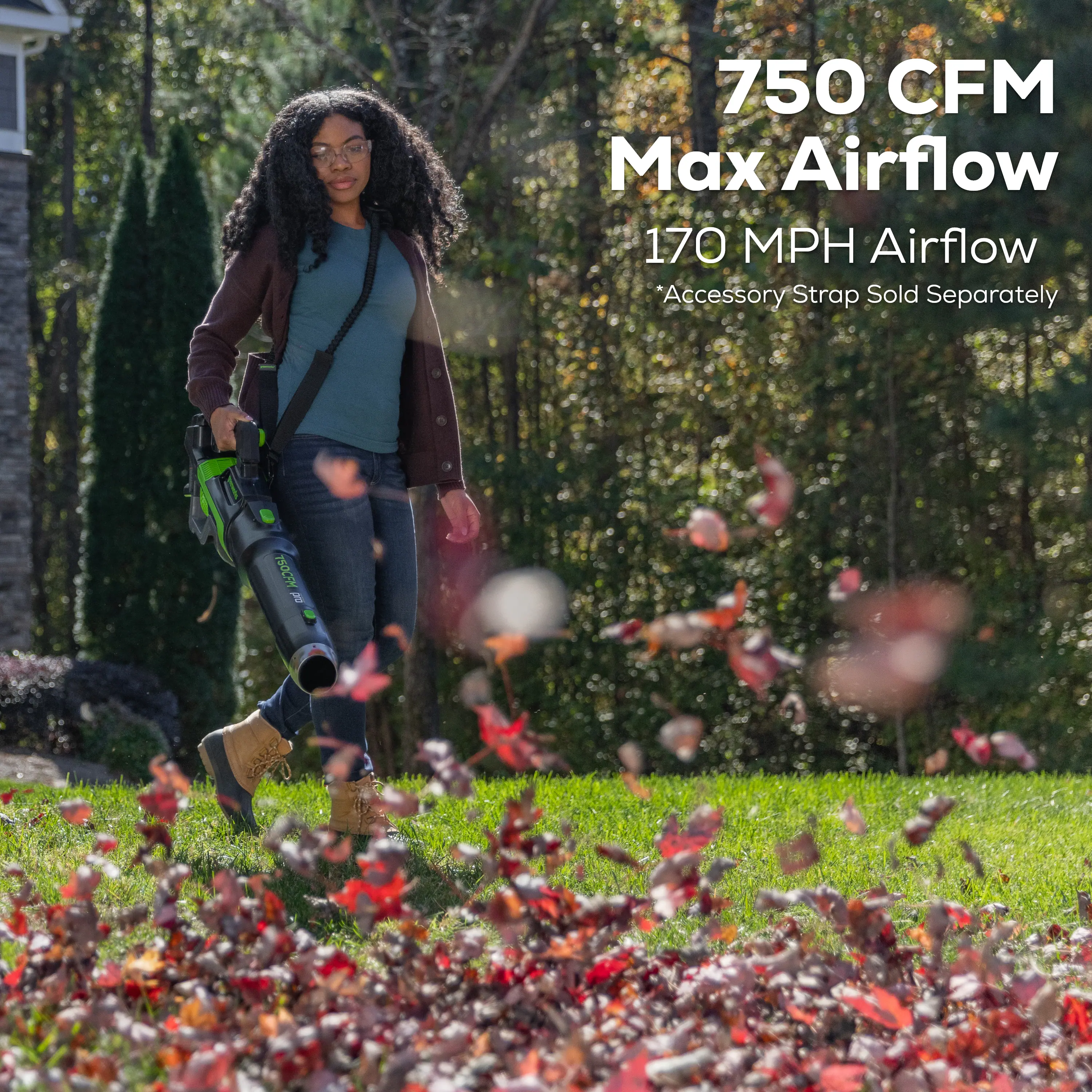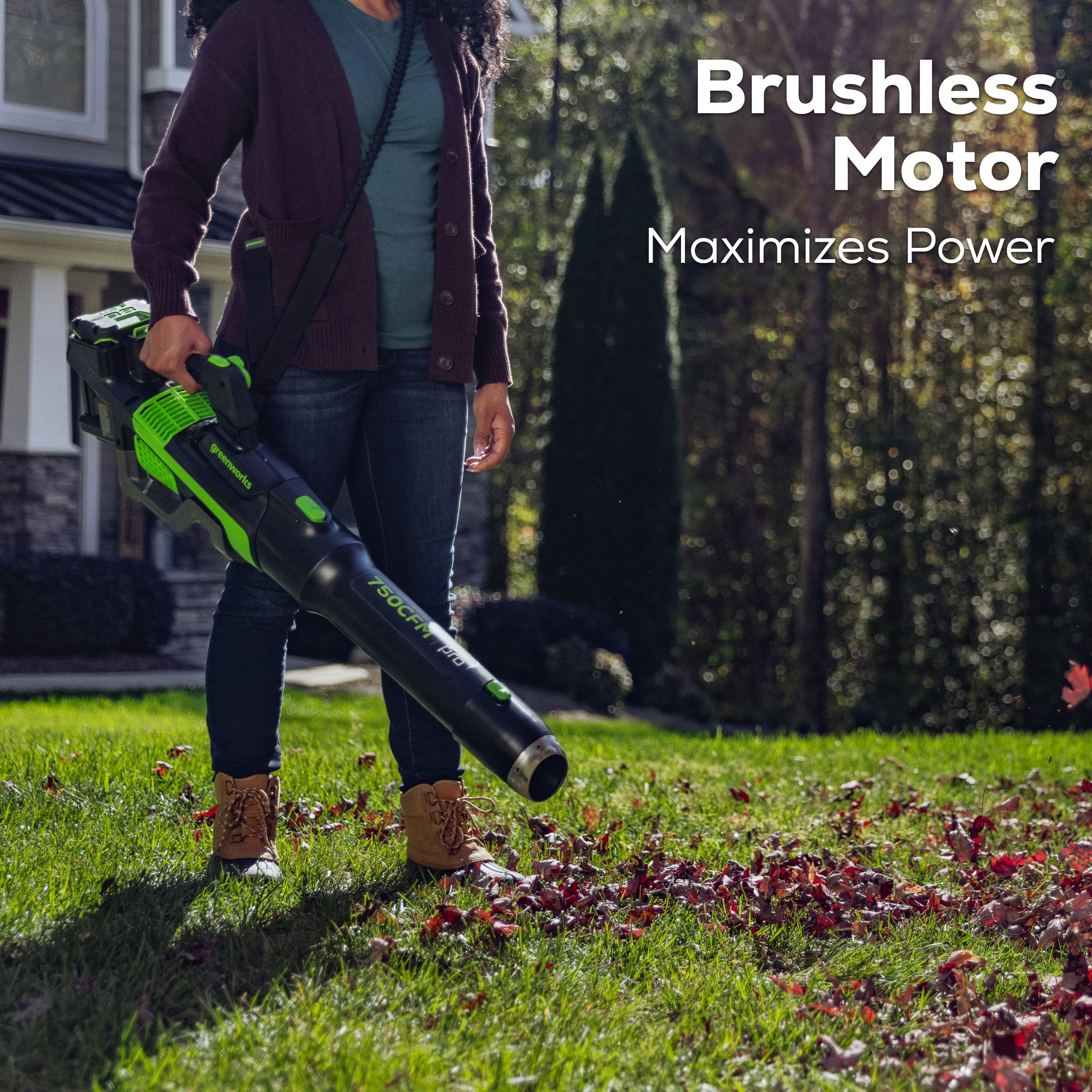 Heavy, wet leaves and other stubborn debris are no match for the Greenworks 80V battery powered handheld leaf blower. The jet fan design provides up to 750 CFM of constant airflow for blasting through heavy, wet leaves and tough debris with ease; and a variable speed trigger delivers on-demand power and up to 170 MPH of high-velocity air speeds. It’s one of the most powerful battery-powered handheld blowers in the industry, with Greenworks exclusive Intelligent Power that combines Brushless motor technology, lithium-ion battery power, and ultra-fast control systems for power output equivalent to a 26cc gas-powered motor. Includes 2.5 Ah battery and rapid charger. Battery is compatible with 75+ Greenworks 80V products. Life. Powered. By Greenworks.
