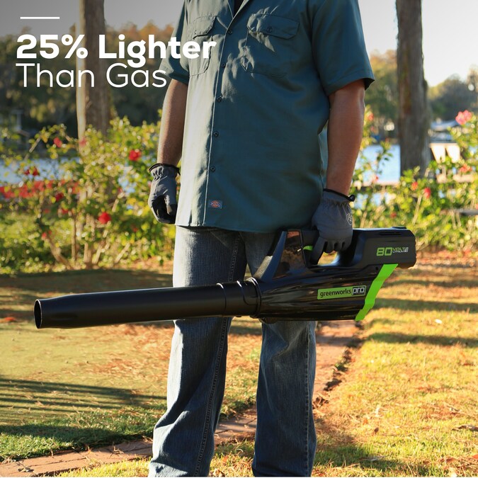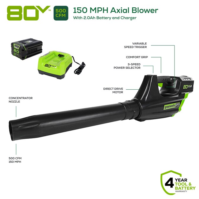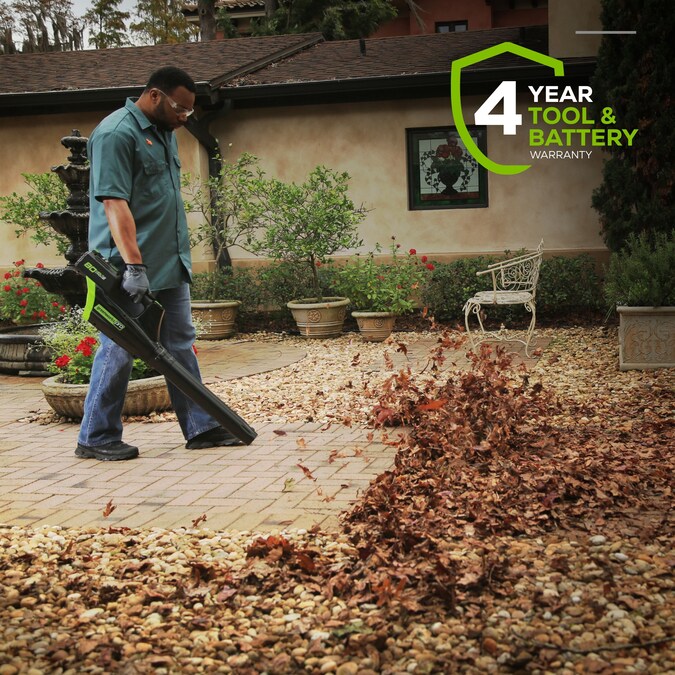 Meet the Greenworks 80V Max Brushless Leaf Blower, designed to make your outdoor cleanup effortless and economical whether you’re clearing dry or wet leaves from patios and porches, grass clippings from sidewalks or pathways, dirt, dust and more, With air speeds up to 150 MPH and air volume of 500 CFM, you can clear larger areas of debris and other obstructions. The Greenworks battery-powered leaf blower provides 60 minutes of operation, rapid 30-minute charge time, reduces hand strain during use and blows away gas leaf blowers in terms of performance, lower vibrations and quieter operations. Save money without the hassle of gasoline and oil purchases, product maintenance fees or increased energy consumption from electric leaf blowers. Our handheld leaf blower comes with a 4-year limited tool and battery warranty. Make your yard work quick, simple and easy with our powerful Greenworks 80V cordless leaf blower.