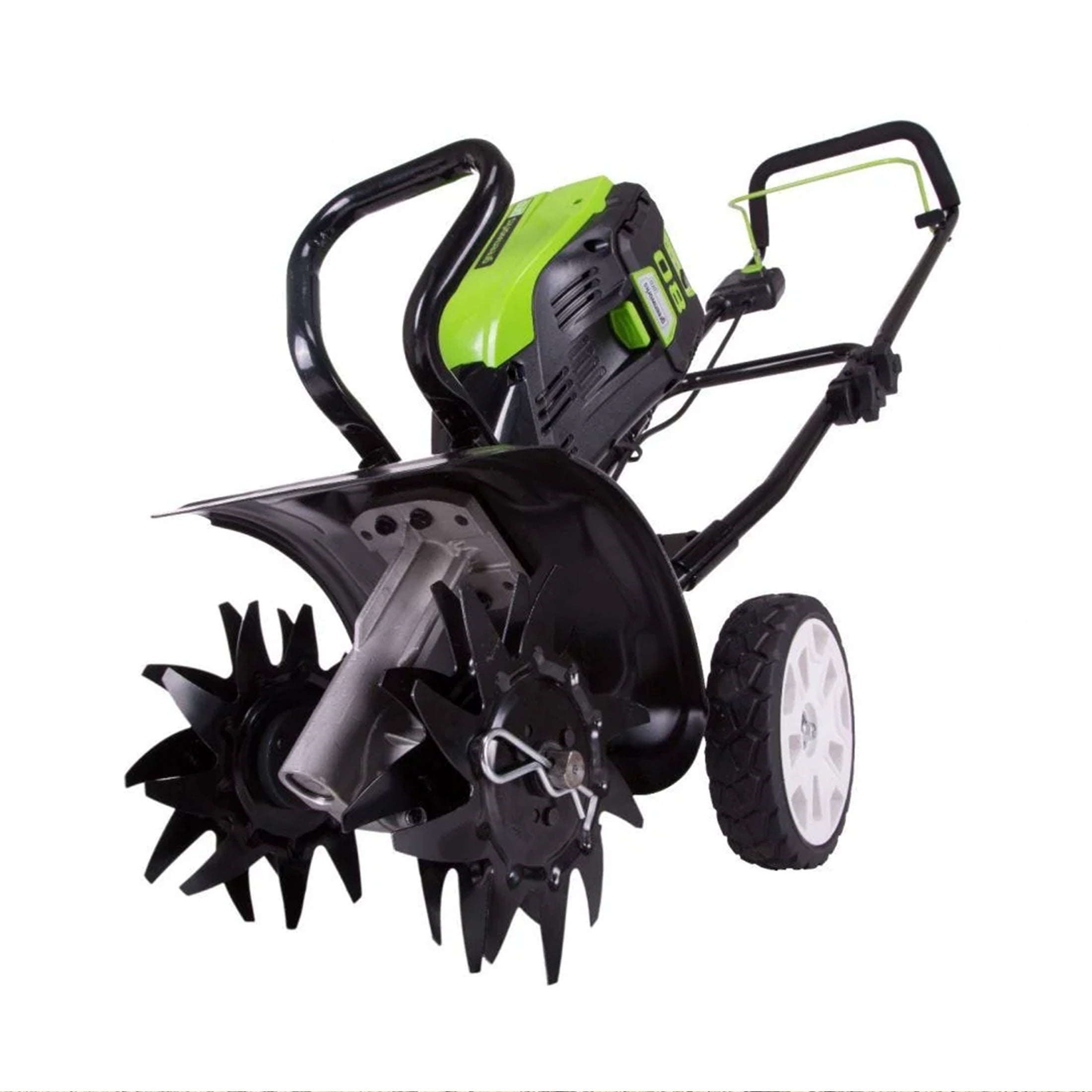 Greenworks 80V 10″ Brushless Cultivator/Tiller: Brushless motor for more torque, quiet operation, and longer life Hassle free push button start Features four forward rotating, removable and adjustable steel tines with a 10″ tilling width and a 5″ tilling depth Model: 2800302VT