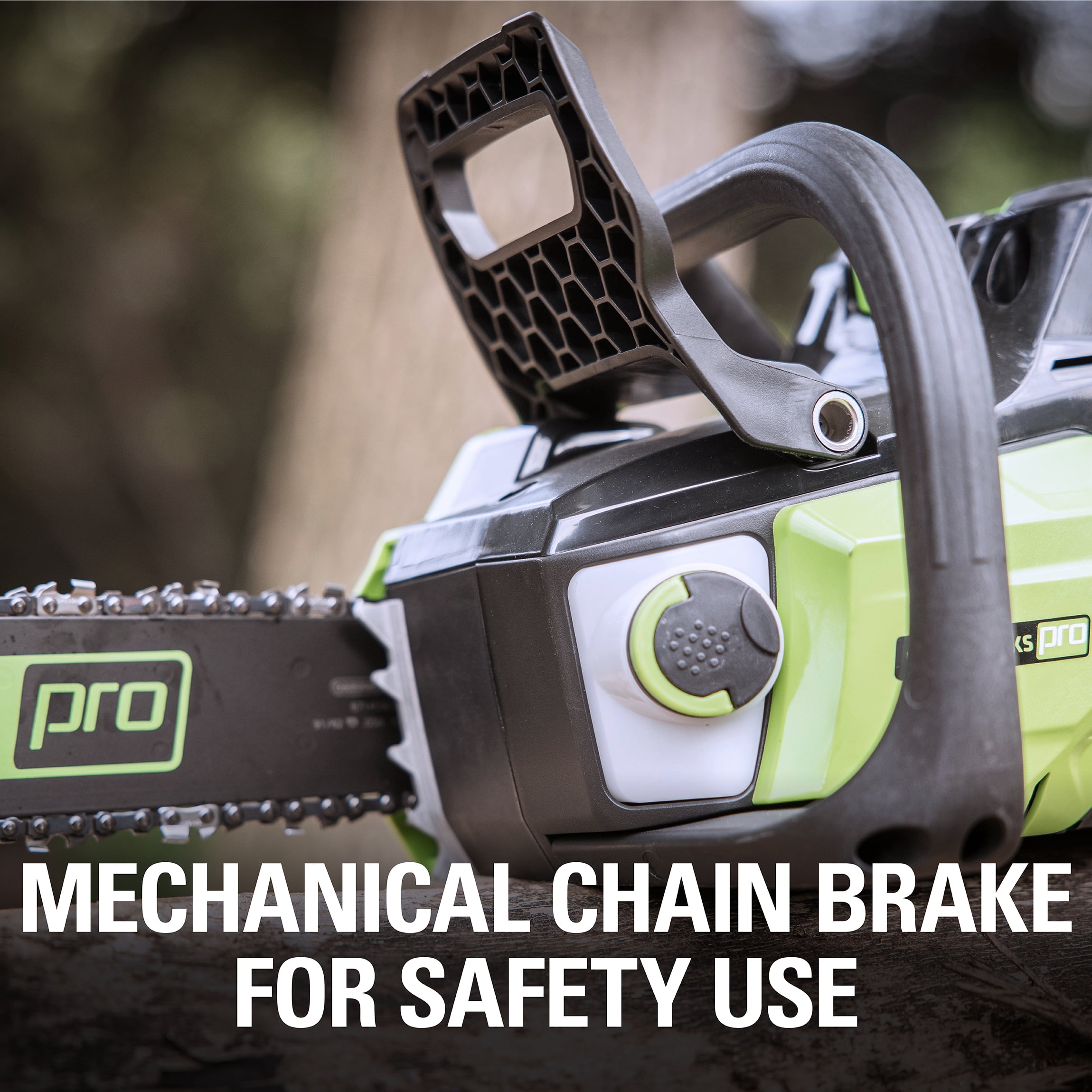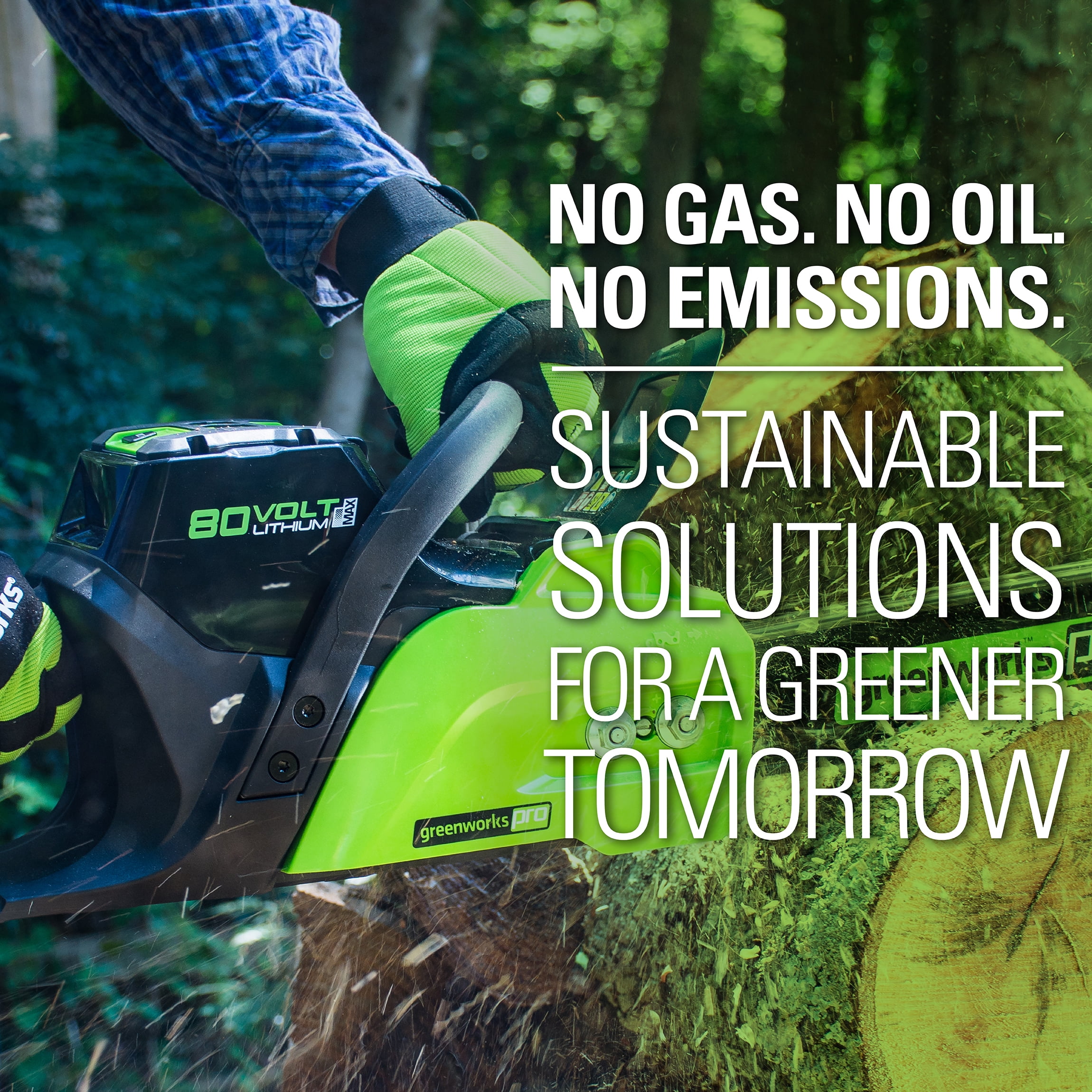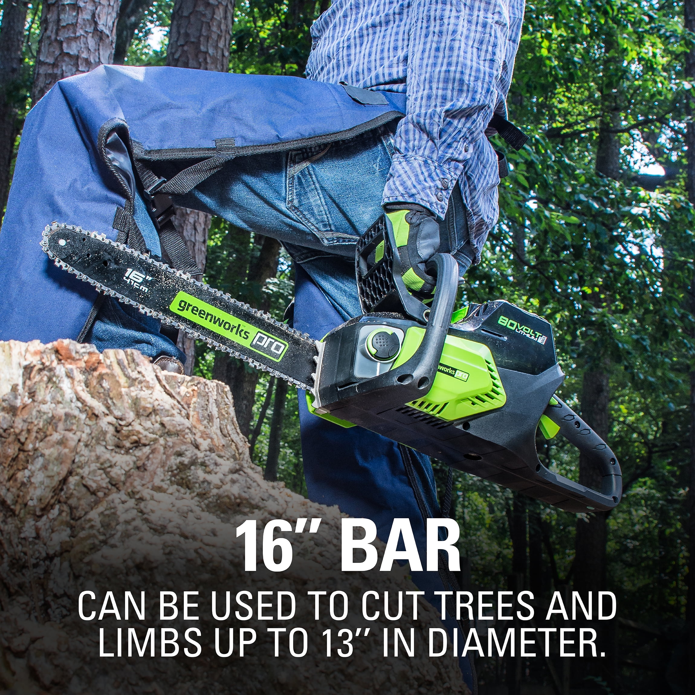 New Greenworks 80V 16″ Brushless Battery-Powered Chainsaw: Brushless motor provides more torque, quieter operation and longer life Steel bucking spikes and durable metal wrap around handle On-board chain tensioning tool Electronic chain brake for safe operation Automatic oiler applies oil to the bar & chain to ensure durability and extended life Translucent oil tank for a clear view of oil level What’s Included: (1) Greenworks 80V 16″ Brushless Chainsaw (1) Greenworks 80V 2.0Ah Battery (1) Greenworks Charger