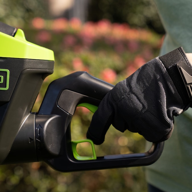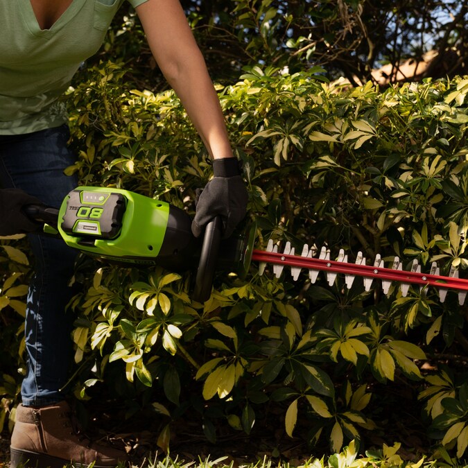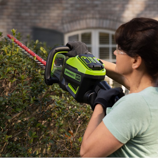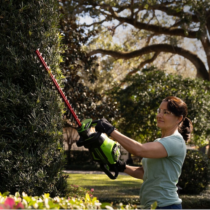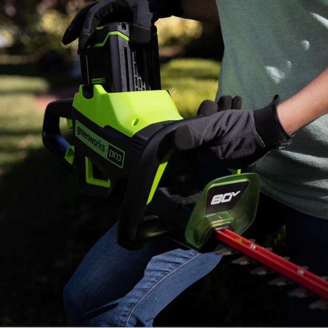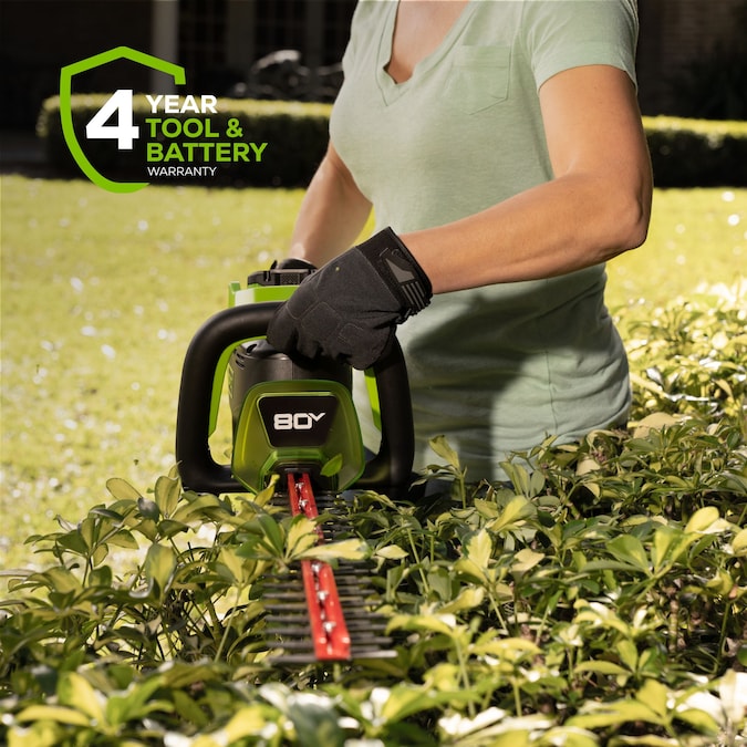 The Greenworks Pro 80V 26-in Hedge Trimmer provides best in class cutting performance, with 26-in dual action, laser cut, steel blades. This unit has a cutting speed of 3,200 strokes per minute for a faster, more efficient cut, leaving you with impressive results every time. The intelligent brushless motor maximizes efficiency by providing more power, torque, and longer life and the 180°rotating rear handle allows for precision cutting at any angle. Features an easy trigger start, lightweight design, and over-molded wrap-around handle for optimal comfort and control. The included battery powers 75+ Greenworks 80V products and the 80V platform comes with a 4-year limited warranty.