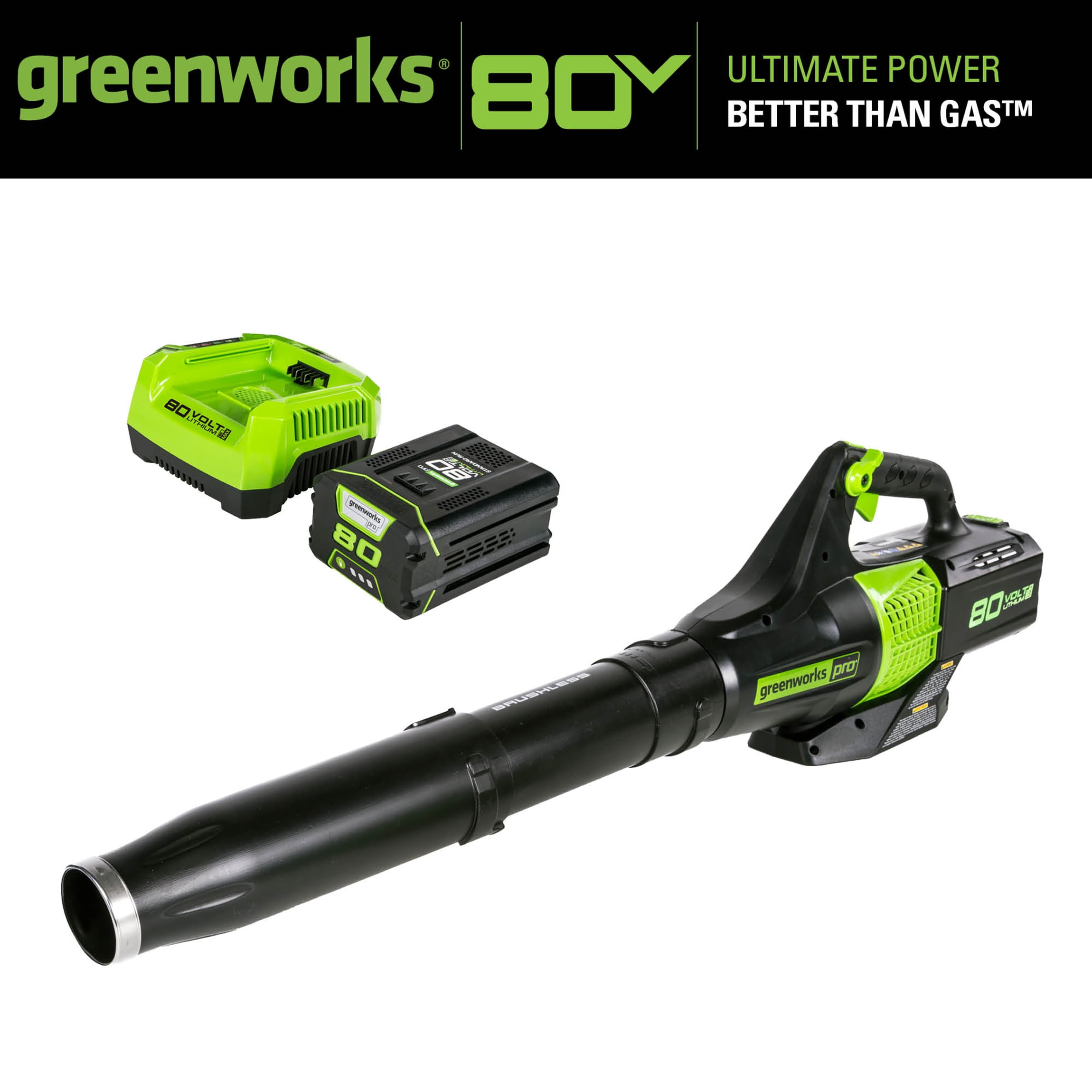 New Greenworks 80V Brushless Leaf Blower: Powerful brushless motor and turbo button provides 580 CFM at 145 MPH, quiet operation and longer life Finish your project with up to 19 minutes of runtime on high with a 2.5 Ah battery Reduced fatigue with comfort over mold grip, variable speed trigger and cruise control Quick charger provides full recharge in 40 minutes putting you back to work 4-year limited tool warranty protects your investment