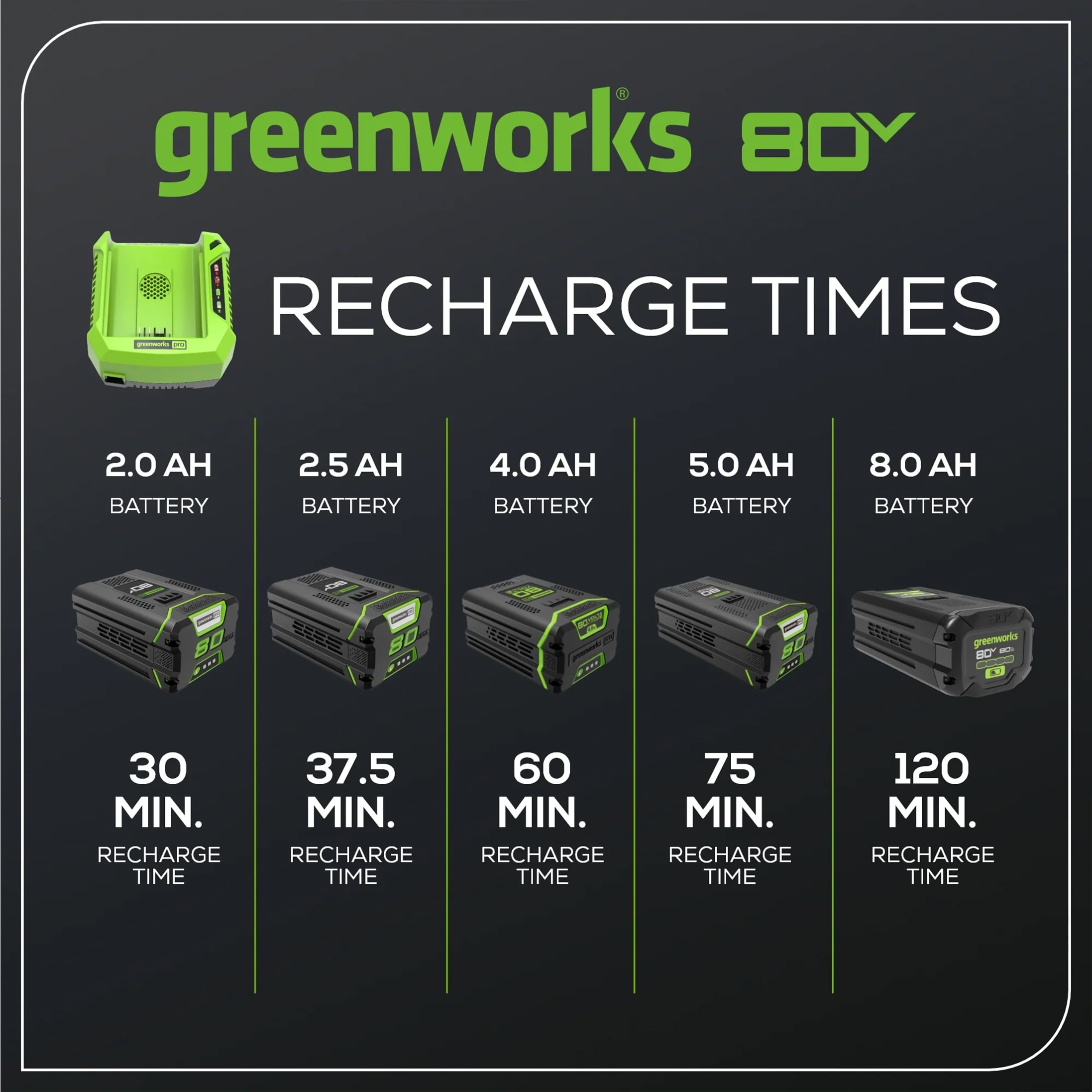 New Greenworks 80V Lithium Ion Single Port Rapid Battery Charger: Batteries Included: 0 Battery Type: Li-Ion Charging Ports: 1 Recharge Time: Charges 80V 2.0 Ah – 30 min. / 80V 2.5 Ah – 37.5 min. / 80V 4.0 Ah – 60 min. / 80V 5.0 Ah – 75 min. / 80V 8.0 Ah – 120 min. batteries Voltage: 80V