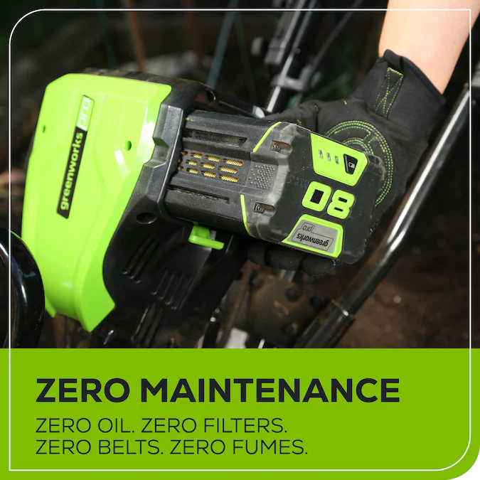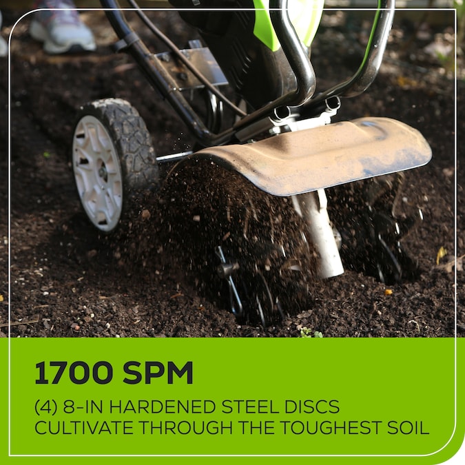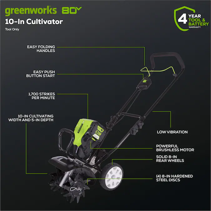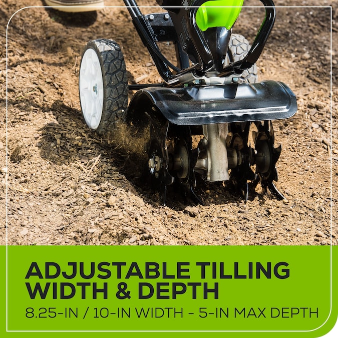 Spend less time working in your lawn or garden and more time enjoying the results with the Greenworks 80V 10-in. Tiller. It has no power cord and does not consume gas or oil, so you can focus on the task at hand in any corner of your property.