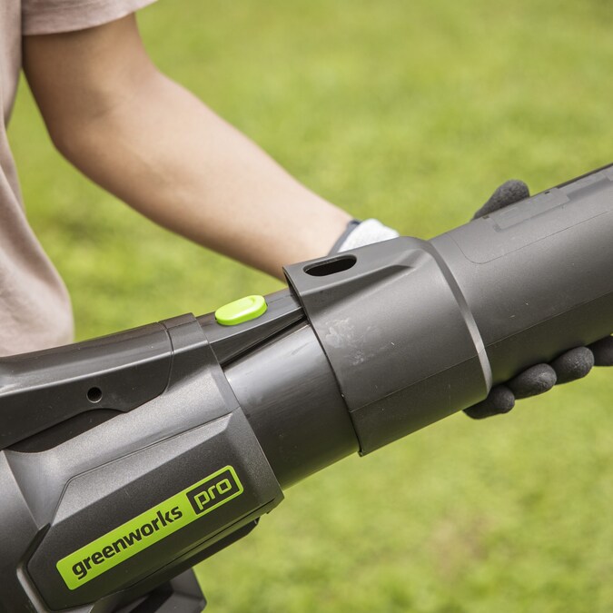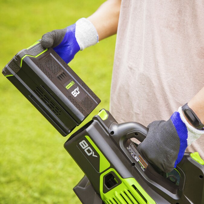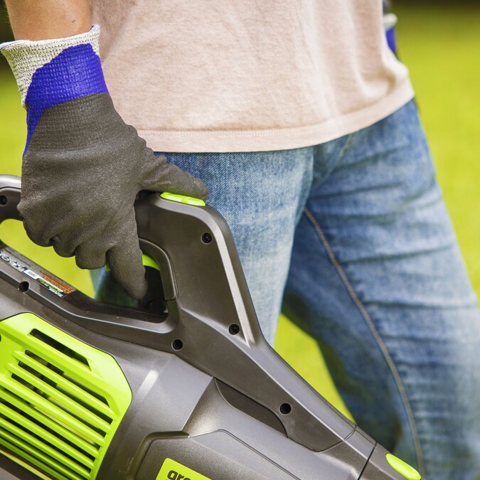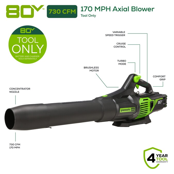 The Greenworks 80V Axial Handheld Leaf Blower with turbo mode, is the best tool for yard work cleanup designed for those who demand more power from their blowers. With 2x more torque, power and air speeds / volume up to 170 MPH and 730 CFM, you can clear patios, porches, pathways and sidewalks of leaves, grass, dirt, dust, debris and more. Our advanced brushless motor provides the performance of a 26-cc gas-powered blower with 60-minute runtime, 40-minute charge time, more control, reduced hand strain, lower vibrations and quieter operation to fine-tune any job. Save money without the hassle of gasoline and oil purchases, product maintenance fees or increased energy consumption caused by corded electric leaf blowers. The Greenworks handheld blower is backed by a 4-year limited tool and battery warranty.