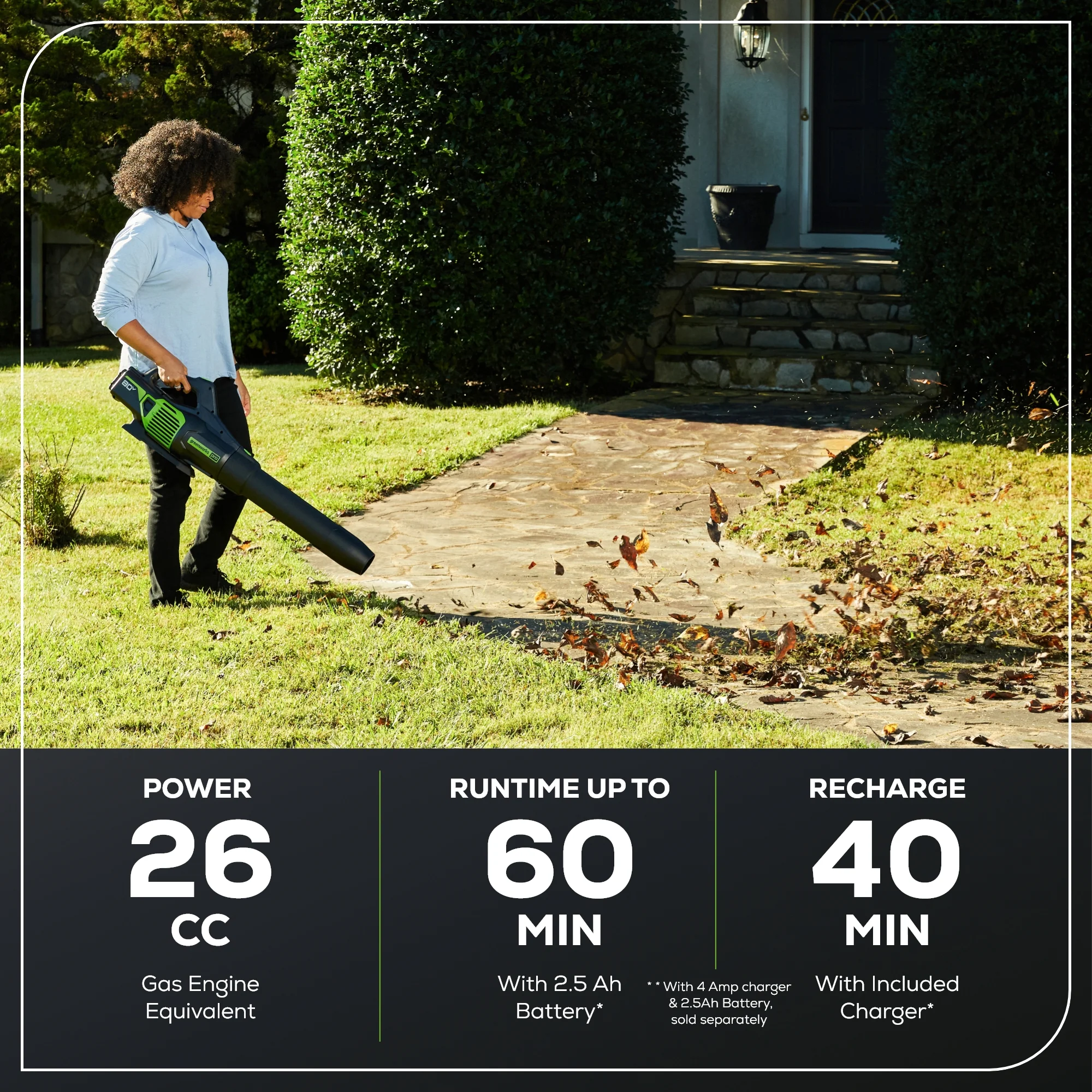 The new Greenworks Pro 80V Brushless Cordless Axial Blower is capable of high-velocity air speeds up to 170 MPH and airflow up to 730 CFM to easily handle the toughest blowing tasks like clearing wet & heavy leaves, grass, and other stubborn debris. The Greenworks lineup features over 50 high-performance Pro 80V tools, allowing you to ditch your gas tools for an innovative, eco-friendly alternative. Zero gas smell. Zero pull cords. Zero maintenance. Zero pollution breathed. Zero time wasted. When it comes to outdoor power equipment, Greenworks Pro puts the emphasis on power. We understand that Homeowners and Prosumers take on jobs of all sizes and need pro-grade products with long-lasting performance. The Greenworks Pro 80 Volt family of tools meet that challenge with our advanced lithium-ion technology included in each of our interchangeable batteries that work with each and every product throughout the line. Our high-efficiency brushless motors deliver Better than Gas™ performance – without the noise, mess and fumes that gas powered products produce. It all adds up to give you the line of outdoor power equipment you deserve.