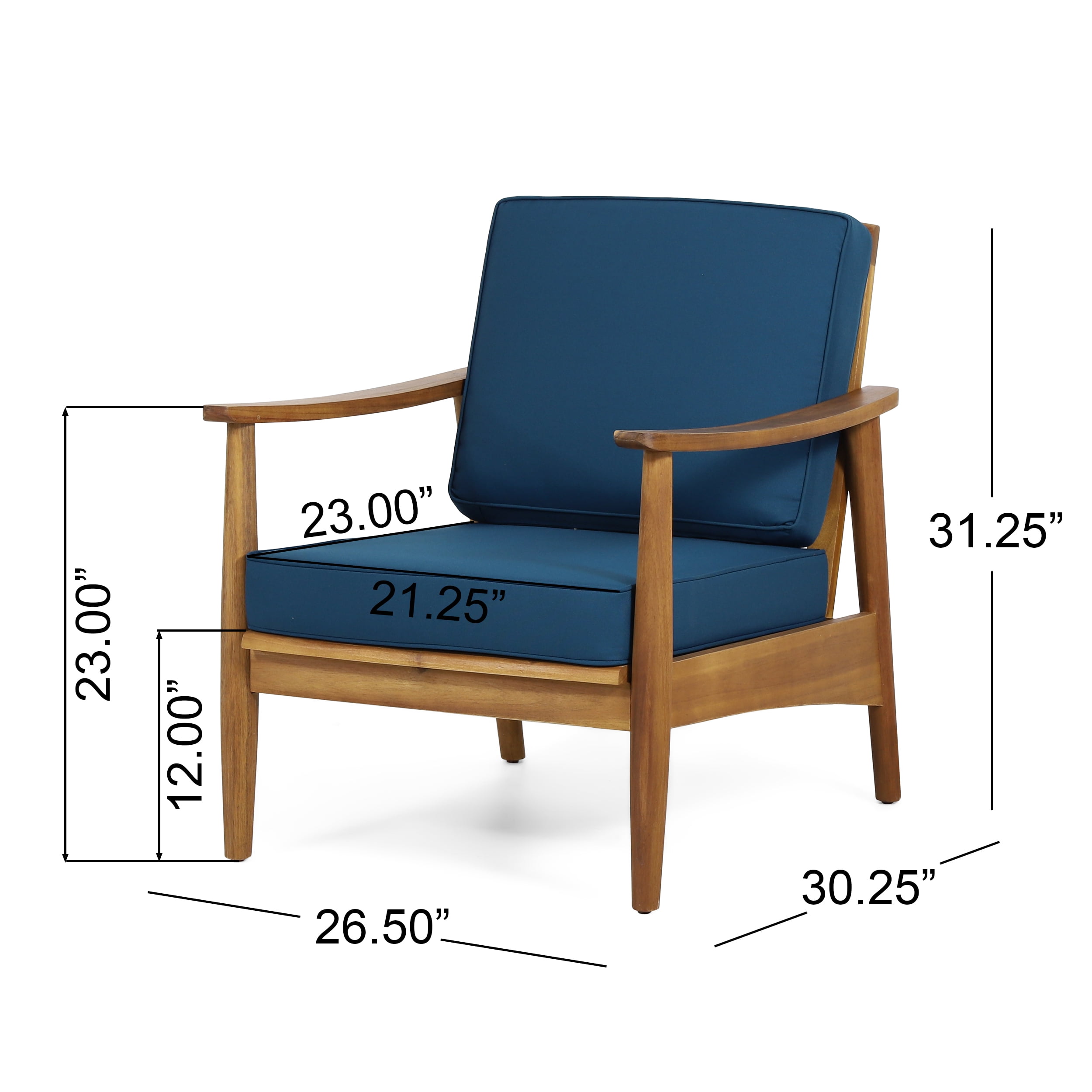 Includes: Two (2) Club Chairs Material: Acacia Wood Cushion Material: Water Resistant Fabric Cushion Composition: 100% Polyester Finish: Teak Cushion Color: Dark Teal Hand-Crafted Details Assembly Required Dimensions: 30.25 inches deep x 26.50 inches wide x 31.25 inches high Seat Dimensions: 23.00 inches deep x 21.25 inches wide x 12.00 inches high Arm Height: 23.00 inches